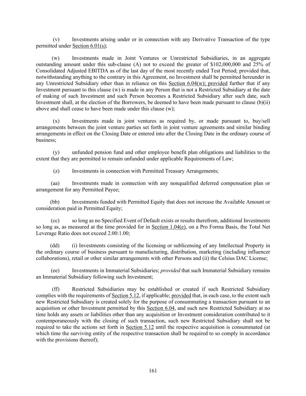 161 (v) Investments arising under or in connection with any Derivative Transaction of the type permitted under Section 6.01(s); (w) Investments made in Joint Ventures or Unrestricted Subsidiaries, in an aggregate outstanding amount under this sub-clause (A) not to exceed the greater of $102,000,000 and 25% of Consolidated Adjusted EBITDA as of the last day of the most recently ended Test Period; provided that, notwithstanding anything to the contrary in this Agreement, no Investment shall be permitted hereunder in any Unrestricted Subsidiary other than in reliance on this Section 6.04(w); provided further that if any Investment pursuant to this clause (w) is made in any Person that is not a Restricted Subsidiary at the date of making of such Investment and such Person becomes a Restricted Subsidiary after such date, such Investment shall, at the election of the Borrowers, be deemed to have been made pursuant to clause (b)(ii) above and shall cease to have been made under this clause (w); (x) Investments made in joint ventures as required by, or made pursuant to, buy/sell arrangements between the joint venture parties set forth in joint venture agreements and similar binding arrangements in effect on the Closing Date or entered into after the Closing Date in the ordinary course of business; (y) unfunded pension fund and other employee benefit plan obligations and liabilities to the extent that they are permitted to remain unfunded under applicable Requirements of Law; (z) Investments in connection with Permitted Treasury Arrangements; (aa) Investments made in connection with any nonqualified deferred compensation plan or arrangement for any Permitted Payee; (bb) Investments funded with Permitted Equity that does not increase the Available Amount or consideration paid in Permitted Equity; (cc) so long as no Specified Event of Default exists or results therefrom, additional Investments so long as, as measured at the time provided for in Section 1.04(e), on a Pro Forma Basis, the Total Net Leverage Ratio does not exceed 2.00:1.00; (dd) (i) Investments consisting of the licensing or sublicensing of any Intellectual Property in the ordinary course of business pursuant to manufacturing, distribution, marketing (including influencer collaborations), retail or other similar arrangements with other Persons and (ii) the Celsius DAC License; (ee) Investments in Immaterial Subsidiaries; provided that such Immaterial Subsidiary remains an Immaterial Subsidiary following such Investment; (ff) Restricted Subsidiaries may be established or created if such Restricted Subsidiary complies with the requirements of Section 5.12, if applicable; provided that, in each case, to the extent such new Restricted Subsidiary is created solely for the purpose of consummating a transaction pursuant to an acquisition or other Investment permitted by this Section 6.04, and such new Restricted Subsidiary at no time holds any assets or liabilities other than any acquisition or Investment consideration contributed to it contemporaneously with the closing of such transaction, such new Restricted Subsidiary shall not be required to take the actions set forth in Section 5.12 until the respective acquisition is consummated (at which time the surviving entity of the respective transaction shall be required to so comply in accordance with the provisions thereof);