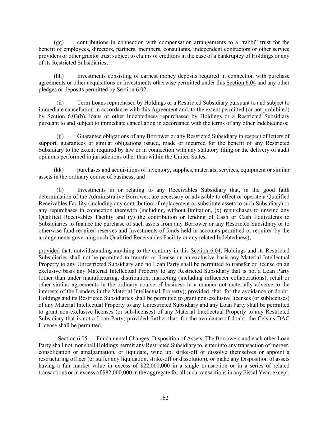162 (gg) contributions in connection with compensation arrangements to a “rabbi” trust for the benefit of employees, directors, partners, members, consultants, independent contractors or other service providers or other grantor trust subject to claims of creditors in the case of a bankruptcy of Holdings or any of its Restricted Subsidiaries; (hh) Investments consisting of earnest money deposits required in connection with purchase agreements or other acquisitions or Investments otherwise permitted under this Section 6.04 and any other pledges or deposits permitted by Section 6.02; (ii) Term Loans repurchased by Holdings or a Restricted Subsidiary pursuant to and subject to immediate cancellation in accordance with this Agreement and, to the extent permitted (or not prohibited) by Section 6.03(b), loans or other Indebtedness repurchased by Holdings or a Restricted Subsidiary pursuant to and subject to immediate cancellation in accordance with the terms of any other Indebtedness; (jj) Guarantee obligations of any Borrower or any Restricted Subsidiary in respect of letters of support, guarantees or similar obligations issued, made or incurred for the benefit of any Restricted Subsidiary to the extent required by law or in connection with any statutory filing or the delivery of audit opinions performed in jurisdictions other than within the United States; (kk) purchases and acquisitions of inventory, supplies, materials, services, equipment or similar assets in the ordinary course of business; and (ll) Investments in or relating to any Receivables Subsidiary that, in the good faith determination of the Administrative Borrower, are necessary or advisable to effect or operate a Qualified Receivables Facility (including any contribution of replacement or substitute assets to such Subsidiary) or any repurchases in connection therewith (including, without limitation, (x) repurchases to unwind any Qualified Receivables Facility and (y) the contribution or lending of Cash or Cash Equivalents to Subsidiaries to finance the purchase of such assets from any Borrower or any Restricted Subsidiary or to otherwise fund required reserves and Investments of funds held in accounts permitted or required by the arrangements governing such Qualified Receivables Facility or any related Indebtedness); provided that, notwithstanding anything to the contrary in this Section 6.04, Holdings and its Restricted Subsidiaries shall not be permitted to transfer or license on an exclusive basis any Material Intellectual Property to any Unrestricted Subsidiary and no Loan Party shall be permitted to transfer or license on an exclusive basis any Material Intellectual Property to any Restricted Subsidiary that is not a Loan Party (other than under manufacturing, distribution, marketing (including influencer collaborations), retail or other similar agreements in the ordinary course of business in a manner not materially adverse to the interests of the Lenders in the Material Intellectual Property); provided, that, for the avoidance of doubt, Holdings and its Restricted Subsidiaries shall be permitted to grant non-exclusive licenses (or sublicenses) of any Material Intellectual Property to any Unrestricted Subsidiary and any Loan Party shall be permitted to grant non-exclusive licenses (or sub-licenses) of any Material Intellectual Property to any Restricted Subsidiary that is not a Loan Party; provided further that, for the avoidance of doubt, the Celsius DAC License shall be permitted. Section 6.05. Fundamental Changes; Disposition of Assets. The Borrowers and each other Loan Party shall not, nor shall Holdings permit any Restricted Subsidiary to, enter into any transaction of merger, consolidation or amalgamation, or liquidate, wind up, strike-off or dissolve themselves or appoint a restructuring officer (or suffer any liquidation, strike-off or dissolution), or make any Disposition of assets having a fair market value in excess of $22,000,000 in a single transaction or in a series of related transactions or in excess of $82,000,000 in the aggregate for all such transactions in any Fiscal Year, except:
