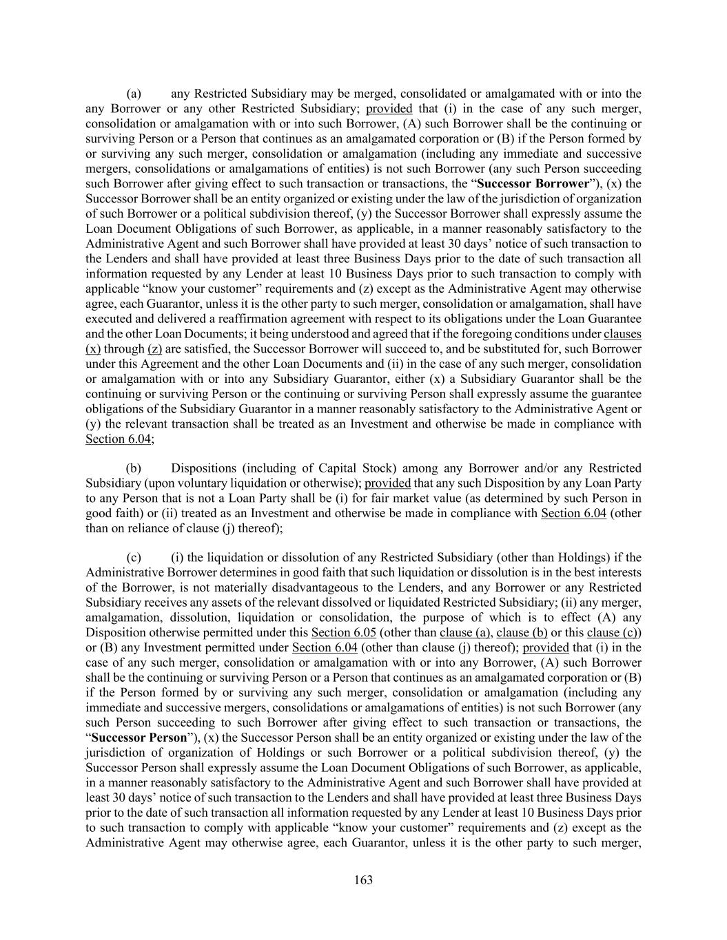 163 (a) any Restricted Subsidiary may be merged, consolidated or amalgamated with or into the any Borrower or any other Restricted Subsidiary; provided that (i) in the case of any such merger, consolidation or amalgamation with or into such Borrower, (A) such Borrower shall be the continuing or surviving Person or a Person that continues as an amalgamated corporation or (B) if the Person formed by or surviving any such merger, consolidation or amalgamation (including any immediate and successive mergers, consolidations or amalgamations of entities) is not such Borrower (any such Person succeeding such Borrower after giving effect to such transaction or transactions, the “Successor Borrower”), (x) the Successor Borrower shall be an entity organized or existing under the law of the jurisdiction of organization of such Borrower or a political subdivision thereof, (y) the Successor Borrower shall expressly assume the Loan Document Obligations of such Borrower, as applicable, in a manner reasonably satisfactory to the Administrative Agent and such Borrower shall have provided at least 30 days’ notice of such transaction to the Lenders and shall have provided at least three Business Days prior to the date of such transaction all information requested by any Lender at least 10 Business Days prior to such transaction to comply with applicable “know your customer” requirements and (z) except as the Administrative Agent may otherwise agree, each Guarantor, unless it is the other party to such merger, consolidation or amalgamation, shall have executed and delivered a reaffirmation agreement with respect to its obligations under the Loan Guarantee and the other Loan Documents; it being understood and agreed that if the foregoing conditions under clauses (x) through (z) are satisfied, the Successor Borrower will succeed to, and be substituted for, such Borrower under this Agreement and the other Loan Documents and (ii) in the case of any such merger, consolidation or amalgamation with or into any Subsidiary Guarantor, either (x) a Subsidiary Guarantor shall be the continuing or surviving Person or the continuing or surviving Person shall expressly assume the guarantee obligations of the Subsidiary Guarantor in a manner reasonably satisfactory to the Administrative Agent or (y) the relevant transaction shall be treated as an Investment and otherwise be made in compliance with Section 6.04; (b) Dispositions (including of Capital Stock) among any Borrower and/or any Restricted Subsidiary (upon voluntary liquidation or otherwise); provided that any such Disposition by any Loan Party to any Person that is not a Loan Party shall be (i) for fair market value (as determined by such Person in good faith) or (ii) treated as an Investment and otherwise be made in compliance with Section 6.04 (other than on reliance of clause (j) thereof); (c) (i) the liquidation or dissolution of any Restricted Subsidiary (other than Holdings) if the Administrative Borrower determines in good faith that such liquidation or dissolution is in the best interests of the Borrower, is not materially disadvantageous to the Lenders, and any Borrower or any Restricted Subsidiary receives any assets of the relevant dissolved or liquidated Restricted Subsidiary; (ii) any merger, amalgamation, dissolution, liquidation or consolidation, the purpose of which is to effect (A) any Disposition otherwise permitted under this Section 6.05 (other than clause (a), clause (b) or this clause (c)) or (B) any Investment permitted under Section 6.04 (other than clause (j) thereof); provided that (i) in the case of any such merger, consolidation or amalgamation with or into any Borrower, (A) such Borrower shall be the continuing or surviving Person or a Person that continues as an amalgamated corporation or (B) if the Person formed by or surviving any such merger, consolidation or amalgamation (including any immediate and successive mergers, consolidations or amalgamations of entities) is not such Borrower (any such Person succeeding to such Borrower after giving effect to such transaction or transactions, the “Successor Person”), (x) the Successor Person shall be an entity organized or existing under the law of the jurisdiction of organization of Holdings or such Borrower or a political subdivision thereof, (y) the Successor Person shall expressly assume the Loan Document Obligations of such Borrower, as applicable, in a manner reasonably satisfactory to the Administrative Agent and such Borrower shall have provided at least 30 days’ notice of such transaction to the Lenders and shall have provided at least three Business Days prior to the date of such transaction all information requested by any Lender at least 10 Business Days prior to such transaction to comply with applicable “know your customer” requirements and (z) except as the Administrative Agent may otherwise agree, each Guarantor, unless it is the other party to such merger,