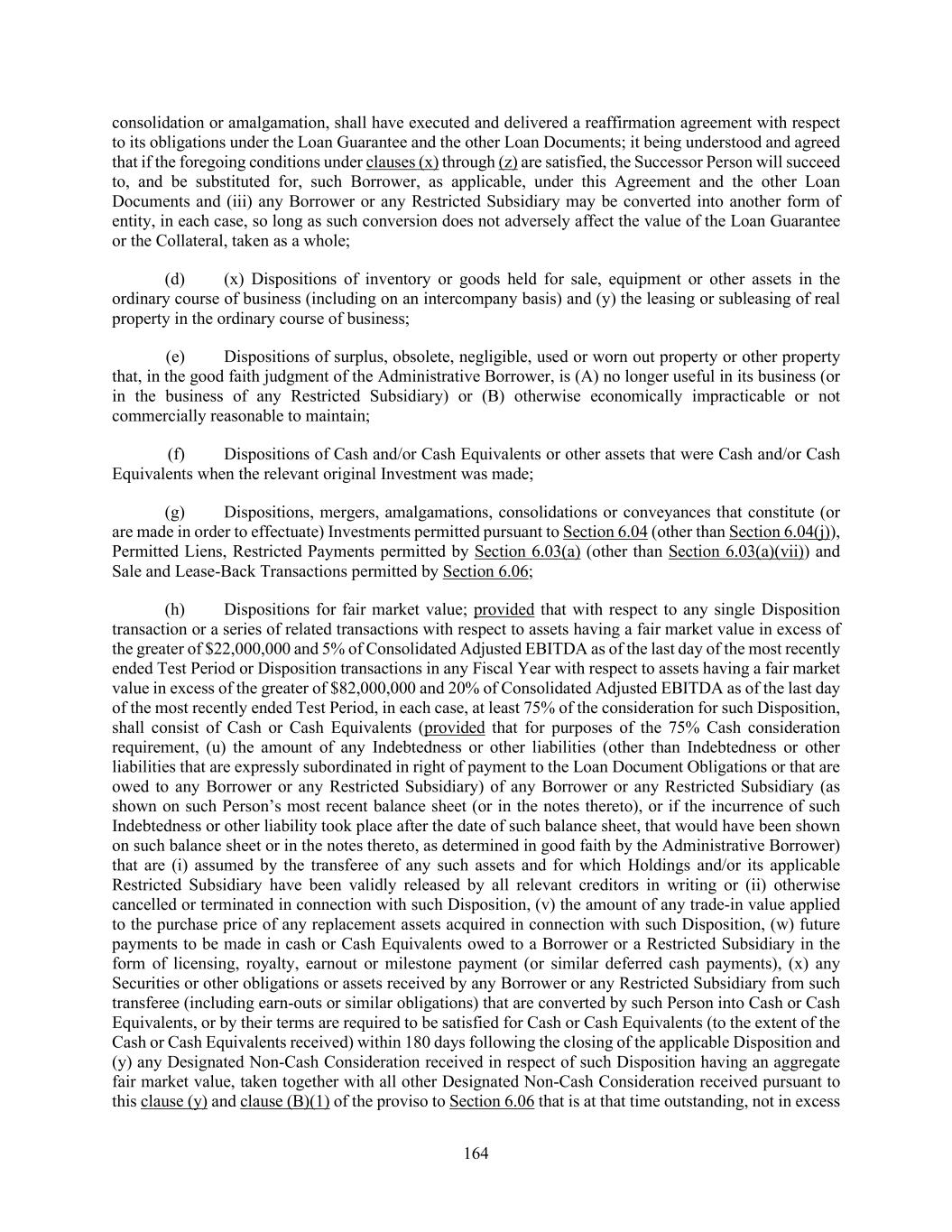 164 consolidation or amalgamation, shall have executed and delivered a reaffirmation agreement with respect to its obligations under the Loan Guarantee and the other Loan Documents; it being understood and agreed that if the foregoing conditions under clauses (x) through (z) are satisfied, the Successor Person will succeed to, and be substituted for, such Borrower, as applicable, under this Agreement and the other Loan Documents and (iii) any Borrower or any Restricted Subsidiary may be converted into another form of entity, in each case, so long as such conversion does not adversely affect the value of the Loan Guarantee or the Collateral, taken as a whole; (d) (x) Dispositions of inventory or goods held for sale, equipment or other assets in the ordinary course of business (including on an intercompany basis) and (y) the leasing or subleasing of real property in the ordinary course of business; (e) Dispositions of surplus, obsolete, negligible, used or worn out property or other property that, in the good faith judgment of the Administrative Borrower, is (A) no longer useful in its business (or in the business of any Restricted Subsidiary) or (B) otherwise economically impracticable or not commercially reasonable to maintain; (f) Dispositions of Cash and/or Cash Equivalents or other assets that were Cash and/or Cash Equivalents when the relevant original Investment was made; (g) Dispositions, mergers, amalgamations, consolidations or conveyances that constitute (or are made in order to effectuate) Investments permitted pursuant to Section 6.04 (other than Section 6.04(j)), Permitted Liens, Restricted Payments permitted by Section 6.03(a) (other than Section 6.03(a)(vii)) and Sale and Lease-Back Transactions permitted by Section 6.06; (h) Dispositions for fair market value; provided that with respect to any single Disposition transaction or a series of related transactions with respect to assets having a fair market value in excess of the greater of $22,000,000 and 5% of Consolidated Adjusted EBITDA as of the last day of the most recently ended Test Period or Disposition transactions in any Fiscal Year with respect to assets having a fair market value in excess of the greater of $82,000,000 and 20% of Consolidated Adjusted EBITDA as of the last day of the most recently ended Test Period, in each case, at least 75% of the consideration for such Disposition, shall consist of Cash or Cash Equivalents (provided that for purposes of the 75% Cash consideration requirement, (u) the amount of any Indebtedness or other liabilities (other than Indebtedness or other liabilities that are expressly subordinated in right of payment to the Loan Document Obligations or that are owed to any Borrower or any Restricted Subsidiary) of any Borrower or any Restricted Subsidiary (as shown on such Person’s most recent balance sheet (or in the notes thereto), or if the incurrence of such Indebtedness or other liability took place after the date of such balance sheet, that would have been shown on such balance sheet or in the notes thereto, as determined in good faith by the Administrative Borrower) that are (i) assumed by the transferee of any such assets and for which Holdings and/or its applicable Restricted Subsidiary have been validly released by all relevant creditors in writing or (ii) otherwise cancelled or terminated in connection with such Disposition, (v) the amount of any trade-in value applied to the purchase price of any replacement assets acquired in connection with such Disposition, (w) future payments to be made in cash or Cash Equivalents owed to a Borrower or a Restricted Subsidiary in the form of licensing, royalty, earnout or milestone payment (or similar deferred cash payments), (x) any Securities or other obligations or assets received by any Borrower or any Restricted Subsidiary from such transferee (including earn-outs or similar obligations) that are converted by such Person into Cash or Cash Equivalents, or by their terms are required to be satisfied for Cash or Cash Equivalents (to the extent of the Cash or Cash Equivalents received) within 180 days following the closing of the applicable Disposition and (y) any Designated Non-Cash Consideration received in respect of such Disposition having an aggregate fair market value, taken together with all other Designated Non-Cash Consideration received pursuant to this clause (y) and clause (B)(1) of the proviso to Section 6.06 that is at that time outstanding, not in excess