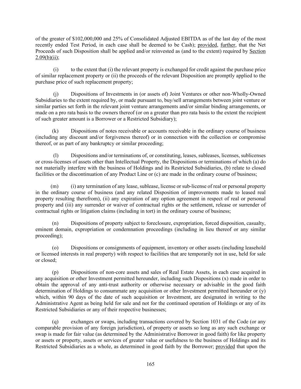 165 of the greater of $102,000,000 and 25% of Consolidated Adjusted EBITDA as of the last day of the most recently ended Test Period, in each case shall be deemed to be Cash); provided, further, that the Net Proceeds of such Disposition shall be applied and/or reinvested as (and to the extent) required by Section 2.09(b)(ii); (i) to the extent that (i) the relevant property is exchanged for credit against the purchase price of similar replacement property or (ii) the proceeds of the relevant Disposition are promptly applied to the purchase price of such replacement property; (j) Dispositions of Investments in (or assets of) Joint Ventures or other non-Wholly-Owned Subsidiaries to the extent required by, or made pursuant to, buy/sell arrangements between joint venture or similar parties set forth in the relevant joint venture arrangements and/or similar binding arrangements, or made on a pro rata basis to the owners thereof (or on a greater than pro rata basis to the extent the recipient of such greater amount is a Borrower or a Restricted Subsidiary); (k) Dispositions of notes receivable or accounts receivable in the ordinary course of business (including any discount and/or forgiveness thereof) or in connection with the collection or compromise thereof, or as part of any bankruptcy or similar proceeding; (l) Dispositions and/or terminations of, or constituting, leases, subleases, licenses, sublicenses or cross-licenses of assets other than Intellectual Property, the Dispositions or terminations of which (a) do not materially interfere with the business of Holdings and its Restricted Subsidiaries, (b) relate to closed facilities or the discontinuation of any Product Line or (c) are made in the ordinary course of business; (m) (i) any termination of any lease, sublease, license or sub-license of real or personal property in the ordinary course of business (and any related Disposition of improvements made to leased real property resulting therefrom), (ii) any expiration of any option agreement in respect of real or personal property and (iii) any surrender or waiver of contractual rights or the settlement, release or surrender of contractual rights or litigation claims (including in tort) in the ordinary course of business; (n) Dispositions of property subject to foreclosure, expropriation, forced disposition, casualty, eminent domain, expropriation or condemnation proceedings (including in lieu thereof or any similar proceeding); (o) Dispositions or consignments of equipment, inventory or other assets (including leasehold or licensed interests in real property) with respect to facilities that are temporarily not in use, held for sale or closed; (p) Dispositions of non-core assets and sales of Real Estate Assets, in each case acquired in any acquisition or other Investment permitted hereunder, including such Dispositions (x) made in order to obtain the approval of any anti-trust authority or otherwise necessary or advisable in the good faith determination of Holdings to consummate any acquisition or other Investment permitted hereunder or (y) which, within 90 days of the date of such acquisition or Investment, are designated in writing to the Administrative Agent as being held for sale and not for the continued operation of Holdings or any of its Restricted Subsidiaries or any of their respective businesses; (q) exchanges or swaps, including transactions covered by Section 1031 of the Code (or any comparable provision of any foreign jurisdiction), of property or assets so long as any such exchange or swap is made for fair value (as determined by the Administrative Borrower in good faith) for like property or assets or property, assets or services of greater value or usefulness to the business of Holdings and its Restricted Subsidiaries as a whole, as determined in good faith by the Borrower; provided that upon the