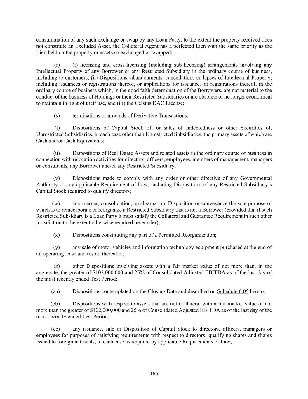 166 consummation of any such exchange or swap by any Loan Party, to the extent the property received does not constitute an Excluded Asset, the Collateral Agent has a perfected Lien with the same priority as the Lien held on the property or assets so exchanged or swapped; (r) (i) licensing and cross-licensing (including sub-licensing) arrangements involving any Intellectual Property of any Borrower or any Restricted Subsidiary in the ordinary course of business, including to customers, (ii) Dispositions, abandonments, cancellations or lapses of Intellectual Property, including issuances or registrations thereof, or applications for issuances or registrations thereof, in the ordinary course of business which, in the good faith determination of the Borrowers, are not material to the conduct of the business of Holdings or their Restricted Subsidiaries or are obsolete or no longer economical to maintain in light of their use, and (iii) the Celsius DAC License; (s) terminations or unwinds of Derivative Transactions; (t) Dispositions of Capital Stock of, or sales of Indebtedness or other Securities of, Unrestricted Subsidiaries, in each case other than Unrestricted Subsidiaries, the primary assets of which are Cash and/or Cash Equivalents; (u) Dispositions of Real Estate Assets and related assets in the ordinary course of business in connection with relocation activities for directors, officers, employees, members of management, managers or consultants, any Borrower and/or any Restricted Subsidiary; (v) Dispositions made to comply with any order or other directive of any Governmental Authority or any applicable Requirement of Law, including Dispositions of any Restricted Subsidiary’s Capital Stock required to qualify directors; (w) any merger, consolidation, amalgamation, Disposition or conveyance the sole purpose of which is to reincorporate or reorganize a Restricted Subsidiary that is not a Borrower (provided that if such Restricted Subsidiary is a Loan Party it must satisfy the Collateral and Guarantee Requirement in such other jurisdiction to the extent otherwise required hereunder); (x) Dispositions constituting any part of a Permitted Reorganization; (y) any sale of motor vehicles and information technology equipment purchased at the end of an operating lease and resold thereafter; (z) other Dispositions involving assets with a fair market value of not more than, in the aggregate, the greater of $102,000,000 and 25% of Consolidated Adjusted EBITDA as of the last day of the most recently ended Test Period; (aa) Dispositions contemplated on the Closing Date and described on Schedule 6.05 hereto; (bb) Dispositions with respect to assets that are not Collateral with a fair market value of not more than the greater of $102,000,000 and 25% of Consolidated Adjusted EBITDA as of the last day of the most recently ended Test Period; (cc) any issuance, sale or Disposition of Capital Stock to directors, officers, managers or employees for purposes of satisfying requirements with respect to directors’ qualifying shares and shares issued to foreign nationals, in each case as required by applicable Requirements of Law;