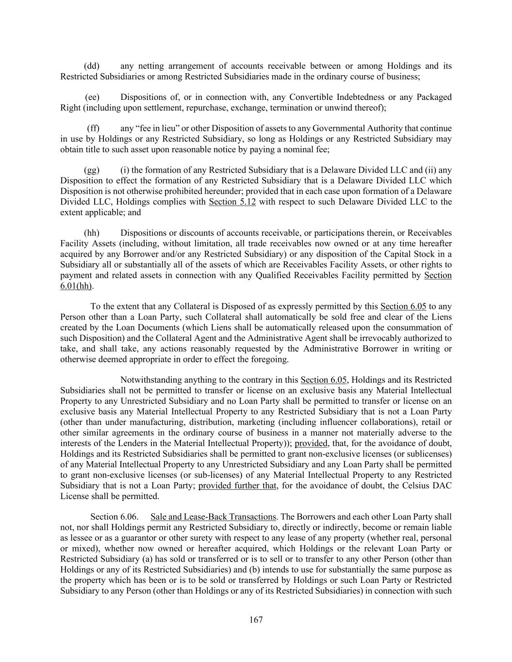167 (dd) any netting arrangement of accounts receivable between or among Holdings and its Restricted Subsidiaries or among Restricted Subsidiaries made in the ordinary course of business; (ee) Dispositions of, or in connection with, any Convertible Indebtedness or any Packaged Right (including upon settlement, repurchase, exchange, termination or unwind thereof); (ff) any “fee in lieu” or other Disposition of assets to any Governmental Authority that continue in use by Holdings or any Restricted Subsidiary, so long as Holdings or any Restricted Subsidiary may obtain title to such asset upon reasonable notice by paying a nominal fee; (gg) (i) the formation of any Restricted Subsidiary that is a Delaware Divided LLC and (ii) any Disposition to effect the formation of any Restricted Subsidiary that is a Delaware Divided LLC which Disposition is not otherwise prohibited hereunder; provided that in each case upon formation of a Delaware Divided LLC, Holdings complies with Section 5.12 with respect to such Delaware Divided LLC to the extent applicable; and (hh) Dispositions or discounts of accounts receivable, or participations therein, or Receivables Facility Assets (including, without limitation, all trade receivables now owned or at any time hereafter acquired by any Borrower and/or any Restricted Subsidiary) or any disposition of the Capital Stock in a Subsidiary all or substantially all of the assets of which are Receivables Facility Assets, or other rights to payment and related assets in connection with any Qualified Receivables Facility permitted by Section 6.01(hh). To the extent that any Collateral is Disposed of as expressly permitted by this Section 6.05 to any Person other than a Loan Party, such Collateral shall automatically be sold free and clear of the Liens created by the Loan Documents (which Liens shall be automatically released upon the consummation of such Disposition) and the Collateral Agent and the Administrative Agent shall be irrevocably authorized to take, and shall take, any actions reasonably requested by the Administrative Borrower in writing or otherwise deemed appropriate in order to effect the foregoing. Notwithstanding anything to the contrary in this Section 6.05, Holdings and its Restricted Subsidiaries shall not be permitted to transfer or license on an exclusive basis any Material Intellectual Property to any Unrestricted Subsidiary and no Loan Party shall be permitted to transfer or license on an exclusive basis any Material Intellectual Property to any Restricted Subsidiary that is not a Loan Party (other than under manufacturing, distribution, marketing (including influencer collaborations), retail or other similar agreements in the ordinary course of business in a manner not materially adverse to the interests of the Lenders in the Material Intellectual Property)); provided, that, for the avoidance of doubt, Holdings and its Restricted Subsidiaries shall be permitted to grant non-exclusive licenses (or sublicenses) of any Material Intellectual Property to any Unrestricted Subsidiary and any Loan Party shall be permitted to grant non-exclusive licenses (or sub-licenses) of any Material Intellectual Property to any Restricted Subsidiary that is not a Loan Party; provided further that, for the avoidance of doubt, the Celsius DAC License shall be permitted. Section 6.06. Sale and Lease-Back Transactions. The Borrowers and each other Loan Party shall not, nor shall Holdings permit any Restricted Subsidiary to, directly or indirectly, become or remain liable as lessee or as a guarantor or other surety with respect to any lease of any property (whether real, personal or mixed), whether now owned or hereafter acquired, which Holdings or the relevant Loan Party or Restricted Subsidiary (a) has sold or transferred or is to sell or to transfer to any other Person (other than Holdings or any of its Restricted Subsidiaries) and (b) intends to use for substantially the same purpose as the property which has been or is to be sold or transferred by Holdings or such Loan Party or Restricted Subsidiary to any Person (other than Holdings or any of its Restricted Subsidiaries) in connection with such