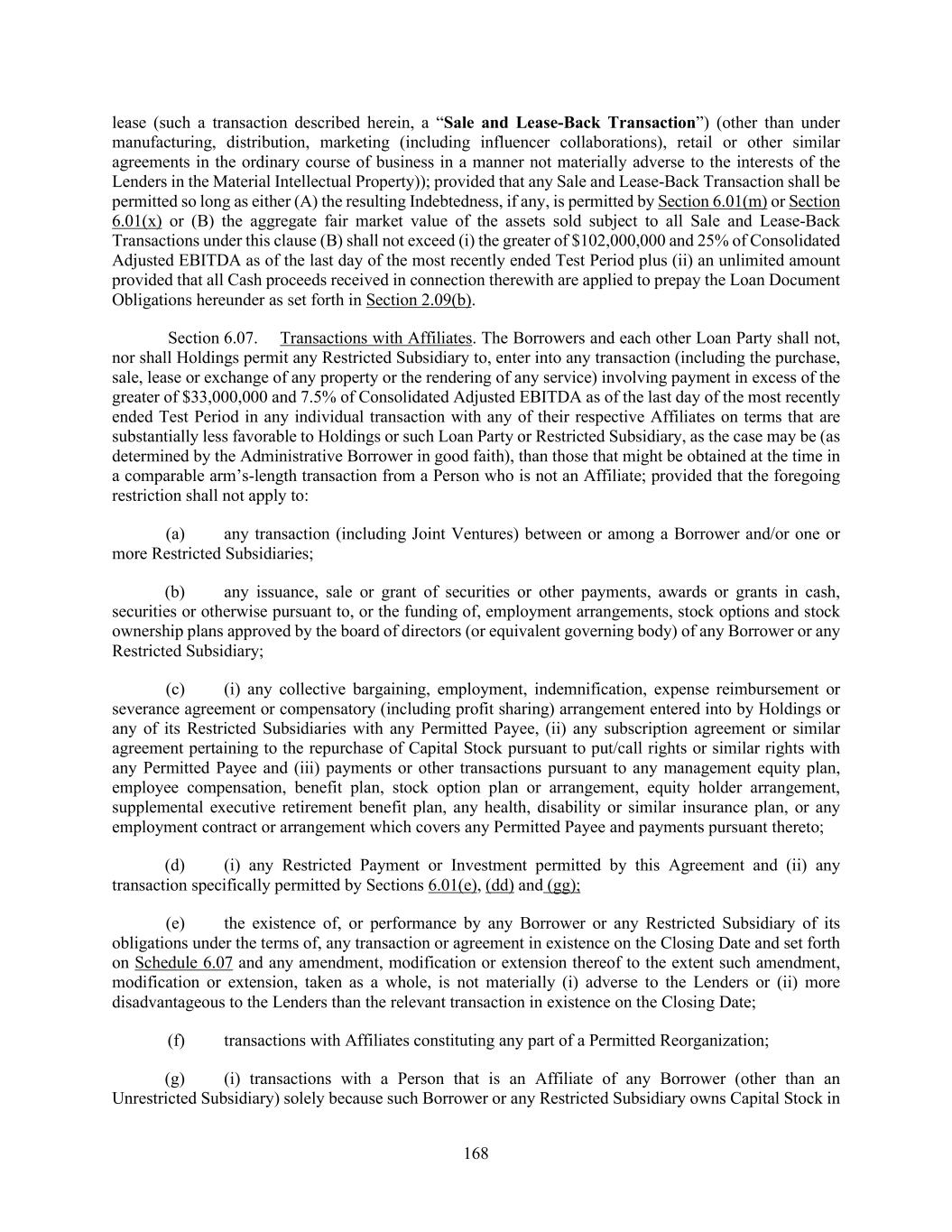 168 lease (such a transaction described herein, a “Sale and Lease-Back Transaction”) (other than under manufacturing, distribution, marketing (including influencer collaborations), retail or other similar agreements in the ordinary course of business in a manner not materially adverse to the interests of the Lenders in the Material Intellectual Property)); provided that any Sale and Lease-Back Transaction shall be permitted so long as either (A) the resulting Indebtedness, if any, is permitted by Section 6.01(m) or Section 6.01(x) or (B) the aggregate fair market value of the assets sold subject to all Sale and Lease-Back Transactions under this clause (B) shall not exceed (i) the greater of $102,000,000 and 25% of Consolidated Adjusted EBITDA as of the last day of the most recently ended Test Period plus (ii) an unlimited amount provided that all Cash proceeds received in connection therewith are applied to prepay the Loan Document Obligations hereunder as set forth in Section 2.09(b). Section 6.07. Transactions with Affiliates. The Borrowers and each other Loan Party shall not, nor shall Holdings permit any Restricted Subsidiary to, enter into any transaction (including the purchase, sale, lease or exchange of any property or the rendering of any service) involving payment in excess of the greater of $33,000,000 and 7.5% of Consolidated Adjusted EBITDA as of the last day of the most recently ended Test Period in any individual transaction with any of their respective Affiliates on terms that are substantially less favorable to Holdings or such Loan Party or Restricted Subsidiary, as the case may be (as determined by the Administrative Borrower in good faith), than those that might be obtained at the time in a comparable arm’s-length transaction from a Person who is not an Affiliate; provided that the foregoing restriction shall not apply to: (a) any transaction (including Joint Ventures) between or among a Borrower and/or one or more Restricted Subsidiaries; (b) any issuance, sale or grant of securities or other payments, awards or grants in cash, securities or otherwise pursuant to, or the funding of, employment arrangements, stock options and stock ownership plans approved by the board of directors (or equivalent governing body) of any Borrower or any Restricted Subsidiary; (c) (i) any collective bargaining, employment, indemnification, expense reimbursement or severance agreement or compensatory (including profit sharing) arrangement entered into by Holdings or any of its Restricted Subsidiaries with any Permitted Payee, (ii) any subscription agreement or similar agreement pertaining to the repurchase of Capital Stock pursuant to put/call rights or similar rights with any Permitted Payee and (iii) payments or other transactions pursuant to any management equity plan, employee compensation, benefit plan, stock option plan or arrangement, equity holder arrangement, supplemental executive retirement benefit plan, any health, disability or similar insurance plan, or any employment contract or arrangement which covers any Permitted Payee and payments pursuant thereto; (d) (i) any Restricted Payment or Investment permitted by this Agreement and (ii) any transaction specifically permitted by Sections 6.01(e), (dd) and (gg); (e) the existence of, or performance by any Borrower or any Restricted Subsidiary of its obligations under the terms of, any transaction or agreement in existence on the Closing Date and set forth on Schedule 6.07 and any amendment, modification or extension thereof to the extent such amendment, modification or extension, taken as a whole, is not materially (i) adverse to the Lenders or (ii) more disadvantageous to the Lenders than the relevant transaction in existence on the Closing Date; (f) transactions with Affiliates constituting any part of a Permitted Reorganization; (g) (i) transactions with a Person that is an Affiliate of any Borrower (other than an Unrestricted Subsidiary) solely because such Borrower or any Restricted Subsidiary owns Capital Stock in