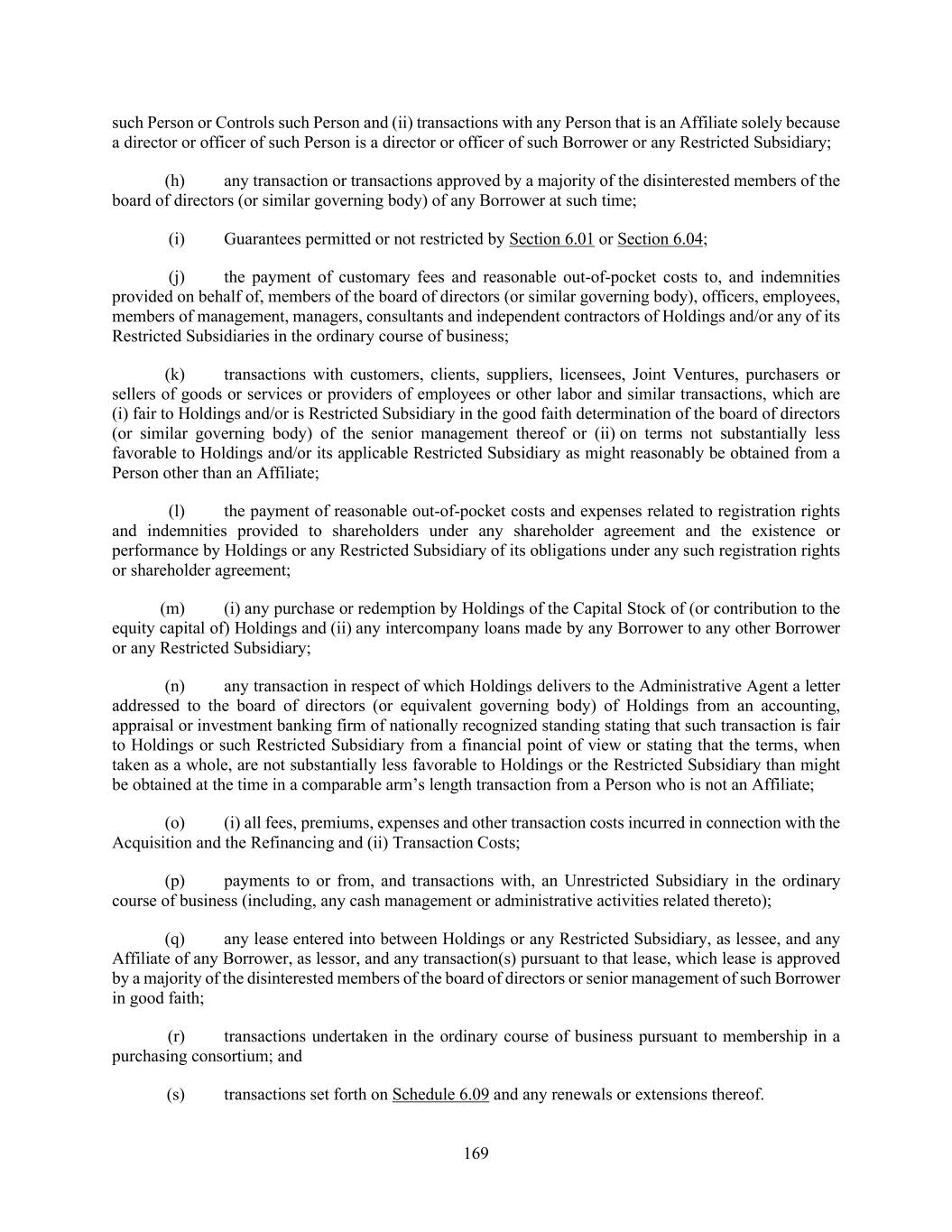 169 such Person or Controls such Person and (ii) transactions with any Person that is an Affiliate solely because a director or officer of such Person is a director or officer of such Borrower or any Restricted Subsidiary; (h) any transaction or transactions approved by a majority of the disinterested members of the board of directors (or similar governing body) of any Borrower at such time; (i) Guarantees permitted or not restricted by Section 6.01 or Section 6.04; (j) the payment of customary fees and reasonable out-of-pocket costs to, and indemnities provided on behalf of, members of the board of directors (or similar governing body), officers, employees, members of management, managers, consultants and independent contractors of Holdings and/or any of its Restricted Subsidiaries in the ordinary course of business; (k) transactions with customers, clients, suppliers, licensees, Joint Ventures, purchasers or sellers of goods or services or providers of employees or other labor and similar transactions, which are (i) fair to Holdings and/or is Restricted Subsidiary in the good faith determination of the board of directors (or similar governing body) of the senior management thereof or (ii) on terms not substantially less favorable to Holdings and/or its applicable Restricted Subsidiary as might reasonably be obtained from a Person other than an Affiliate; (l) the payment of reasonable out-of-pocket costs and expenses related to registration rights and indemnities provided to shareholders under any shareholder agreement and the existence or performance by Holdings or any Restricted Subsidiary of its obligations under any such registration rights or shareholder agreement; (m) (i) any purchase or redemption by Holdings of the Capital Stock of (or contribution to the equity capital of) Holdings and (ii) any intercompany loans made by any Borrower to any other Borrower or any Restricted Subsidiary; (n) any transaction in respect of which Holdings delivers to the Administrative Agent a letter addressed to the board of directors (or equivalent governing body) of Holdings from an accounting, appraisal or investment banking firm of nationally recognized standing stating that such transaction is fair to Holdings or such Restricted Subsidiary from a financial point of view or stating that the terms, when taken as a whole, are not substantially less favorable to Holdings or the Restricted Subsidiary than might be obtained at the time in a comparable arm’s length transaction from a Person who is not an Affiliate; (o) (i) all fees, premiums, expenses and other transaction costs incurred in connection with the Acquisition and the Refinancing and (ii) Transaction Costs; (p) payments to or from, and transactions with, an Unrestricted Subsidiary in the ordinary course of business (including, any cash management or administrative activities related thereto); (q) any lease entered into between Holdings or any Restricted Subsidiary, as lessee, and any Affiliate of any Borrower, as lessor, and any transaction(s) pursuant to that lease, which lease is approved by a majority of the disinterested members of the board of directors or senior management of such Borrower in good faith; (r) transactions undertaken in the ordinary course of business pursuant to membership in a purchasing consortium; and (s) transactions set forth on Schedule 6.09 and any renewals or extensions thereof.