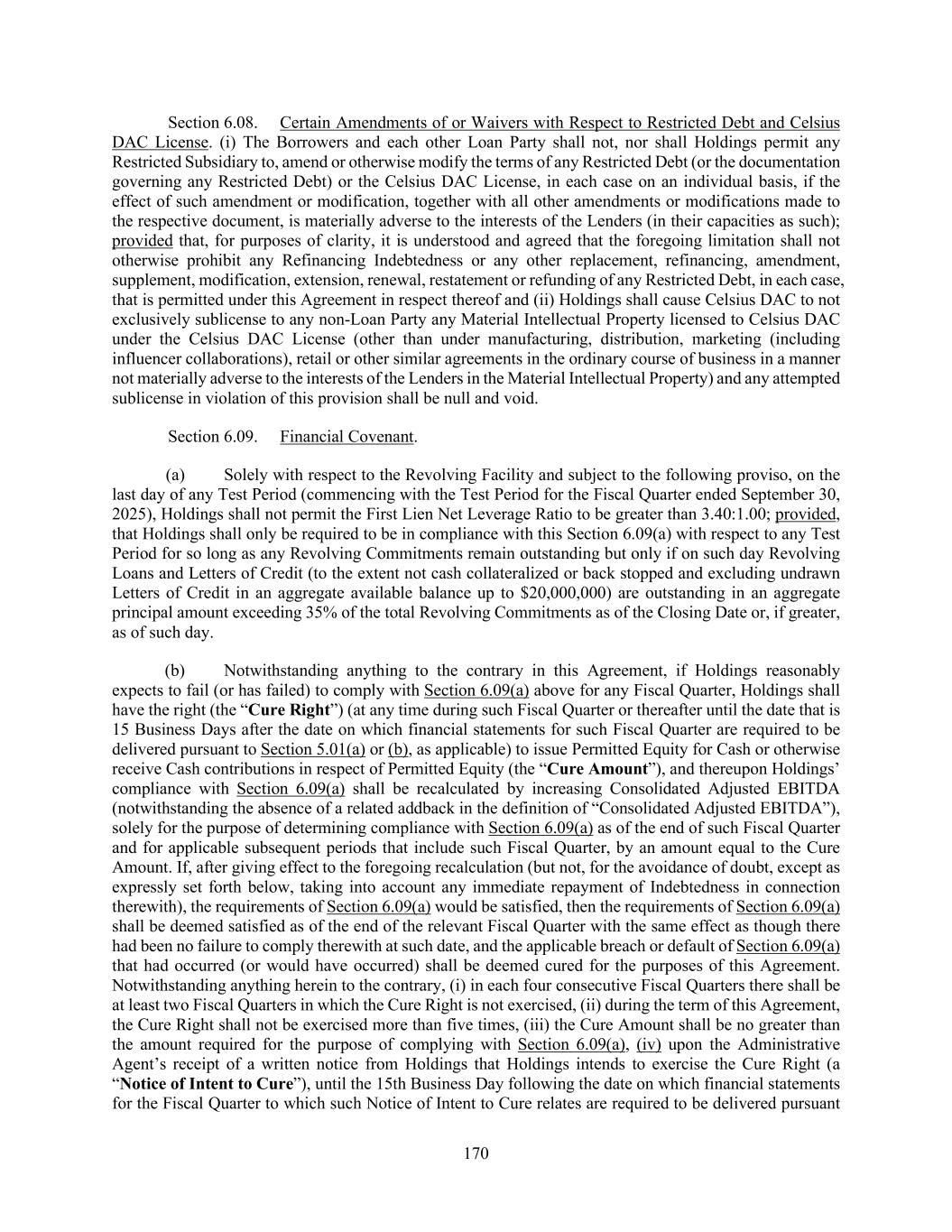170 Section 6.08. Certain Amendments of or Waivers with Respect to Restricted Debt and Celsius DAC License. (i) The Borrowers and each other Loan Party shall not, nor shall Holdings permit any Restricted Subsidiary to, amend or otherwise modify the terms of any Restricted Debt (or the documentation governing any Restricted Debt) or the Celsius DAC License, in each case on an individual basis, if the effect of such amendment or modification, together with all other amendments or modifications made to the respective document, is materially adverse to the interests of the Lenders (in their capacities as such); provided that, for purposes of clarity, it is understood and agreed that the foregoing limitation shall not otherwise prohibit any Refinancing Indebtedness or any other replacement, refinancing, amendment, supplement, modification, extension, renewal, restatement or refunding of any Restricted Debt, in each case, that is permitted under this Agreement in respect thereof and (ii) Holdings shall cause Celsius DAC to not exclusively sublicense to any non-Loan Party any Material Intellectual Property licensed to Celsius DAC under the Celsius DAC License (other than under manufacturing, distribution, marketing (including influencer collaborations), retail or other similar agreements in the ordinary course of business in a manner not materially adverse to the interests of the Lenders in the Material Intellectual Property) and any attempted sublicense in violation of this provision shall be null and void. Section 6.09. Financial Covenant. (a) Solely with respect to the Revolving Facility and subject to the following proviso, on the last day of any Test Period (commencing with the Test Period for the Fiscal Quarter ended September 30, 2025), Holdings shall not permit the First Lien Net Leverage Ratio to be greater than 3.40:1.00; provided, that Holdings shall only be required to be in compliance with this Section 6.09(a) with respect to any Test Period for so long as any Revolving Commitments remain outstanding but only if on such day Revolving Loans and Letters of Credit (to the extent not cash collateralized or back stopped and excluding undrawn Letters of Credit in an aggregate available balance up to $20,000,000) are outstanding in an aggregate principal amount exceeding 35% of the total Revolving Commitments as of the Closing Date or, if greater, as of such day. (b) Notwithstanding anything to the contrary in this Agreement, if Holdings reasonably expects to fail (or has failed) to comply with Section 6.09(a) above for any Fiscal Quarter, Holdings shall have the right (the “Cure Right”) (at any time during such Fiscal Quarter or thereafter until the date that is 15 Business Days after the date on which financial statements for such Fiscal Quarter are required to be delivered pursuant to Section 5.01(a) or (b), as applicable) to issue Permitted Equity for Cash or otherwise receive Cash contributions in respect of Permitted Equity (the “Cure Amount”), and thereupon Holdings’ compliance with Section 6.09(a) shall be recalculated by increasing Consolidated Adjusted EBITDA (notwithstanding the absence of a related addback in the definition of “Consolidated Adjusted EBITDA”), solely for the purpose of determining compliance with Section 6.09(a) as of the end of such Fiscal Quarter and for applicable subsequent periods that include such Fiscal Quarter, by an amount equal to the Cure Amount. If, after giving effect to the foregoing recalculation (but not, for the avoidance of doubt, except as expressly set forth below, taking into account any immediate repayment of Indebtedness in connection therewith), the requirements of Section 6.09(a) would be satisfied, then the requirements of Section 6.09(a) shall be deemed satisfied as of the end of the relevant Fiscal Quarter with the same effect as though there had been no failure to comply therewith at such date, and the applicable breach or default of Section 6.09(a) that had occurred (or would have occurred) shall be deemed cured for the purposes of this Agreement. Notwithstanding anything herein to the contrary, (i) in each four consecutive Fiscal Quarters there shall be at least two Fiscal Quarters in which the Cure Right is not exercised, (ii) during the term of this Agreement, the Cure Right shall not be exercised more than five times, (iii) the Cure Amount shall be no greater than the amount required for the purpose of complying with Section 6.09(a), (iv) upon the Administrative Agent’s receipt of a written notice from Holdings that Holdings intends to exercise the Cure Right (a “Notice of Intent to Cure”), until the 15th Business Day following the date on which financial statements for the Fiscal Quarter to which such Notice of Intent to Cure relates are required to be delivered pursuant