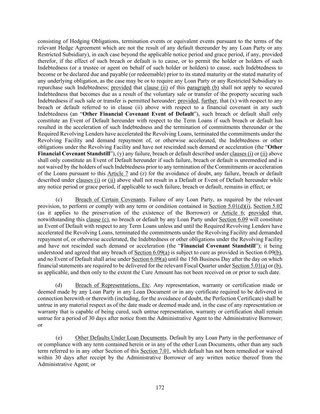 172 consisting of Hedging Obligations, termination events or equivalent events pursuant to the terms of the relevant Hedge Agreement which are not the result of any default thereunder by any Loan Party or any Restricted Subsidiary), in each case beyond the applicable notice period and grace period, if any, provided therefor, if the effect of such breach or default is to cause, or to permit the holder or holders of such Indebtedness (or a trustee or agent on behalf of such holder or holders) to cause, such Indebtedness to become or be declared due and payable (or redeemable) prior to its stated maturity or the stated maturity of any underlying obligation, as the case may be or to require any Loan Party or any Restricted Subsidiary to repurchase such Indebtedness; provided that clause (ii) of this paragraph (b) shall not apply to secured Indebtedness that becomes due as a result of the voluntary sale or transfer of the property securing such Indebtedness if such sale or transfer is permitted hereunder; provided, further, that (x) with respect to any breach or default referred to in clause (ii) above with respect to a financial covenant in any such Indebtedness (an “Other Financial Covenant Event of Default”), such breach or default shall only constitute an Event of Default hereunder with respect to the Term Loans if such breach or default has resulted in the acceleration of such Indebtedness and the termination of commitments thereunder or the Required Revolving Lenders have accelerated the Revolving Loans, terminated the commitments under the Revolving Facility and demand repayment of, or otherwise accelerated, the Indebtedness or other obligations under the Revolving Facility and have not rescinded such demand or acceleration (the “Other Financial Covenant Standstill”), (y) any failure, breach or default described under clauses (i) or (ii) above shall only constitute an Event of Default hereunder if such failure, breach or default is unremedied and is not waived by the holders of such Indebtedness prior to any termination of the Commitments or acceleration of the Loans pursuant to this Article 7 and (z) for the avoidance of doubt, any failure, breach or default described under clauses (i) or (ii) above shall not result in a Default or Event of Default hereunder while any notice period or grace period, if applicable to such failure, breach or default, remains in effect; or (c) Breach of Certain Covenants. Failure of any Loan Party, as required by the relevant provision, to perform or comply with any term or condition contained in Section 5.01(d)(i), Section 5.02 (as it applies to the preservation of the existence of the Borrower) or Article 6; provided that, notwithstanding this clause (c), no breach or default by any Loan Party under Section 6.09 will constitute an Event of Default with respect to any Term Loans unless and until the Required Revolving Lenders have accelerated the Revolving Loans, terminated the commitments under the Revolving Facility and demanded repayment of, or otherwise accelerated, the Indebtedness or other obligations under the Revolving Facility and have not rescinded such demand or acceleration (the “Financial Covenant Standstill”); it being understood and agreed that any breach of Section 6.09(a) is subject to cure as provided in Section 6.09(b), and no Event of Default shall arise under Section 6.09(a) until the 15th Business Day after the day on which financial statements are required to be delivered for the relevant Fiscal Quarter under Section 5.01(a) or (b), as applicable, and then only to the extent the Cure Amount has not been received on or prior to such date. (d) Breach of Representations, Etc. Any representation, warranty or certification made or deemed made by any Loan Party in any Loan Document or in any certificate required to be delivered in connection herewith or therewith (including, for the avoidance of doubt, the Perfection Certificate) shall be untrue in any material respect as of the date made or deemed made and, in the case of any representation or warranty that is capable of being cured, such untrue representation, warranty or certification shall remain untrue for a period of 30 days after notice from the Administrative Agent to the Administrative Borrower; or (e) Other Defaults Under Loan Documents. Default by any Loan Party in the performance of or compliance with any term contained herein or in any of the other Loan Documents, other than any such term referred to in any other Section of this Section 7.01, which default has not been remedied or waived within 30 days after receipt by the Administrative Borrower of any written notice thereof from the Administrative Agent; or