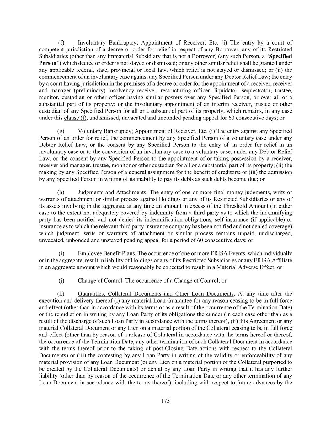 173 (f) Involuntary Bankruptcy; Appointment of Receiver, Etc. (i) The entry by a court of competent jurisdiction of a decree or order for relief in respect of any Borrower, any of its Restricted Subsidiaries (other than any Immaterial Subsidiary that is not a Borrower) (any such Person, a “Specified Person”) which decree or order is not stayed or dismissed; or any other similar relief shall be granted under any applicable federal, state, provincial or local law, which relief is not stayed or dismissed; or (ii) the commencement of an involuntary case against any Specified Person under any Debtor Relief Law; the entry by a court having jurisdiction in the premises of a decree or order for the appointment of a receiver, receiver and manager (preliminary) insolvency receiver, restructuring officer, liquidator, sequestrator, trustee, monitor, custodian or other officer having similar powers over any Specified Person, or over all or a substantial part of its property; or the involuntary appointment of an interim receiver, trustee or other custodian of any Specified Person for all or a substantial part of its property, which remains, in any case under this clause (f), undismissed, unvacated and unbonded pending appeal for 60 consecutive days; or (g) Voluntary Bankruptcy; Appointment of Receiver, Etc. (i) The entry against any Specified Person of an order for relief, the commencement by any Specified Person of a voluntary case under any Debtor Relief Law, or the consent by any Specified Person to the entry of an order for relief in an involuntary case or to the conversion of an involuntary case to a voluntary case, under any Debtor Relief Law, or the consent by any Specified Person to the appointment of or taking possession by a receiver, receiver and manager, trustee, monitor or other custodian for all or a substantial part of its property; (ii) the making by any Specified Person of a general assignment for the benefit of creditors; or (iii) the admission by any Specified Person in writing of its inability to pay its debts as such debts become due; or (h) Judgments and Attachments. The entry of one or more final money judgments, writs or warrants of attachment or similar process against Holdings or any of its Restricted Subsidiaries or any of its assets involving in the aggregate at any time an amount in excess of the Threshold Amount (in either case to the extent not adequately covered by indemnity from a third party as to which the indemnifying party has been notified and not denied its indemnification obligations, self-insurance (if applicable) or insurance as to which the relevant third party insurance company has been notified and not denied coverage), which judgment, writs or warrants of attachment or similar process remains unpaid, undischarged, unvacated, unbonded and unstayed pending appeal for a period of 60 consecutive days; or (i) Employee Benefit Plans. The occurrence of one or more ERISA Events, which individually or in the aggregate, result in liability of Holdings or any of its Restricted Subsidiaries or any ERISA Affiliate in an aggregate amount which would reasonably be expected to result in a Material Adverse Effect; or (j) Change of Control. The occurrence of a Change of Control; or (k) Guaranties, Collateral Documents and Other Loan Documents. At any time after the execution and delivery thereof (i) any material Loan Guarantee for any reason ceasing to be in full force and effect (other than in accordance with its terms or as a result of the occurrence of the Termination Date) or the repudiation in writing by any Loan Party of its obligations thereunder (in each case other than as a result of the discharge of such Loan Party in accordance with the terms thereof), (ii) this Agreement or any material Collateral Document or any Lien on a material portion of the Collateral ceasing to be in full force and effect (other than by reason of a release of Collateral in accordance with the terms hereof or thereof, the occurrence of the Termination Date, any other termination of such Collateral Document in accordance with the terms thereof prior to the taking of post-Closing Date actions with respect to the Collateral Documents) or (iii) the contesting by any Loan Party in writing of the validity or enforceability of any material provision of any Loan Document (or any Lien on a material portion of the Collateral purported to be created by the Collateral Documents) or denial by any Loan Party in writing that it has any further liability (other than by reason of the occurrence of the Termination Date or any other termination of any Loan Document in accordance with the terms thereof), including with respect to future advances by the