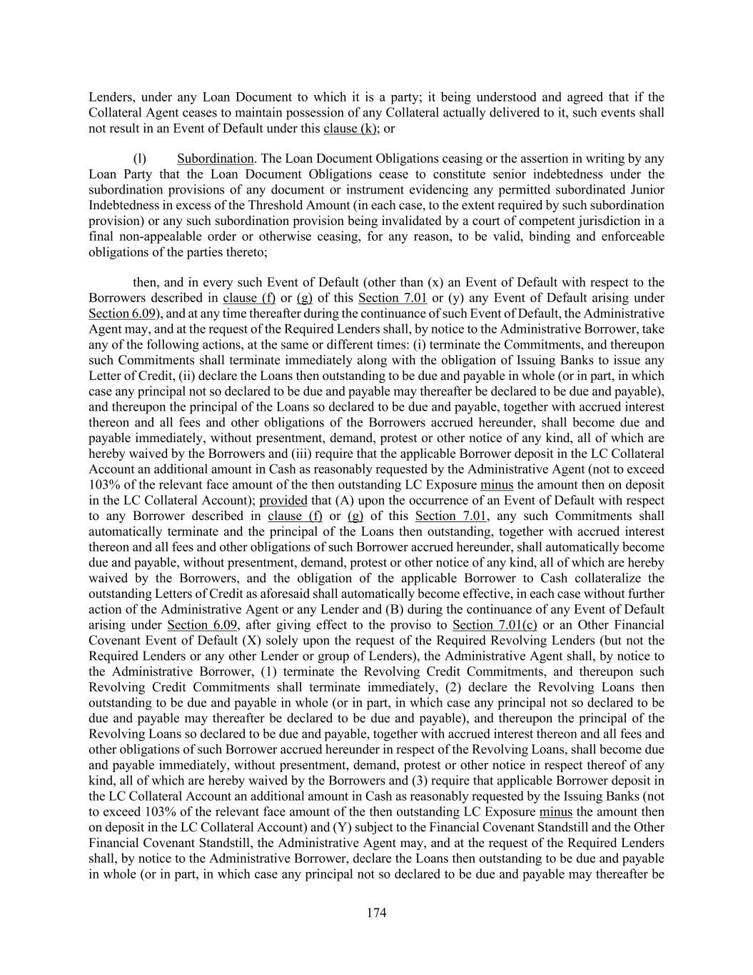 174 Lenders, under any Loan Document to which it is a party; it being understood and agreed that if the Collateral Agent ceases to maintain possession of any Collateral actually delivered to it, such events shall not result in an Event of Default under this clause (k); or (l) Subordination. The Loan Document Obligations ceasing or the assertion in writing by any Loan Party that the Loan Document Obligations cease to constitute senior indebtedness under the subordination provisions of any document or instrument evidencing any permitted subordinated Junior Indebtedness in excess of the Threshold Amount (in each case, to the extent required by such subordination provision) or any such subordination provision being invalidated by a court of competent jurisdiction in a final non-appealable order or otherwise ceasing, for any reason, to be valid, binding and enforceable obligations of the parties thereto; then, and in every such Event of Default (other than (x) an Event of Default with respect to the Borrowers described in clause (f) or (g) of this Section 7.01 or (y) any Event of Default arising under Section 6.09), and at any time thereafter during the continuance of such Event of Default, the Administrative Agent may, and at the request of the Required Lenders shall, by notice to the Administrative Borrower, take any of the following actions, at the same or different times: (i) terminate the Commitments, and thereupon such Commitments shall terminate immediately along with the obligation of Issuing Banks to issue any Letter of Credit, (ii) declare the Loans then outstanding to be due and payable in whole (or in part, in which case any principal not so declared to be due and payable may thereafter be declared to be due and payable), and thereupon the principal of the Loans so declared to be due and payable, together with accrued interest thereon and all fees and other obligations of the Borrowers accrued hereunder, shall become due and payable immediately, without presentment, demand, protest or other notice of any kind, all of which are hereby waived by the Borrowers and (iii) require that the applicable Borrower deposit in the LC Collateral Account an additional amount in Cash as reasonably requested by the Administrative Agent (not to exceed 103% of the relevant face amount of the then outstanding LC Exposure minus the amount then on deposit in the LC Collateral Account); provided that (A) upon the occurrence of an Event of Default with respect to any Borrower described in clause (f) or (g) of this Section 7.01, any such Commitments shall automatically terminate and the principal of the Loans then outstanding, together with accrued interest thereon and all fees and other obligations of such Borrower accrued hereunder, shall automatically become due and payable, without presentment, demand, protest or other notice of any kind, all of which are hereby waived by the Borrowers, and the obligation of the applicable Borrower to Cash collateralize the outstanding Letters of Credit as aforesaid shall automatically become effective, in each case without further action of the Administrative Agent or any Lender and (B) during the continuance of any Event of Default arising under Section 6.09, after giving effect to the proviso to Section 7.01(c) or an Other Financial Covenant Event of Default (X) solely upon the request of the Required Revolving Lenders (but not the Required Lenders or any other Lender or group of Lenders), the Administrative Agent shall, by notice to the Administrative Borrower, (1) terminate the Revolving Credit Commitments, and thereupon such Revolving Credit Commitments shall terminate immediately, (2) declare the Revolving Loans then outstanding to be due and payable in whole (or in part, in which case any principal not so declared to be due and payable may thereafter be declared to be due and payable), and thereupon the principal of the Revolving Loans so declared to be due and payable, together with accrued interest thereon and all fees and other obligations of such Borrower accrued hereunder in respect of the Revolving Loans, shall become due and payable immediately, without presentment, demand, protest or other notice in respect thereof of any kind, all of which are hereby waived by the Borrowers and (3) require that applicable Borrower deposit in the LC Collateral Account an additional amount in Cash as reasonably requested by the Issuing Banks (not to exceed 103% of the relevant face amount of the then outstanding LC Exposure minus the amount then on deposit in the LC Collateral Account) and (Y) subject to the Financial Covenant Standstill and the Other Financial Covenant Standstill, the Administrative Agent may, and at the request of the Required Lenders shall, by notice to the Administrative Borrower, declare the Loans then outstanding to be due and payable in whole (or in part, in which case any principal not so declared to be due and payable may thereafter be
