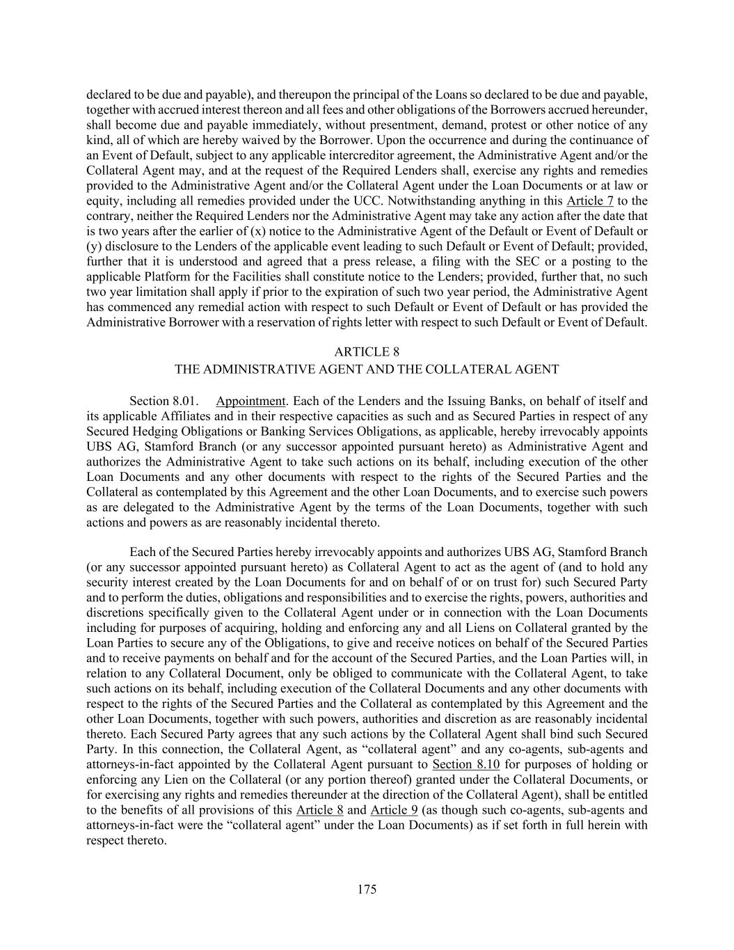 175 declared to be due and payable), and thereupon the principal of the Loans so declared to be due and payable, together with accrued interest thereon and all fees and other obligations of the Borrowers accrued hereunder, shall become due and payable immediately, without presentment, demand, protest or other notice of any kind, all of which are hereby waived by the Borrower. Upon the occurrence and during the continuance of an Event of Default, subject to any applicable intercreditor agreement, the Administrative Agent and/or the Collateral Agent may, and at the request of the Required Lenders shall, exercise any rights and remedies provided to the Administrative Agent and/or the Collateral Agent under the Loan Documents or at law or equity, including all remedies provided under the UCC. Notwithstanding anything in this Article 7 to the contrary, neither the Required Lenders nor the Administrative Agent may take any action after the date that is two years after the earlier of (x) notice to the Administrative Agent of the Default or Event of Default or (y) disclosure to the Lenders of the applicable event leading to such Default or Event of Default; provided, further that it is understood and agreed that a press release, a filing with the SEC or a posting to the applicable Platform for the Facilities shall constitute notice to the Lenders; provided, further that, no such two year limitation shall apply if prior to the expiration of such two year period, the Administrative Agent has commenced any remedial action with respect to such Default or Event of Default or has provided the Administrative Borrower with a reservation of rights letter with respect to such Default or Event of Default. ARTICLE 8 THE ADMINISTRATIVE AGENT AND THE COLLATERAL AGENT Section 8.01. Appointment. Each of the Lenders and the Issuing Banks, on behalf of itself and its applicable Affiliates and in their respective capacities as such and as Secured Parties in respect of any Secured Hedging Obligations or Banking Services Obligations, as applicable, hereby irrevocably appoints UBS AG, Stamford Branch (or any successor appointed pursuant hereto) as Administrative Agent and authorizes the Administrative Agent to take such actions on its behalf, including execution of the other Loan Documents and any other documents with respect to the rights of the Secured Parties and the Collateral as contemplated by this Agreement and the other Loan Documents, and to exercise such powers as are delegated to the Administrative Agent by the terms of the Loan Documents, together with such actions and powers as are reasonably incidental thereto. Each of the Secured Parties hereby irrevocably appoints and authorizes UBS AG, Stamford Branch (or any successor appointed pursuant hereto) as Collateral Agent to act as the agent of (and to hold any security interest created by the Loan Documents for and on behalf of or on trust for) such Secured Party and to perform the duties, obligations and responsibilities and to exercise the rights, powers, authorities and discretions specifically given to the Collateral Agent under or in connection with the Loan Documents including for purposes of acquiring, holding and enforcing any and all Liens on Collateral granted by the Loan Parties to secure any of the Obligations, to give and receive notices on behalf of the Secured Parties and to receive payments on behalf and for the account of the Secured Parties, and the Loan Parties will, in relation to any Collateral Document, only be obliged to communicate with the Collateral Agent, to take such actions on its behalf, including execution of the Collateral Documents and any other documents with respect to the rights of the Secured Parties and the Collateral as contemplated by this Agreement and the other Loan Documents, together with such powers, authorities and discretion as are reasonably incidental thereto. Each Secured Party agrees that any such actions by the Collateral Agent shall bind such Secured Party. In this connection, the Collateral Agent, as “collateral agent” and any co-agents, sub-agents and attorneys-in-fact appointed by the Collateral Agent pursuant to Section 8.10 for purposes of holding or enforcing any Lien on the Collateral (or any portion thereof) granted under the Collateral Documents, or for exercising any rights and remedies thereunder at the direction of the Collateral Agent), shall be entitled to the benefits of all provisions of this Article 8 and Article 9 (as though such co-agents, sub-agents and attorneys-in-fact were the “collateral agent” under the Loan Documents) as if set forth in full herein with respect thereto.