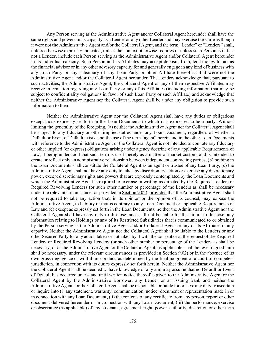 176 Any Person serving as the Administrative Agent and/or Collateral Agent hereunder shall have the same rights and powers in its capacity as a Lender as any other Lender and may exercise the same as though it were not the Administrative Agent and/or the Collateral Agent, and the term “Lender” or “Lenders” shall, unless otherwise expressly indicated, unless the context otherwise requires or unless such Person is in fact not a Lender, include each Person serving as the Administrative Agent and/or Collateral Agent hereunder in its individual capacity. Such Person and its Affiliates may accept deposits from, lend money to, act as the financial advisor or in any other advisory capacity for and generally engage in any kind of business with any Loan Party or any subsidiary of any Loan Party or other Affiliate thereof as if it were not the Administrative Agent and/or the Collateral Agent hereunder. The Lenders acknowledge that, pursuant to such activities, the Administrative Agent, the Collateral Agent or any of their respective Affiliates may receive information regarding any Loan Party or any of its Affiliates (including information that may be subject to confidentiality obligations in favor of such Loan Party or such Affiliate) and acknowledge that neither the Administrative Agent nor the Collateral Agent shall be under any obligation to provide such information to them. Neither the Administrative Agent nor the Collateral Agent shall have any duties or obligations except those expressly set forth in the Loan Documents to which it is expressed to be a party. Without limiting the generality of the foregoing, (a) neither the Administrative Agent nor the Collateral Agent shall be subject to any fiduciary or other implied duties under any Loan Document, regardless of whether a Default or Event of Default exists, and the use of the term “agent” herein and in the other Loan Documents with reference to the Administrative Agent or the Collateral Agent is not intended to connote any fiduciary or other implied (or express) obligations arising under agency doctrine of any applicable Requirements of Law; it being understood that such term is used merely as a matter of market custom, and is intended to create or reflect only an administrative relationship between independent contracting parties, (b) nothing in the Loan Documents shall constitute the Collateral Agent as an agent or trustee of any Loan Party, (c) the Administrative Agent shall not have any duty to take any discretionary action or exercise any discretionary power, except discretionary rights and powers that are expressly contemplated by the Loan Documents and which the Administrative Agent is required to exercise in writing as directed by the Required Lenders or Required Revolving Lenders (or such other number or percentage of the Lenders as shall be necessary under the relevant circumstances as provided in Section 9.02); provided that the Administrative Agent shall not be required to take any action that, in its opinion or the opinion of its counsel, may expose the Administrative Agent, to liability or that is contrary to any Loan Document or applicable Requirements of Law and (c) except as expressly set forth in the Loan Documents, neither the Administrative Agent nor the Collateral Agent shall have any duty to disclose, and shall not be liable for the failure to disclose, any information relating to Holdings or any of its Restricted Subsidiaries that is communicated to or obtained by the Person serving as the Administrative Agent and/or Collateral Agent or any of its Affiliates in any capacity. Neither the Administrative Agent nor the Collateral Agent shall be liable to the Lenders or any other Secured Party for any action taken or not taken by it with the consent or at the request of the Required Lenders or Required Revolving Lenders (or such other number or percentage of the Lenders as shall be necessary, or as the Administrative Agent or the Collateral Agent, as applicable, shall believe in good faith shall be necessary, under the relevant circumstances as provided in Section 9.02) or in the absence of its own gross negligence or willful misconduct, as determined by the final judgment of a court of competent jurisdiction, in connection with its duties expressly set forth herein. Neither the Administrative Agent nor the Collateral Agent shall be deemed to have knowledge of any and may assume that no Default or Event of Default has occurred unless and until written notice thereof is given to the Administrative Agent or the Collateral Agent by the Administrative Borrower, any Lender or an Issuing Bank and neither the Administrative Agent nor the Collateral Agent shall be responsible or liable for or have any duty to ascertain or inquire into (i) any statement, warranty, communication, notice, document or representation made in or in connection with any Loan Document, (ii) the contents of any certificate from any person, report or other document delivered hereunder or in connection with any Loan Document, (iii) the performance, exercise or observance (as applicable) of any covenant, agreement, right, power, authority, discretion or other term