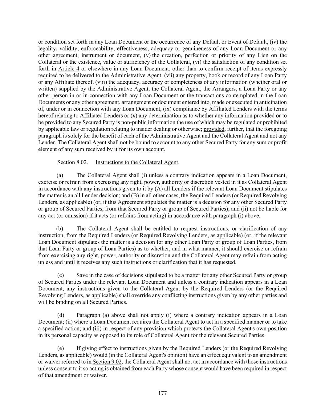 177 or condition set forth in any Loan Document or the occurrence of any Default or Event of Default, (iv) the legality, validity, enforceability, effectiveness, adequacy or genuineness of any Loan Document or any other agreement, instrument or document, (v) the creation, perfection or priority of any Lien on the Collateral or the existence, value or sufficiency of the Collateral, (vi) the satisfaction of any condition set forth in Article 4 or elsewhere in any Loan Document, other than to confirm receipt of items expressly required to be delivered to the Administrative Agent, (vii) any property, book or record of any Loan Party or any Affiliate thereof, (viii) the adequacy, accuracy or completeness of any information (whether oral or written) supplied by the Administrative Agent, the Collateral Agent, the Arrangers, a Loan Party or any other person in or in connection with any Loan Document or the transactions contemplated in the Loan Documents or any other agreement, arrangement or document entered into, made or executed in anticipation of, under or in connection with any Loan Document, (ix) compliance by Affiliated Lenders with the terms hereof relating to Affiliated Lenders or (x) any determination as to whether any information provided or to be provided to any Secured Party is non-public information the use of which may be regulated or prohibited by applicable law or regulation relating to insider dealing or otherwise; provided, further, that the foregoing paragraph is solely for the benefit of each of the Administrative Agent and the Collateral Agent and not any Lender. The Collateral Agent shall not be bound to account to any other Secured Party for any sum or profit element of any sum received by it for its own account. Section 8.02. Instructions to the Collateral Agent. (a) The Collateral Agent shall (i) unless a contrary indication appears in a Loan Document, exercise or refrain from exercising any right, power, authority or discretion vested in it as Collateral Agent in accordance with any instructions given to it by (A) all Lenders if the relevant Loan Document stipulates the matter is an all Lender decision; and (B) in all other cases, the Required Lenders (or Required Revolving Lenders, as applicable) (or, if this Agreement stipulates the matter is a decision for any other Secured Party or group of Secured Parties, from that Secured Party or group of Secured Parties); and (ii) not be liable for any act (or omission) if it acts (or refrains from acting) in accordance with paragraph (i) above. (b) The Collateral Agent shall be entitled to request instructions, or clarification of any instruction, from the Required Lenders (or Required Revolving Lenders, as applicable) (or, if the relevant Loan Document stipulates the matter is a decision for any other Loan Party or group of Loan Parties, from that Loan Party or group of Loan Parties) as to whether, and in what manner, it should exercise or refrain from exercising any right, power, authority or discretion and the Collateral Agent may refrain from acting unless and until it receives any such instructions or clarification that it has requested. (c) Save in the case of decisions stipulated to be a matter for any other Secured Party or group of Secured Parties under the relevant Loan Document and unless a contrary indication appears in a Loan Document, any instructions given to the Collateral Agent by the Required Lenders (or the Required Revolving Lenders, as applicable) shall override any conflicting instructions given by any other parties and will be binding on all Secured Parties. (d) Paragraph (a) above shall not apply (i) where a contrary indication appears in a Loan Document; (ii) where a Loan Document requires the Collateral Agent to act in a specified manner or to take a specified action; and (iii) in respect of any provision which protects the Collateral Agent's own position in its personal capacity as opposed to its role of Collateral Agent for the relevant Secured Parties. (e) If giving effect to instructions given by the Required Lenders (or the Required Revolving Lenders, as applicable) would (in the Collateral Agent's opinion) have an effect equivalent to an amendment or waiver referred to in Section 9.02, the Collateral Agent shall not act in accordance with those instructions unless consent to it so acting is obtained from each Party whose consent would have been required in respect of that amendment or waiver.
