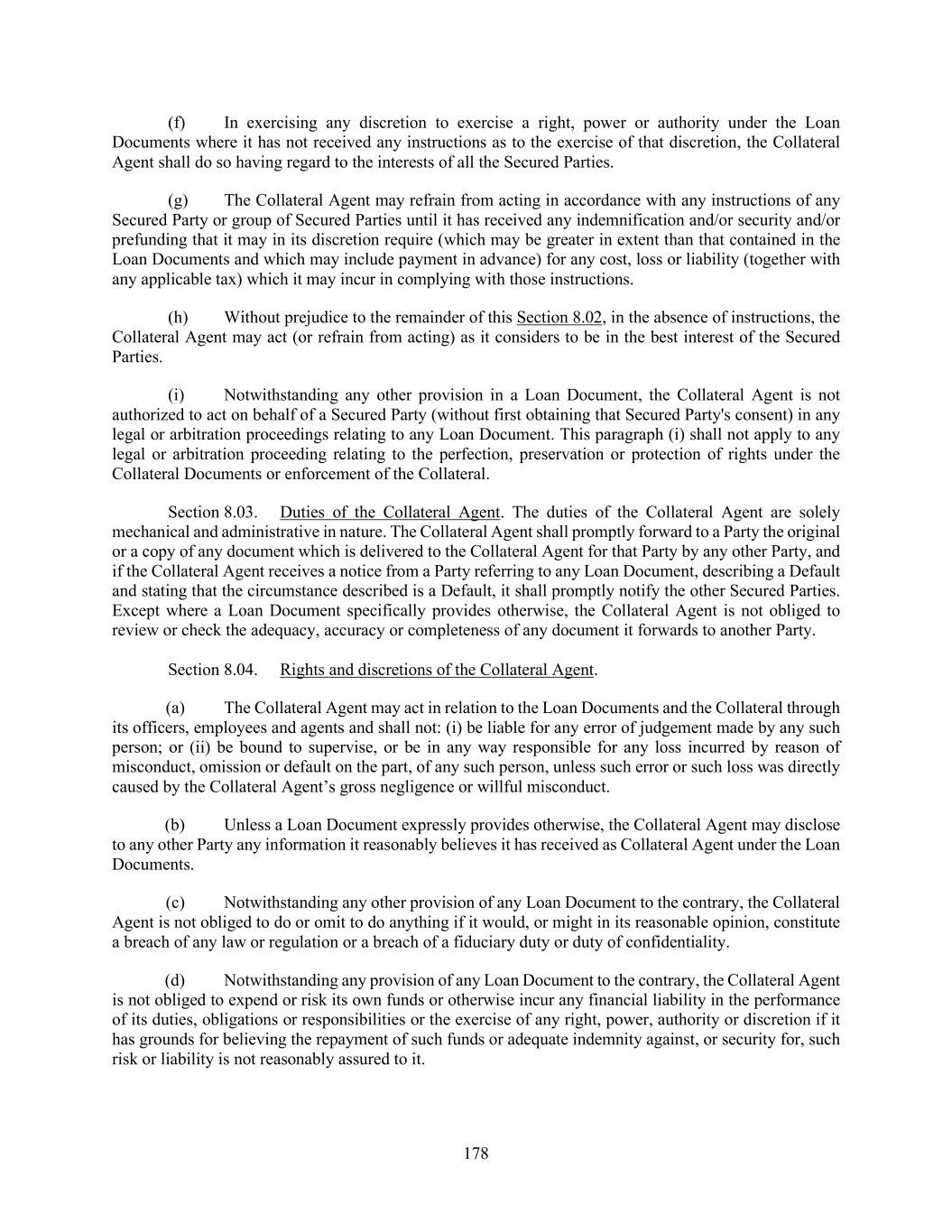 178 (f) In exercising any discretion to exercise a right, power or authority under the Loan Documents where it has not received any instructions as to the exercise of that discretion, the Collateral Agent shall do so having regard to the interests of all the Secured Parties. (g) The Collateral Agent may refrain from acting in accordance with any instructions of any Secured Party or group of Secured Parties until it has received any indemnification and/or security and/or prefunding that it may in its discretion require (which may be greater in extent than that contained in the Loan Documents and which may include payment in advance) for any cost, loss or liability (together with any applicable tax) which it may incur in complying with those instructions. (h) Without prejudice to the remainder of this Section 8.02, in the absence of instructions, the Collateral Agent may act (or refrain from acting) as it considers to be in the best interest of the Secured Parties. (i) Notwithstanding any other provision in a Loan Document, the Collateral Agent is not authorized to act on behalf of a Secured Party (without first obtaining that Secured Party's consent) in any legal or arbitration proceedings relating to any Loan Document. This paragraph (i) shall not apply to any legal or arbitration proceeding relating to the perfection, preservation or protection of rights under the Collateral Documents or enforcement of the Collateral. Section 8.03. Duties of the Collateral Agent. The duties of the Collateral Agent are solely mechanical and administrative in nature. The Collateral Agent shall promptly forward to a Party the original or a copy of any document which is delivered to the Collateral Agent for that Party by any other Party, and if the Collateral Agent receives a notice from a Party referring to any Loan Document, describing a Default and stating that the circumstance described is a Default, it shall promptly notify the other Secured Parties. Except where a Loan Document specifically provides otherwise, the Collateral Agent is not obliged to review or check the adequacy, accuracy or completeness of any document it forwards to another Party. Section 8.04. Rights and discretions of the Collateral Agent. (a) The Collateral Agent may act in relation to the Loan Documents and the Collateral through its officers, employees and agents and shall not: (i) be liable for any error of judgement made by any such person; or (ii) be bound to supervise, or be in any way responsible for any loss incurred by reason of misconduct, omission or default on the part, of any such person, unless such error or such loss was directly caused by the Collateral Agent’s gross negligence or willful misconduct. (b) Unless a Loan Document expressly provides otherwise, the Collateral Agent may disclose to any other Party any information it reasonably believes it has received as Collateral Agent under the Loan Documents. (c) Notwithstanding any other provision of any Loan Document to the contrary, the Collateral Agent is not obliged to do or omit to do anything if it would, or might in its reasonable opinion, constitute a breach of any law or regulation or a breach of a fiduciary duty or duty of confidentiality. (d) Notwithstanding any provision of any Loan Document to the contrary, the Collateral Agent is not obliged to expend or risk its own funds or otherwise incur any financial liability in the performance of its duties, obligations or responsibilities or the exercise of any right, power, authority or discretion if it has grounds for believing the repayment of such funds or adequate indemnity against, or security for, such risk or liability is not reasonably assured to it.