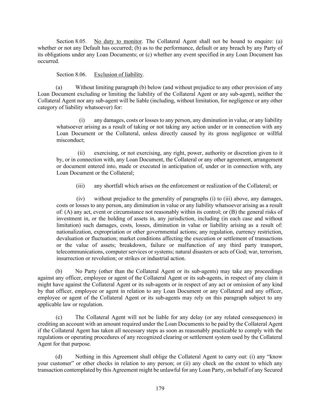 179 Section 8.05. No duty to monitor. The Collateral Agent shall not be bound to enquire: (a) whether or not any Default has occurred; (b) as to the performance, default or any breach by any Party of its obligations under any Loan Documents; or (c) whether any event specified in any Loan Document has occurred. Section 8.06. Exclusion of liability. (a) Without limiting paragraph (b) below (and without prejudice to any other provision of any Loan Document excluding or limiting the liability of the Collateral Agent or any sub-agent), neither the Collateral Agent nor any sub-agent will be liable (including, without limitation, for negligence or any other category of liability whatsoever) for: (i) any damages, costs or losses to any person, any diminution in value, or any liability whatsoever arising as a result of taking or not taking any action under or in connection with any Loan Document or the Collateral, unless directly caused by its gross negligence or willful misconduct; (ii) exercising, or not exercising, any right, power, authority or discretion given to it by, or in connection with, any Loan Document, the Collateral or any other agreement, arrangement or document entered into, made or executed in anticipation of, under or in connection with, any Loan Document or the Collateral; (iii) any shortfall which arises on the enforcement or realization of the Collateral; or (iv) without prejudice to the generality of paragraphs (i) to (iii) above, any damages, costs or losses to any person, any diminution in value or any liability whatsoever arising as a result of: (A) any act, event or circumstance not reasonably within its control; or (B) the general risks of investment in, or the holding of assets in, any jurisdiction, including (in each case and without limitation) such damages, costs, losses, diminution in value or liability arising as a result of: nationalization, expropriation or other governmental actions; any regulation, currency restriction, devaluation or fluctuation; market conditions affecting the execution or settlement of transactions or the value of assets; breakdown, failure or malfunction of any third party transport, telecommunications, computer services or systems; natural disasters or acts of God; war, terrorism, insurrection or revolution; or strikes or industrial action. (b) No Party (other than the Collateral Agent or its sub-agents) may take any proceedings against any officer, employee or agent of the Collateral Agent or its sub-agents, in respect of any claim it might have against the Collateral Agent or its sub-agents or in respect of any act or omission of any kind by that officer, employee or agent in relation to any Loan Document or any Collateral and any officer, employee or agent of the Collateral Agent or its sub-agents may rely on this paragraph subject to any applicable law or regulation. (c) The Collateral Agent will not be liable for any delay (or any related consequences) in crediting an account with an amount required under the Loan Documents to be paid by the Collateral Agent if the Collateral Agent has taken all necessary steps as soon as reasonably practicable to comply with the regulations or operating procedures of any recognized clearing or settlement system used by the Collateral Agent for that purpose. (d) Nothing in this Agreement shall oblige the Collateral Agent to carry out: (i) any “know your customer” or other checks in relation to any person; or (ii) any check on the extent to which any transaction contemplated by this Agreement might be unlawful for any Loan Party, on behalf of any Secured