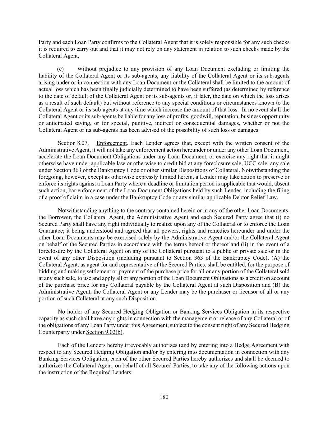 180 Party and each Loan Party confirms to the Collateral Agent that it is solely responsible for any such checks it is required to carry out and that it may not rely on any statement in relation to such checks made by the Collateral Agent. (e) Without prejudice to any provision of any Loan Document excluding or limiting the liability of the Collateral Agent or its sub-agents, any liability of the Collateral Agent or its sub-agents arising under or in connection with any Loan Document or the Collateral shall be limited to the amount of actual loss which has been finally judicially determined to have been suffered (as determined by reference to the date of default of the Collateral Agent or its sub-agents or, if later, the date on which the loss arises as a result of such default) but without reference to any special conditions or circumstances known to the Collateral Agent or its sub-agents at any time which increase the amount of that loss. In no event shall the Collateral Agent or its sub-agents be liable for any loss of profits, goodwill, reputation, business opportunity or anticipated saving, or for special, punitive, indirect or consequential damages, whether or not the Collateral Agent or its sub-agents has been advised of the possibility of such loss or damages. Section 8.07. Enforcement. Each Lender agrees that, except with the written consent of the Administrative Agent, it will not take any enforcement action hereunder or under any other Loan Document, accelerate the Loan Document Obligations under any Loan Document, or exercise any right that it might otherwise have under applicable law or otherwise to credit bid at any foreclosure sale, UCC sale, any sale under Section 363 of the Bankruptcy Code or other similar Dispositions of Collateral. Notwithstanding the foregoing, however, except as otherwise expressly limited herein, a Lender may take action to preserve or enforce its rights against a Loan Party where a deadline or limitation period is applicable that would, absent such action, bar enforcement of the Loan Document Obligations held by such Lender, including the filing of a proof of claim in a case under the Bankruptcy Code or any similar applicable Debtor Relief Law. Notwithstanding anything to the contrary contained herein or in any of the other Loan Documents, the Borrower, the Collateral Agent, the Administrative Agent and each Secured Party agree that (i) no Secured Party shall have any right individually to realize upon any of the Collateral or to enforce the Loan Guarantee; it being understood and agreed that all powers, rights and remedies hereunder and under the other Loan Documents may be exercised solely by the Administrative Agent and/or the Collateral Agent on behalf of the Secured Parties in accordance with the terms hereof or thereof and (ii) in the event of a foreclosure by the Collateral Agent on any of the Collateral pursuant to a public or private sale or in the event of any other Disposition (including pursuant to Section 363 of the Bankruptcy Code), (A) the Collateral Agent, as agent for and representative of the Secured Parties, shall be entitled, for the purpose of bidding and making settlement or payment of the purchase price for all or any portion of the Collateral sold at any such sale, to use and apply all or any portion of the Loan Document Obligations as a credit on account of the purchase price for any Collateral payable by the Collateral Agent at such Disposition and (B) the Administrative Agent, the Collateral Agent or any Lender may be the purchaser or licensor of all or any portion of such Collateral at any such Disposition. No holder of any Secured Hedging Obligation or Banking Services Obligation in its respective capacity as such shall have any rights in connection with the management or release of any Collateral or of the obligations of any Loan Party under this Agreement, subject to the consent right of any Secured Hedging Counterparty under Section 9.02(b). Each of the Lenders hereby irrevocably authorizes (and by entering into a Hedge Agreement with respect to any Secured Hedging Obligation and/or by entering into documentation in connection with any Banking Services Obligation, each of the other Secured Parties hereby authorizes and shall be deemed to authorize) the Collateral Agent, on behalf of all Secured Parties, to take any of the following actions upon the instruction of the Required Lenders:
