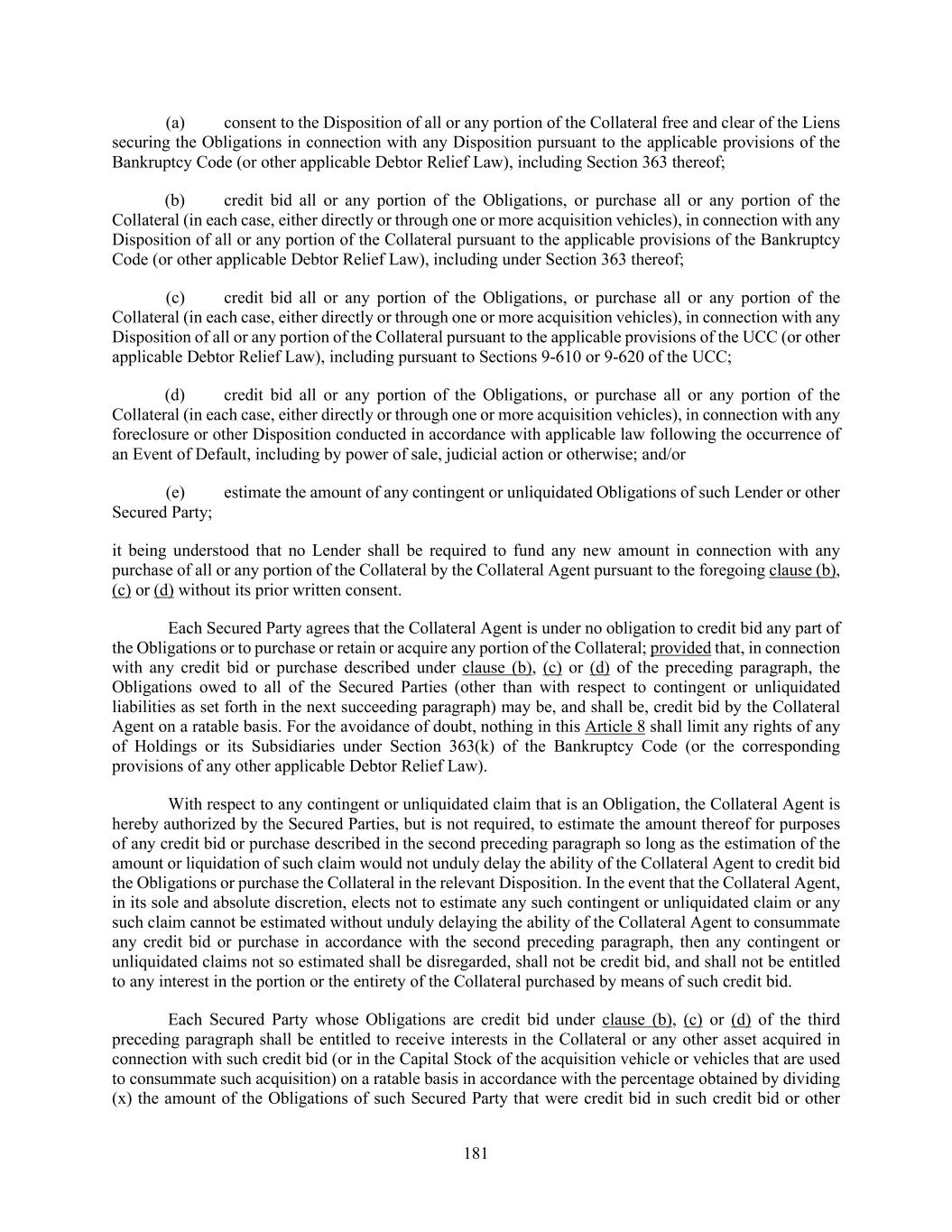 181 (a) consent to the Disposition of all or any portion of the Collateral free and clear of the Liens securing the Obligations in connection with any Disposition pursuant to the applicable provisions of the Bankruptcy Code (or other applicable Debtor Relief Law), including Section 363 thereof; (b) credit bid all or any portion of the Obligations, or purchase all or any portion of the Collateral (in each case, either directly or through one or more acquisition vehicles), in connection with any Disposition of all or any portion of the Collateral pursuant to the applicable provisions of the Bankruptcy Code (or other applicable Debtor Relief Law), including under Section 363 thereof; (c) credit bid all or any portion of the Obligations, or purchase all or any portion of the Collateral (in each case, either directly or through one or more acquisition vehicles), in connection with any Disposition of all or any portion of the Collateral pursuant to the applicable provisions of the UCC (or other applicable Debtor Relief Law), including pursuant to Sections 9-610 or 9-620 of the UCC; (d) credit bid all or any portion of the Obligations, or purchase all or any portion of the Collateral (in each case, either directly or through one or more acquisition vehicles), in connection with any foreclosure or other Disposition conducted in accordance with applicable law following the occurrence of an Event of Default, including by power of sale, judicial action or otherwise; and/or (e) estimate the amount of any contingent or unliquidated Obligations of such Lender or other Secured Party; it being understood that no Lender shall be required to fund any new amount in connection with any purchase of all or any portion of the Collateral by the Collateral Agent pursuant to the foregoing clause (b), (c) or (d) without its prior written consent. Each Secured Party agrees that the Collateral Agent is under no obligation to credit bid any part of the Obligations or to purchase or retain or acquire any portion of the Collateral; provided that, in connection with any credit bid or purchase described under clause (b), (c) or (d) of the preceding paragraph, the Obligations owed to all of the Secured Parties (other than with respect to contingent or unliquidated liabilities as set forth in the next succeeding paragraph) may be, and shall be, credit bid by the Collateral Agent on a ratable basis. For the avoidance of doubt, nothing in this Article 8 shall limit any rights of any of Holdings or its Subsidiaries under Section 363(k) of the Bankruptcy Code (or the corresponding provisions of any other applicable Debtor Relief Law). With respect to any contingent or unliquidated claim that is an Obligation, the Collateral Agent is hereby authorized by the Secured Parties, but is not required, to estimate the amount thereof for purposes of any credit bid or purchase described in the second preceding paragraph so long as the estimation of the amount or liquidation of such claim would not unduly delay the ability of the Collateral Agent to credit bid the Obligations or purchase the Collateral in the relevant Disposition. In the event that the Collateral Agent, in its sole and absolute discretion, elects not to estimate any such contingent or unliquidated claim or any such claim cannot be estimated without unduly delaying the ability of the Collateral Agent to consummate any credit bid or purchase in accordance with the second preceding paragraph, then any contingent or unliquidated claims not so estimated shall be disregarded, shall not be credit bid, and shall not be entitled to any interest in the portion or the entirety of the Collateral purchased by means of such credit bid. Each Secured Party whose Obligations are credit bid under clause (b), (c) or (d) of the third preceding paragraph shall be entitled to receive interests in the Collateral or any other asset acquired in connection with such credit bid (or in the Capital Stock of the acquisition vehicle or vehicles that are used to consummate such acquisition) on a ratable basis in accordance with the percentage obtained by dividing (x) the amount of the Obligations of such Secured Party that were credit bid in such credit bid or other