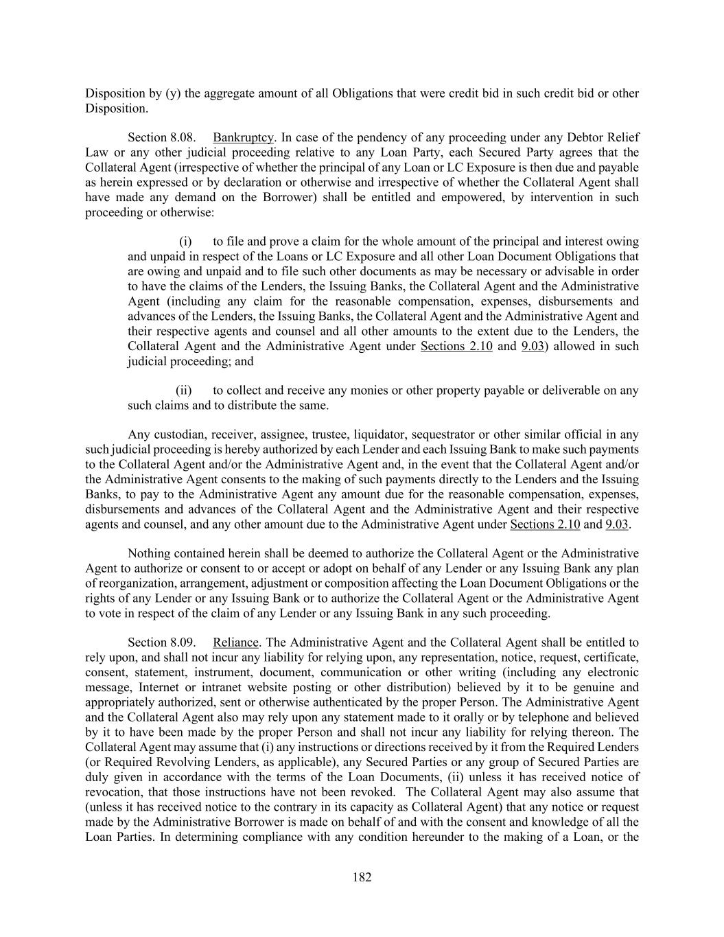 182 Disposition by (y) the aggregate amount of all Obligations that were credit bid in such credit bid or other Disposition. Section 8.08. Bankruptcy. In case of the pendency of any proceeding under any Debtor Relief Law or any other judicial proceeding relative to any Loan Party, each Secured Party agrees that the Collateral Agent (irrespective of whether the principal of any Loan or LC Exposure is then due and payable as herein expressed or by declaration or otherwise and irrespective of whether the Collateral Agent shall have made any demand on the Borrower) shall be entitled and empowered, by intervention in such proceeding or otherwise: (i) to file and prove a claim for the whole amount of the principal and interest owing and unpaid in respect of the Loans or LC Exposure and all other Loan Document Obligations that are owing and unpaid and to file such other documents as may be necessary or advisable in order to have the claims of the Lenders, the Issuing Banks, the Collateral Agent and the Administrative Agent (including any claim for the reasonable compensation, expenses, disbursements and advances of the Lenders, the Issuing Banks, the Collateral Agent and the Administrative Agent and their respective agents and counsel and all other amounts to the extent due to the Lenders, the Collateral Agent and the Administrative Agent under Sections 2.10 and 9.03) allowed in such judicial proceeding; and (ii) to collect and receive any monies or other property payable or deliverable on any such claims and to distribute the same. Any custodian, receiver, assignee, trustee, liquidator, sequestrator or other similar official in any such judicial proceeding is hereby authorized by each Lender and each Issuing Bank to make such payments to the Collateral Agent and/or the Administrative Agent and, in the event that the Collateral Agent and/or the Administrative Agent consents to the making of such payments directly to the Lenders and the Issuing Banks, to pay to the Administrative Agent any amount due for the reasonable compensation, expenses, disbursements and advances of the Collateral Agent and the Administrative Agent and their respective agents and counsel, and any other amount due to the Administrative Agent under Sections 2.10 and 9.03. Nothing contained herein shall be deemed to authorize the Collateral Agent or the Administrative Agent to authorize or consent to or accept or adopt on behalf of any Lender or any Issuing Bank any plan of reorganization, arrangement, adjustment or composition affecting the Loan Document Obligations or the rights of any Lender or any Issuing Bank or to authorize the Collateral Agent or the Administrative Agent to vote in respect of the claim of any Lender or any Issuing Bank in any such proceeding. Section 8.09. Reliance. The Administrative Agent and the Collateral Agent shall be entitled to rely upon, and shall not incur any liability for relying upon, any representation, notice, request, certificate, consent, statement, instrument, document, communication or other writing (including any electronic message, Internet or intranet website posting or other distribution) believed by it to be genuine and appropriately authorized, sent or otherwise authenticated by the proper Person. The Administrative Agent and the Collateral Agent also may rely upon any statement made to it orally or by telephone and believed by it to have been made by the proper Person and shall not incur any liability for relying thereon. The Collateral Agent may assume that (i) any instructions or directions received by it from the Required Lenders (or Required Revolving Lenders, as applicable), any Secured Parties or any group of Secured Parties are duly given in accordance with the terms of the Loan Documents, (ii) unless it has received notice of revocation, that those instructions have not been revoked. The Collateral Agent may also assume that (unless it has received notice to the contrary in its capacity as Collateral Agent) that any notice or request made by the Administrative Borrower is made on behalf of and with the consent and knowledge of all the Loan Parties. In determining compliance with any condition hereunder to the making of a Loan, or the