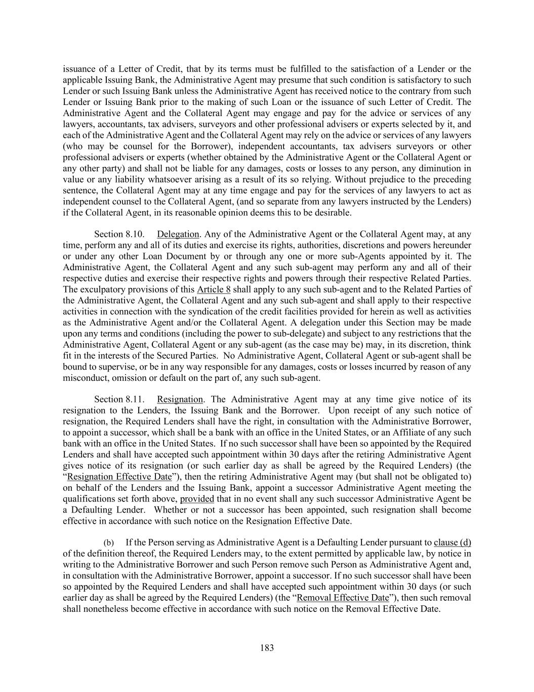 183 issuance of a Letter of Credit, that by its terms must be fulfilled to the satisfaction of a Lender or the applicable Issuing Bank, the Administrative Agent may presume that such condition is satisfactory to such Lender or such Issuing Bank unless the Administrative Agent has received notice to the contrary from such Lender or Issuing Bank prior to the making of such Loan or the issuance of such Letter of Credit. The Administrative Agent and the Collateral Agent may engage and pay for the advice or services of any lawyers, accountants, tax advisers, surveyors and other professional advisers or experts selected by it, and each of the Administrative Agent and the Collateral Agent may rely on the advice or services of any lawyers (who may be counsel for the Borrower), independent accountants, tax advisers surveyors or other professional advisers or experts (whether obtained by the Administrative Agent or the Collateral Agent or any other party) and shall not be liable for any damages, costs or losses to any person, any diminution in value or any liability whatsoever arising as a result of its so relying. Without prejudice to the preceding sentence, the Collateral Agent may at any time engage and pay for the services of any lawyers to act as independent counsel to the Collateral Agent, (and so separate from any lawyers instructed by the Lenders) if the Collateral Agent, in its reasonable opinion deems this to be desirable. Section 8.10. Delegation. Any of the Administrative Agent or the Collateral Agent may, at any time, perform any and all of its duties and exercise its rights, authorities, discretions and powers hereunder or under any other Loan Document by or through any one or more sub-Agents appointed by it. The Administrative Agent, the Collateral Agent and any such sub-agent may perform any and all of their respective duties and exercise their respective rights and powers through their respective Related Parties. The exculpatory provisions of this Article 8 shall apply to any such sub-agent and to the Related Parties of the Administrative Agent, the Collateral Agent and any such sub-agent and shall apply to their respective activities in connection with the syndication of the credit facilities provided for herein as well as activities as the Administrative Agent and/or the Collateral Agent. A delegation under this Section may be made upon any terms and conditions (including the power to sub-delegate) and subject to any restrictions that the Administrative Agent, Collateral Agent or any sub-agent (as the case may be) may, in its discretion, think fit in the interests of the Secured Parties. No Administrative Agent, Collateral Agent or sub-agent shall be bound to supervise, or be in any way responsible for any damages, costs or losses incurred by reason of any misconduct, omission or default on the part of, any such sub-agent. Section 8.11. Resignation. The Administrative Agent may at any time give notice of its resignation to the Lenders, the Issuing Bank and the Borrower. Upon receipt of any such notice of resignation, the Required Lenders shall have the right, in consultation with the Administrative Borrower, to appoint a successor, which shall be a bank with an office in the United States, or an Affiliate of any such bank with an office in the United States. If no such successor shall have been so appointed by the Required Lenders and shall have accepted such appointment within 30 days after the retiring Administrative Agent gives notice of its resignation (or such earlier day as shall be agreed by the Required Lenders) (the “Resignation Effective Date”), then the retiring Administrative Agent may (but shall not be obligated to) on behalf of the Lenders and the Issuing Bank, appoint a successor Administrative Agent meeting the qualifications set forth above, provided that in no event shall any such successor Administrative Agent be a Defaulting Lender. Whether or not a successor has been appointed, such resignation shall become effective in accordance with such notice on the Resignation Effective Date. (b) If the Person serving as Administrative Agent is a Defaulting Lender pursuant to clause (d) of the definition thereof, the Required Lenders may, to the extent permitted by applicable law, by notice in writing to the Administrative Borrower and such Person remove such Person as Administrative Agent and, in consultation with the Administrative Borrower, appoint a successor. If no such successor shall have been so appointed by the Required Lenders and shall have accepted such appointment within 30 days (or such earlier day as shall be agreed by the Required Lenders) (the “Removal Effective Date”), then such removal shall nonetheless become effective in accordance with such notice on the Removal Effective Date.