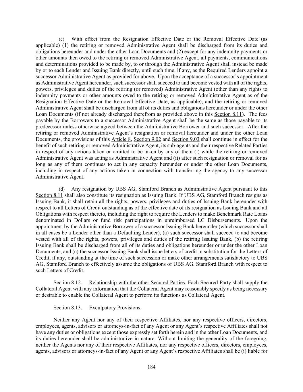 184 (c) With effect from the Resignation Effective Date or the Removal Effective Date (as applicable) (1) the retiring or removed Administrative Agent shall be discharged from its duties and obligations hereunder and under the other Loan Documents and (2) except for any indemnity payments or other amounts then owed to the retiring or removed Administrative Agent, all payments, communications and determinations provided to be made by, to or through the Administrative Agent shall instead be made by or to each Lender and Issuing Bank directly, until such time, if any, as the Required Lenders appoint a successor Administrative Agent as provided for above. Upon the acceptance of a successor’s appointment as Administrative Agent hereunder, such successor shall succeed to and become vested with all of the rights, powers, privileges and duties of the retiring (or removed) Administrative Agent (other than any rights to indemnity payments or other amounts owed to the retiring or removed Administrative Agent as of the Resignation Effective Date or the Removal Effective Date, as applicable), and the retiring or removed Administrative Agent shall be discharged from all of its duties and obligations hereunder or under the other Loan Documents (if not already discharged therefrom as provided above in this Section 8.11). The fees payable by the Borrowers to a successor Administrative Agent shall be the same as those payable to its predecessor unless otherwise agreed between the Administrative Borrower and such successor. After the retiring or removed Administrative Agent’s resignation or removal hereunder and under the other Loan Documents, the provisions of this Article 8, Section 9.02 and Section 9.03 shall continue in effect for the benefit of such retiring or removed Administrative Agent, its sub-agents and their respective Related Parties in respect of any actions taken or omitted to be taken by any of them (i) while the retiring or removed Administrative Agent was acting as Administrative Agent and (ii) after such resignation or removal for as long as any of them continues to act in any capacity hereunder or under the other Loan Documents, including in respect of any actions taken in connection with transferring the agency to any successor Administrative Agent. (d) Any resignation by UBS AG, Stamford Branch as Administrative Agent pursuant to this Section 8.11 shall also constitute its resignation as Issuing Bank. If UBS AG, Stamford Branch resigns as Issuing Bank, it shall retain all the rights, powers, privileges and duties of Issuing Bank hereunder with respect to all Letters of Credit outstanding as of the effective date of its resignation as Issuing Bank and all Obligations with respect thereto, including the right to require the Lenders to make Benchmark Rate Loans denominated in Dollars or fund risk participations in unreimbursed LC Disbursements. Upon the appointment by the Administrative Borrower of a successor Issuing Bank hereunder (which successor shall in all cases be a Lender other than a Defaulting Lender), (a) such successor shall succeed to and become vested with all of the rights, powers, privileges and duties of the retiring Issuing Bank, (b) the retiring Issuing Bank shall be discharged from all of its duties and obligations hereunder or under the other Loan Documents, and (c) the successor Issuing Bank shall issue letters of credit in substitution for the Letters of Credit, if any, outstanding at the time of such succession or make other arrangements satisfactory to UBS AG, Stamford Branch to effectively assume the obligations of UBS AG. Stamford Branch with respect to such Letters of Credit. Section 8.12. Relationship with the other Secured Parties. Each Secured Party shall supply the Collateral Agent with any information that the Collateral Agent may reasonably specify as being necessary or desirable to enable the Collateral Agent to perform its functions as Collateral Agent. Section 8.13. Exculpatory Provisions. Neither any Agent nor any of their respective Affiliates, nor any respective officers, directors, employees, agents, advisors or attorneys-in-fact of any Agent or any Agent’s respective Affiliates shall not have any duties or obligations except those expressly set forth herein and in the other Loan Documents, and its duties hereunder shall be administrative in nature. Without limiting the generality of the foregoing, neither the Agents nor any of their respective Affiliates, nor any respective officers, directors, employees, agents, advisors or attorneys-in-fact of any Agent or any Agent’s respective Affiliates shall be (i) liable for