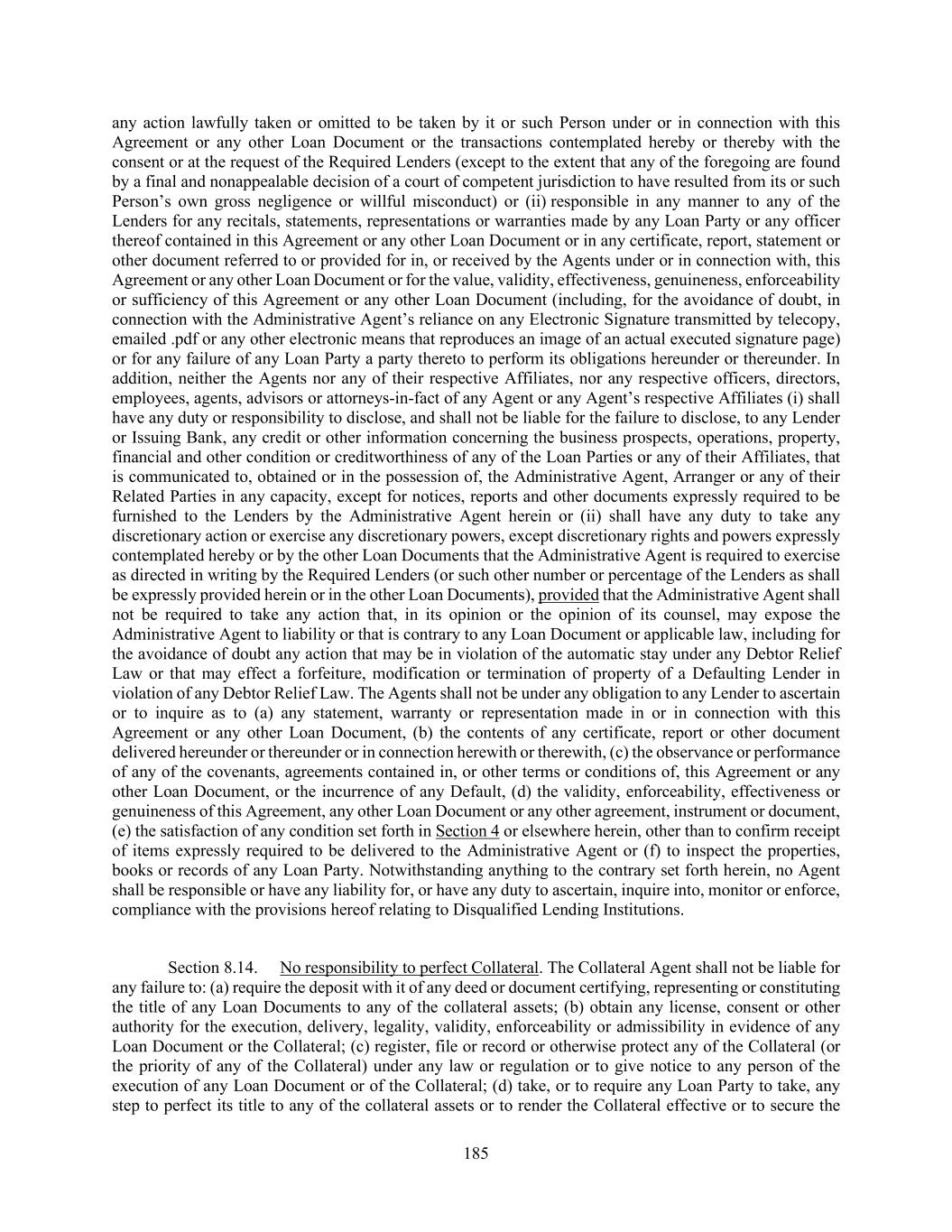 185 any action lawfully taken or omitted to be taken by it or such Person under or in connection with this Agreement or any other Loan Document or the transactions contemplated hereby or thereby with the consent or at the request of the Required Lenders (except to the extent that any of the foregoing are found by a final and nonappealable decision of a court of competent jurisdiction to have resulted from its or such Person’s own gross negligence or willful misconduct) or (ii) responsible in any manner to any of the Lenders for any recitals, statements, representations or warranties made by any Loan Party or any officer thereof contained in this Agreement or any other Loan Document or in any certificate, report, statement or other document referred to or provided for in, or received by the Agents under or in connection with, this Agreement or any other Loan Document or for the value, validity, effectiveness, genuineness, enforceability or sufficiency of this Agreement or any other Loan Document (including, for the avoidance of doubt, in connection with the Administrative Agent’s reliance on any Electronic Signature transmitted by telecopy, emailed .pdf or any other electronic means that reproduces an image of an actual executed signature page) or for any failure of any Loan Party a party thereto to perform its obligations hereunder or thereunder. In addition, neither the Agents nor any of their respective Affiliates, nor any respective officers, directors, employees, agents, advisors or attorneys-in-fact of any Agent or any Agent’s respective Affiliates (i) shall have any duty or responsibility to disclose, and shall not be liable for the failure to disclose, to any Lender or Issuing Bank, any credit or other information concerning the business prospects, operations, property, financial and other condition or creditworthiness of any of the Loan Parties or any of their Affiliates, that is communicated to, obtained or in the possession of, the Administrative Agent, Arranger or any of their Related Parties in any capacity, except for notices, reports and other documents expressly required to be furnished to the Lenders by the Administrative Agent herein or (ii) shall have any duty to take any discretionary action or exercise any discretionary powers, except discretionary rights and powers expressly contemplated hereby or by the other Loan Documents that the Administrative Agent is required to exercise as directed in writing by the Required Lenders (or such other number or percentage of the Lenders as shall be expressly provided herein or in the other Loan Documents), provided that the Administrative Agent shall not be required to take any action that, in its opinion or the opinion of its counsel, may expose the Administrative Agent to liability or that is contrary to any Loan Document or applicable law, including for the avoidance of doubt any action that may be in violation of the automatic stay under any Debtor Relief Law or that may effect a forfeiture, modification or termination of property of a Defaulting Lender in violation of any Debtor Relief Law. The Agents shall not be under any obligation to any Lender to ascertain or to inquire as to (a) any statement, warranty or representation made in or in connection with this Agreement or any other Loan Document, (b) the contents of any certificate, report or other document delivered hereunder or thereunder or in connection herewith or therewith, (c) the observance or performance of any of the covenants, agreements contained in, or other terms or conditions of, this Agreement or any other Loan Document, or the incurrence of any Default, (d) the validity, enforceability, effectiveness or genuineness of this Agreement, any other Loan Document or any other agreement, instrument or document, (e) the satisfaction of any condition set forth in Section 4 or elsewhere herein, other than to confirm receipt of items expressly required to be delivered to the Administrative Agent or (f) to inspect the properties, books or records of any Loan Party. Notwithstanding anything to the contrary set forth herein, no Agent shall be responsible or have any liability for, or have any duty to ascertain, inquire into, monitor or enforce, compliance with the provisions hereof relating to Disqualified Lending Institutions. Section 8.14. No responsibility to perfect Collateral. The Collateral Agent shall not be liable for any failure to: (a) require the deposit with it of any deed or document certifying, representing or constituting the title of any Loan Documents to any of the collateral assets; (b) obtain any license, consent or other authority for the execution, delivery, legality, validity, enforceability or admissibility in evidence of any Loan Document or the Collateral; (c) register, file or record or otherwise protect any of the Collateral (or the priority of any of the Collateral) under any law or regulation or to give notice to any person of the execution of any Loan Document or of the Collateral; (d) take, or to require any Loan Party to take, any step to perfect its title to any of the collateral assets or to render the Collateral effective or to secure the