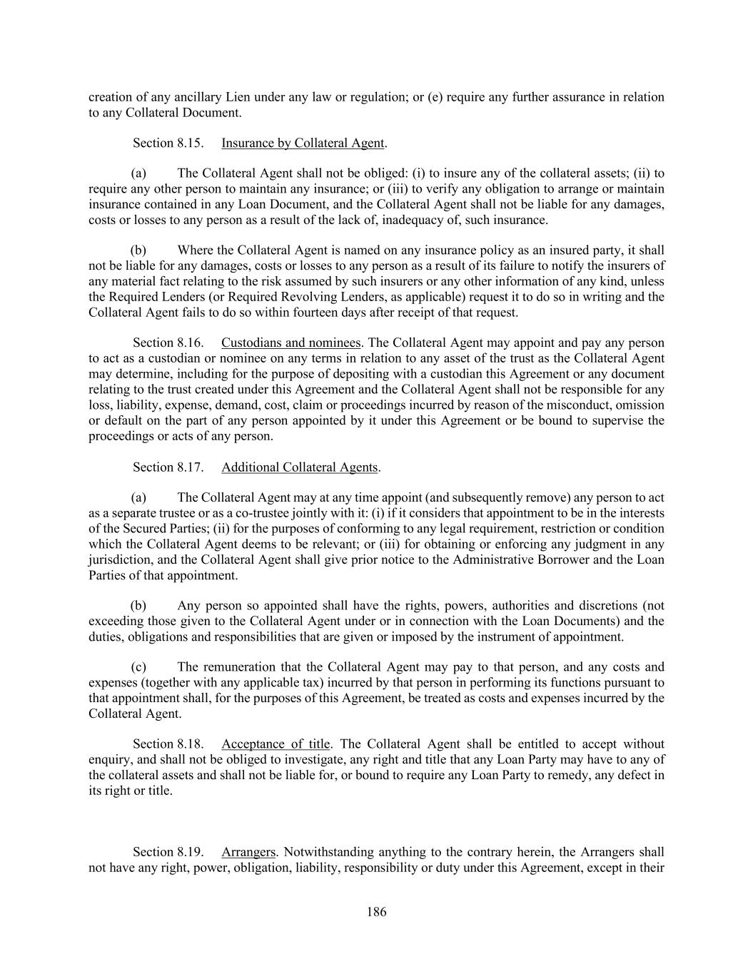 186 creation of any ancillary Lien under any law or regulation; or (e) require any further assurance in relation to any Collateral Document. Section 8.15. Insurance by Collateral Agent. (a) The Collateral Agent shall not be obliged: (i) to insure any of the collateral assets; (ii) to require any other person to maintain any insurance; or (iii) to verify any obligation to arrange or maintain insurance contained in any Loan Document, and the Collateral Agent shall not be liable for any damages, costs or losses to any person as a result of the lack of, inadequacy of, such insurance. (b) Where the Collateral Agent is named on any insurance policy as an insured party, it shall not be liable for any damages, costs or losses to any person as a result of its failure to notify the insurers of any material fact relating to the risk assumed by such insurers or any other information of any kind, unless the Required Lenders (or Required Revolving Lenders, as applicable) request it to do so in writing and the Collateral Agent fails to do so within fourteen days after receipt of that request. Section 8.16. Custodians and nominees. The Collateral Agent may appoint and pay any person to act as a custodian or nominee on any terms in relation to any asset of the trust as the Collateral Agent may determine, including for the purpose of depositing with a custodian this Agreement or any document relating to the trust created under this Agreement and the Collateral Agent shall not be responsible for any loss, liability, expense, demand, cost, claim or proceedings incurred by reason of the misconduct, omission or default on the part of any person appointed by it under this Agreement or be bound to supervise the proceedings or acts of any person. Section 8.17. Additional Collateral Agents. (a) The Collateral Agent may at any time appoint (and subsequently remove) any person to act as a separate trustee or as a co-trustee jointly with it: (i) if it considers that appointment to be in the interests of the Secured Parties; (ii) for the purposes of conforming to any legal requirement, restriction or condition which the Collateral Agent deems to be relevant; or (iii) for obtaining or enforcing any judgment in any jurisdiction, and the Collateral Agent shall give prior notice to the Administrative Borrower and the Loan Parties of that appointment. (b) Any person so appointed shall have the rights, powers, authorities and discretions (not exceeding those given to the Collateral Agent under or in connection with the Loan Documents) and the duties, obligations and responsibilities that are given or imposed by the instrument of appointment. (c) The remuneration that the Collateral Agent may pay to that person, and any costs and expenses (together with any applicable tax) incurred by that person in performing its functions pursuant to that appointment shall, for the purposes of this Agreement, be treated as costs and expenses incurred by the Collateral Agent. Section 8.18. Acceptance of title. The Collateral Agent shall be entitled to accept without enquiry, and shall not be obliged to investigate, any right and title that any Loan Party may have to any of the collateral assets and shall not be liable for, or bound to require any Loan Party to remedy, any defect in its right or title. Section 8.19. Arrangers. Notwithstanding anything to the contrary herein, the Arrangers shall not have any right, power, obligation, liability, responsibility or duty under this Agreement, except in their