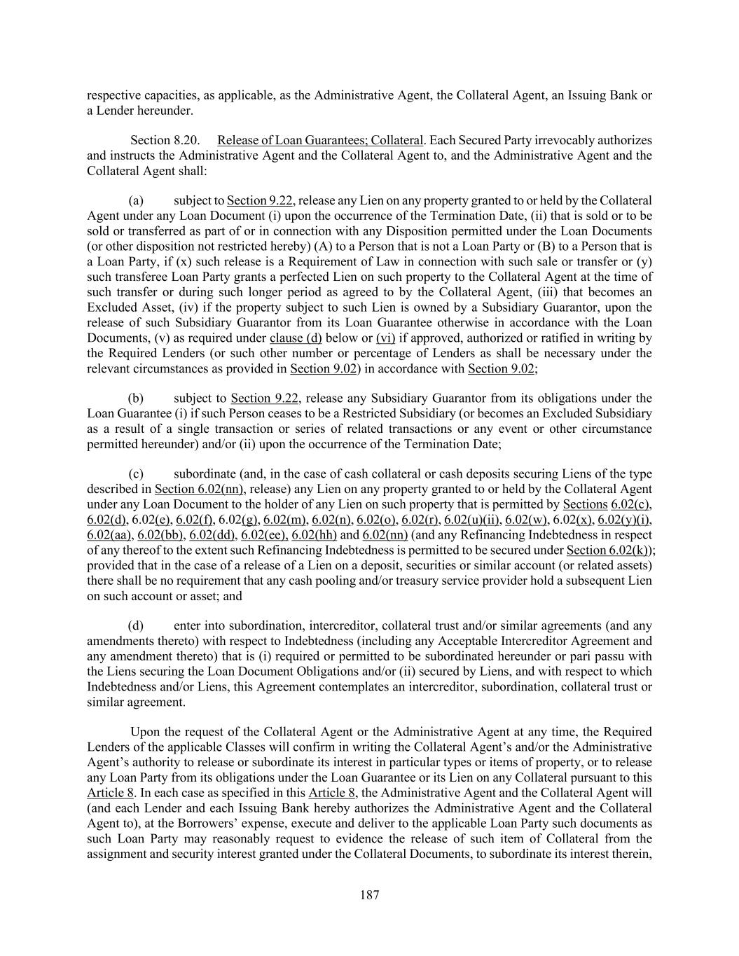 187 respective capacities, as applicable, as the Administrative Agent, the Collateral Agent, an Issuing Bank or a Lender hereunder. Section 8.20. Release of Loan Guarantees; Collateral. Each Secured Party irrevocably authorizes and instructs the Administrative Agent and the Collateral Agent to, and the Administrative Agent and the Collateral Agent shall: (a) subject to Section 9.22, release any Lien on any property granted to or held by the Collateral Agent under any Loan Document (i) upon the occurrence of the Termination Date, (ii) that is sold or to be sold or transferred as part of or in connection with any Disposition permitted under the Loan Documents (or other disposition not restricted hereby) (A) to a Person that is not a Loan Party or (B) to a Person that is a Loan Party, if (x) such release is a Requirement of Law in connection with such sale or transfer or (y) such transferee Loan Party grants a perfected Lien on such property to the Collateral Agent at the time of such transfer or during such longer period as agreed to by the Collateral Agent, (iii) that becomes an Excluded Asset, (iv) if the property subject to such Lien is owned by a Subsidiary Guarantor, upon the release of such Subsidiary Guarantor from its Loan Guarantee otherwise in accordance with the Loan Documents, (v) as required under clause (d) below or (vi) if approved, authorized or ratified in writing by the Required Lenders (or such other number or percentage of Lenders as shall be necessary under the relevant circumstances as provided in Section 9.02) in accordance with Section 9.02; (b) subject to Section 9.22, release any Subsidiary Guarantor from its obligations under the Loan Guarantee (i) if such Person ceases to be a Restricted Subsidiary (or becomes an Excluded Subsidiary as a result of a single transaction or series of related transactions or any event or other circumstance permitted hereunder) and/or (ii) upon the occurrence of the Termination Date; (c) subordinate (and, in the case of cash collateral or cash deposits securing Liens of the type described in Section 6.02(nn), release) any Lien on any property granted to or held by the Collateral Agent under any Loan Document to the holder of any Lien on such property that is permitted by Sections 6.02(c), 6.02(d), 6.02(e), 6.02(f), 6.02(g), 6.02(m), 6.02(n), 6.02(o), 6.02(r), 6.02(u)(ii), 6.02(w), 6.02(x), 6.02(y)(i), 6.02(aa), 6.02(bb), 6.02(dd), 6.02(ee), 6.02(hh) and 6.02(nn) (and any Refinancing Indebtedness in respect of any thereof to the extent such Refinancing Indebtedness is permitted to be secured under Section 6.02(k)); provided that in the case of a release of a Lien on a deposit, securities or similar account (or related assets) there shall be no requirement that any cash pooling and/or treasury service provider hold a subsequent Lien on such account or asset; and (d) enter into subordination, intercreditor, collateral trust and/or similar agreements (and any amendments thereto) with respect to Indebtedness (including any Acceptable Intercreditor Agreement and any amendment thereto) that is (i) required or permitted to be subordinated hereunder or pari passu with the Liens securing the Loan Document Obligations and/or (ii) secured by Liens, and with respect to which Indebtedness and/or Liens, this Agreement contemplates an intercreditor, subordination, collateral trust or similar agreement. Upon the request of the Collateral Agent or the Administrative Agent at any time, the Required Lenders of the applicable Classes will confirm in writing the Collateral Agent’s and/or the Administrative Agent’s authority to release or subordinate its interest in particular types or items of property, or to release any Loan Party from its obligations under the Loan Guarantee or its Lien on any Collateral pursuant to this Article 8. In each case as specified in this Article 8, the Administrative Agent and the Collateral Agent will (and each Lender and each Issuing Bank hereby authorizes the Administrative Agent and the Collateral Agent to), at the Borrowers’ expense, execute and deliver to the applicable Loan Party such documents as such Loan Party may reasonably request to evidence the release of such item of Collateral from the assignment and security interest granted under the Collateral Documents, to subordinate its interest therein,