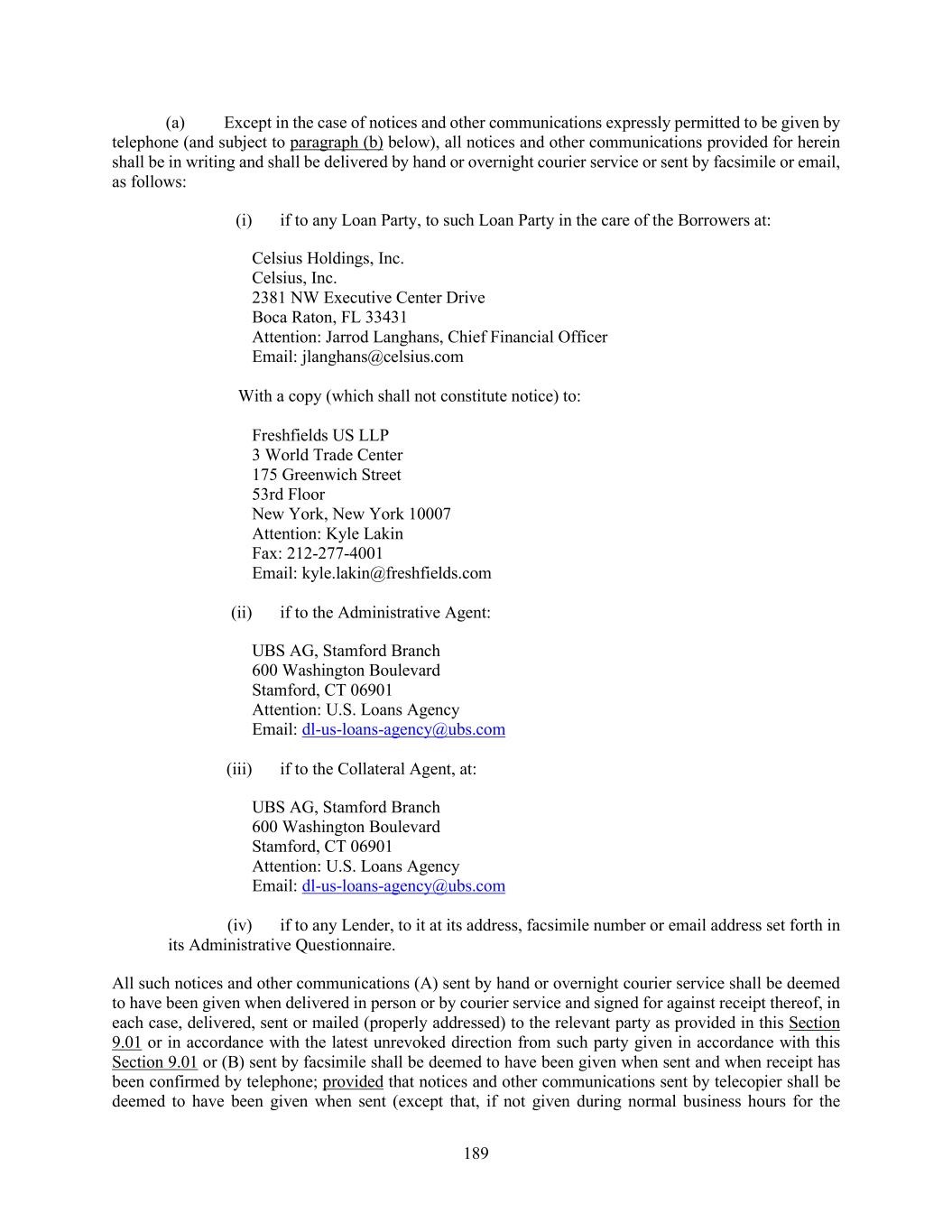 189 (a) Except in the case of notices and other communications expressly permitted to be given by telephone (and subject to paragraph (b) below), all notices and other communications provided for herein shall be in writing and shall be delivered by hand or overnight courier service or sent by facsimile or email, as follows: (i) if to any Loan Party, to such Loan Party in the care of the Borrowers at: Celsius Holdings, Inc. Celsius, Inc. 2381 NW Executive Center Drive Boca Raton, FL 33431 Attention: Jarrod Langhans, Chief Financial Officer Email: jlanghans@celsius.com With a copy (which shall not constitute notice) to: Freshfields US LLP 3 World Trade Center 175 Greenwich Street 53rd Floor New York, New York 10007 Attention: Kyle Lakin Fax: 212-277-4001 Email: kyle.lakin@freshfields.com (ii) if to the Administrative Agent: UBS AG, Stamford Branch 600 Washington Boulevard Stamford, CT 06901 Attention: U.S. Loans Agency Email: dl-us-loans-agency@ubs.com (iii) if to the Collateral Agent, at: UBS AG, Stamford Branch 600 Washington Boulevard Stamford, CT 06901 Attention: U.S. Loans Agency Email: dl-us-loans-agency@ubs.com (iv) if to any Lender, to it at its address, facsimile number or email address set forth in its Administrative Questionnaire. All such notices and other communications (A) sent by hand or overnight courier service shall be deemed to have been given when delivered in person or by courier service and signed for against receipt thereof, in each case, delivered, sent or mailed (properly addressed) to the relevant party as provided in this Section 9.01 or in accordance with the latest unrevoked direction from such party given in accordance with this Section 9.01 or (B) sent by facsimile shall be deemed to have been given when sent and when receipt has been confirmed by telephone; provided that notices and other communications sent by telecopier shall be deemed to have been given when sent (except that, if not given during normal business hours for the