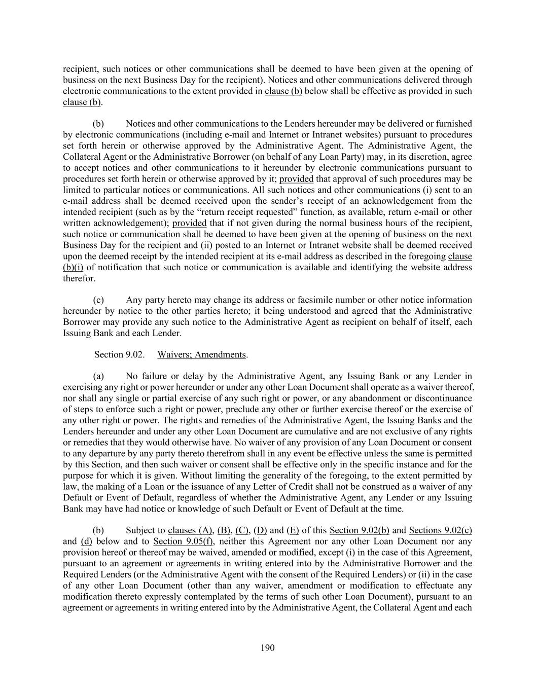 190 recipient, such notices or other communications shall be deemed to have been given at the opening of business on the next Business Day for the recipient). Notices and other communications delivered through electronic communications to the extent provided in clause (b) below shall be effective as provided in such clause (b). (b) Notices and other communications to the Lenders hereunder may be delivered or furnished by electronic communications (including e-mail and Internet or Intranet websites) pursuant to procedures set forth herein or otherwise approved by the Administrative Agent. The Administrative Agent, the Collateral Agent or the Administrative Borrower (on behalf of any Loan Party) may, in its discretion, agree to accept notices and other communications to it hereunder by electronic communications pursuant to procedures set forth herein or otherwise approved by it; provided that approval of such procedures may be limited to particular notices or communications. All such notices and other communications (i) sent to an e-mail address shall be deemed received upon the sender’s receipt of an acknowledgement from the intended recipient (such as by the “return receipt requested” function, as available, return e-mail or other written acknowledgement); provided that if not given during the normal business hours of the recipient, such notice or communication shall be deemed to have been given at the opening of business on the next Business Day for the recipient and (ii) posted to an Internet or Intranet website shall be deemed received upon the deemed receipt by the intended recipient at its e-mail address as described in the foregoing clause (b)(i) of notification that such notice or communication is available and identifying the website address therefor. (c) Any party hereto may change its address or facsimile number or other notice information hereunder by notice to the other parties hereto; it being understood and agreed that the Administrative Borrower may provide any such notice to the Administrative Agent as recipient on behalf of itself, each Issuing Bank and each Lender. Section 9.02. Waivers; Amendments. (a) No failure or delay by the Administrative Agent, any Issuing Bank or any Lender in exercising any right or power hereunder or under any other Loan Document shall operate as a waiver thereof, nor shall any single or partial exercise of any such right or power, or any abandonment or discontinuance of steps to enforce such a right or power, preclude any other or further exercise thereof or the exercise of any other right or power. The rights and remedies of the Administrative Agent, the Issuing Banks and the Lenders hereunder and under any other Loan Document are cumulative and are not exclusive of any rights or remedies that they would otherwise have. No waiver of any provision of any Loan Document or consent to any departure by any party thereto therefrom shall in any event be effective unless the same is permitted by this Section, and then such waiver or consent shall be effective only in the specific instance and for the purpose for which it is given. Without limiting the generality of the foregoing, to the extent permitted by law, the making of a Loan or the issuance of any Letter of Credit shall not be construed as a waiver of any Default or Event of Default, regardless of whether the Administrative Agent, any Lender or any Issuing Bank may have had notice or knowledge of such Default or Event of Default at the time. (b) Subject to clauses (A), (B), (C), (D) and (E) of this Section 9.02(b) and Sections 9.02(c) and (d) below and to Section 9.05(f), neither this Agreement nor any other Loan Document nor any provision hereof or thereof may be waived, amended or modified, except (i) in the case of this Agreement, pursuant to an agreement or agreements in writing entered into by the Administrative Borrower and the Required Lenders (or the Administrative Agent with the consent of the Required Lenders) or (ii) in the case of any other Loan Document (other than any waiver, amendment or modification to effectuate any modification thereto expressly contemplated by the terms of such other Loan Document), pursuant to an agreement or agreements in writing entered into by the Administrative Agent, the Collateral Agent and each