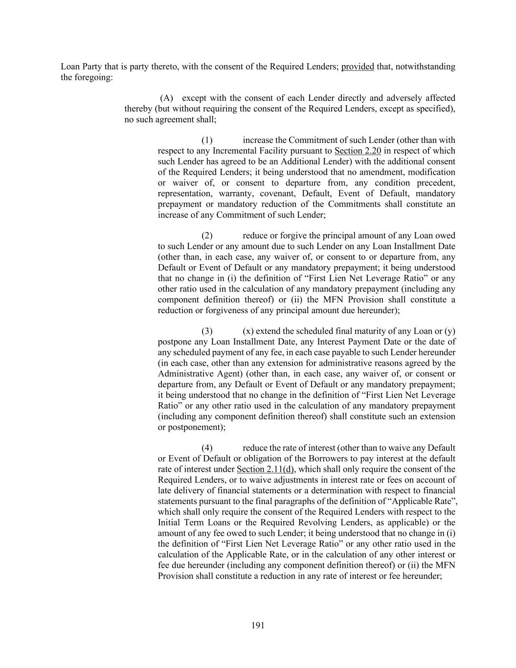 191 Loan Party that is party thereto, with the consent of the Required Lenders; provided that, notwithstanding the foregoing: (A) except with the consent of each Lender directly and adversely affected thereby (but without requiring the consent of the Required Lenders, except as specified), no such agreement shall; (1) increase the Commitment of such Lender (other than with respect to any Incremental Facility pursuant to Section 2.20 in respect of which such Lender has agreed to be an Additional Lender) with the additional consent of the Required Lenders; it being understood that no amendment, modification or waiver of, or consent to departure from, any condition precedent, representation, warranty, covenant, Default, Event of Default, mandatory prepayment or mandatory reduction of the Commitments shall constitute an increase of any Commitment of such Lender; (2) reduce or forgive the principal amount of any Loan owed to such Lender or any amount due to such Lender on any Loan Installment Date (other than, in each case, any waiver of, or consent to or departure from, any Default or Event of Default or any mandatory prepayment; it being understood that no change in (i) the definition of “First Lien Net Leverage Ratio” or any other ratio used in the calculation of any mandatory prepayment (including any component definition thereof) or (ii) the MFN Provision shall constitute a reduction or forgiveness of any principal amount due hereunder); (3) (x) extend the scheduled final maturity of any Loan or (y) postpone any Loan Installment Date, any Interest Payment Date or the date of any scheduled payment of any fee, in each case payable to such Lender hereunder (in each case, other than any extension for administrative reasons agreed by the Administrative Agent) (other than, in each case, any waiver of, or consent or departure from, any Default or Event of Default or any mandatory prepayment; it being understood that no change in the definition of “First Lien Net Leverage Ratio” or any other ratio used in the calculation of any mandatory prepayment (including any component definition thereof) shall constitute such an extension or postponement); (4) reduce the rate of interest (other than to waive any Default or Event of Default or obligation of the Borrowers to pay interest at the default rate of interest under Section 2.11(d), which shall only require the consent of the Required Lenders, or to waive adjustments in interest rate or fees on account of late delivery of financial statements or a determination with respect to financial statements pursuant to the final paragraphs of the definition of “Applicable Rate”, which shall only require the consent of the Required Lenders with respect to the Initial Term Loans or the Required Revolving Lenders, as applicable) or the amount of any fee owed to such Lender; it being understood that no change in (i) the definition of “First Lien Net Leverage Ratio” or any other ratio used in the calculation of the Applicable Rate, or in the calculation of any other interest or fee due hereunder (including any component definition thereof) or (ii) the MFN Provision shall constitute a reduction in any rate of interest or fee hereunder;