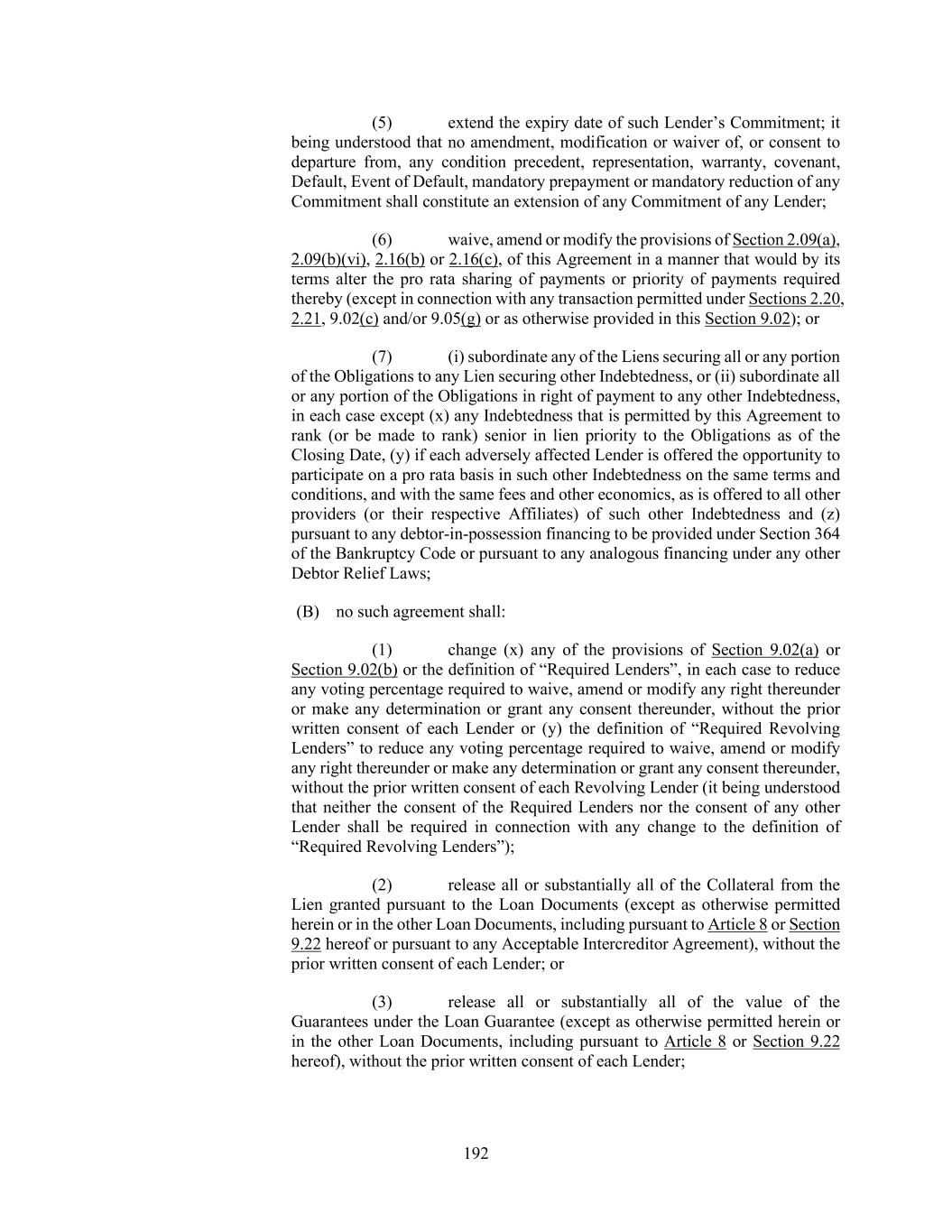 192 (5) extend the expiry date of such Lender’s Commitment; it being understood that no amendment, modification or waiver of, or consent to departure from, any condition precedent, representation, warranty, covenant, Default, Event of Default, mandatory prepayment or mandatory reduction of any Commitment shall constitute an extension of any Commitment of any Lender; (6) waive, amend or modify the provisions of Section 2.09(a), 2.09(b)(vi), 2.16(b) or 2.16(c), of this Agreement in a manner that would by its terms alter the pro rata sharing of payments or priority of payments required thereby (except in connection with any transaction permitted under Sections 2.20, 2.21, 9.02(c) and/or 9.05(g) or as otherwise provided in this Section 9.02); or (7) (i) subordinate any of the Liens securing all or any portion of the Obligations to any Lien securing other Indebtedness, or (ii) subordinate all or any portion of the Obligations in right of payment to any other Indebtedness, in each case except (x) any Indebtedness that is permitted by this Agreement to rank (or be made to rank) senior in lien priority to the Obligations as of the Closing Date, (y) if each adversely affected Lender is offered the opportunity to participate on a pro rata basis in such other Indebtedness on the same terms and conditions, and with the same fees and other economics, as is offered to all other providers (or their respective Affiliates) of such other Indebtedness and (z) pursuant to any debtor-in-possession financing to be provided under Section 364 of the Bankruptcy Code or pursuant to any analogous financing under any other Debtor Relief Laws; (B) no such agreement shall: (1) change (x) any of the provisions of Section 9.02(a) or Section 9.02(b) or the definition of “Required Lenders”, in each case to reduce any voting percentage required to waive, amend or modify any right thereunder or make any determination or grant any consent thereunder, without the prior written consent of each Lender or (y) the definition of “Required Revolving Lenders” to reduce any voting percentage required to waive, amend or modify any right thereunder or make any determination or grant any consent thereunder, without the prior written consent of each Revolving Lender (it being understood that neither the consent of the Required Lenders nor the consent of any other Lender shall be required in connection with any change to the definition of “Required Revolving Lenders”); (2) release all or substantially all of the Collateral from the Lien granted pursuant to the Loan Documents (except as otherwise permitted herein or in the other Loan Documents, including pursuant to Article 8 or Section 9.22 hereof or pursuant to any Acceptable Intercreditor Agreement), without the prior written consent of each Lender; or (3) release all or substantially all of the value of the Guarantees under the Loan Guarantee (except as otherwise permitted herein or in the other Loan Documents, including pursuant to Article 8 or Section 9.22 hereof), without the prior written consent of each Lender;