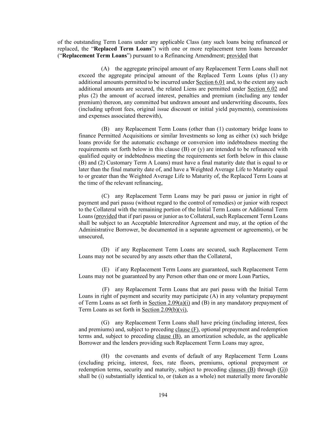 194 of the outstanding Term Loans under any applicable Class (any such loans being refinanced or replaced, the “Replaced Term Loans”) with one or more replacement term loans hereunder (“Replacement Term Loans”) pursuant to a Refinancing Amendment; provided that (A) the aggregate principal amount of any Replacement Term Loans shall not exceed the aggregate principal amount of the Replaced Term Loans (plus (1) any additional amounts permitted to be incurred under Section 6.01 and, to the extent any such additional amounts are secured, the related Liens are permitted under Section 6.02 and plus (2) the amount of accrued interest, penalties and premium (including any tender premium) thereon, any committed but undrawn amount and underwriting discounts, fees (including upfront fees, original issue discount or initial yield payments), commissions and expenses associated therewith), (B) any Replacement Term Loans (other than (1) customary bridge loans to finance Permitted Acquisitions or similar Investments so long as either (x) such bridge loans provide for the automatic exchange or conversion into indebtedness meeting the requirements set forth below in this clause (B) or (y) are intended to be refinanced with qualified equity or indebtedness meeting the requirements set forth below in this clause (B) and (2) Customary Term A Loans) must have a final maturity date that is equal to or later than the final maturity date of, and have a Weighted Average Life to Maturity equal to or greater than the Weighted Average Life to Maturity of, the Replaced Term Loans at the time of the relevant refinancing, (C) any Replacement Term Loans may be pari passu or junior in right of payment and pari passu (without regard to the control of remedies) or junior with respect to the Collateral with the remaining portion of the Initial Term Loans or Additional Term Loans (provided that if pari passu or junior as to Collateral, such Replacement Term Loans shall be subject to an Acceptable Intercreditor Agreement and may, at the option of the Administrative Borrower, be documented in a separate agreement or agreements), or be unsecured, (D) if any Replacement Term Loans are secured, such Replacement Term Loans may not be secured by any assets other than the Collateral, (E) if any Replacement Term Loans are guaranteed, such Replacement Term Loans may not be guaranteed by any Person other than one or more Loan Parties, (F) any Replacement Term Loans that are pari passu with the Initial Term Loans in right of payment and security may participate (A) in any voluntary prepayment of Term Loans as set forth in Section 2.09(a)(i) and (B) in any mandatory prepayment of Term Loans as set forth in Section 2.09(b)(vi), (G) any Replacement Term Loans shall have pricing (including interest, fees and premiums) and, subject to preceding clause (F), optional prepayment and redemption terms and, subject to preceding clause (B), an amortization schedule, as the applicable Borrower and the lenders providing such Replacement Term Loans may agree, (H) the covenants and events of default of any Replacement Term Loans (excluding pricing, interest, fees, rate floors, premiums, optional prepayment or redemption terms, security and maturity, subject to preceding clauses (B) through (G)) shall be (i) substantially identical to, or (taken as a whole) not materially more favorable