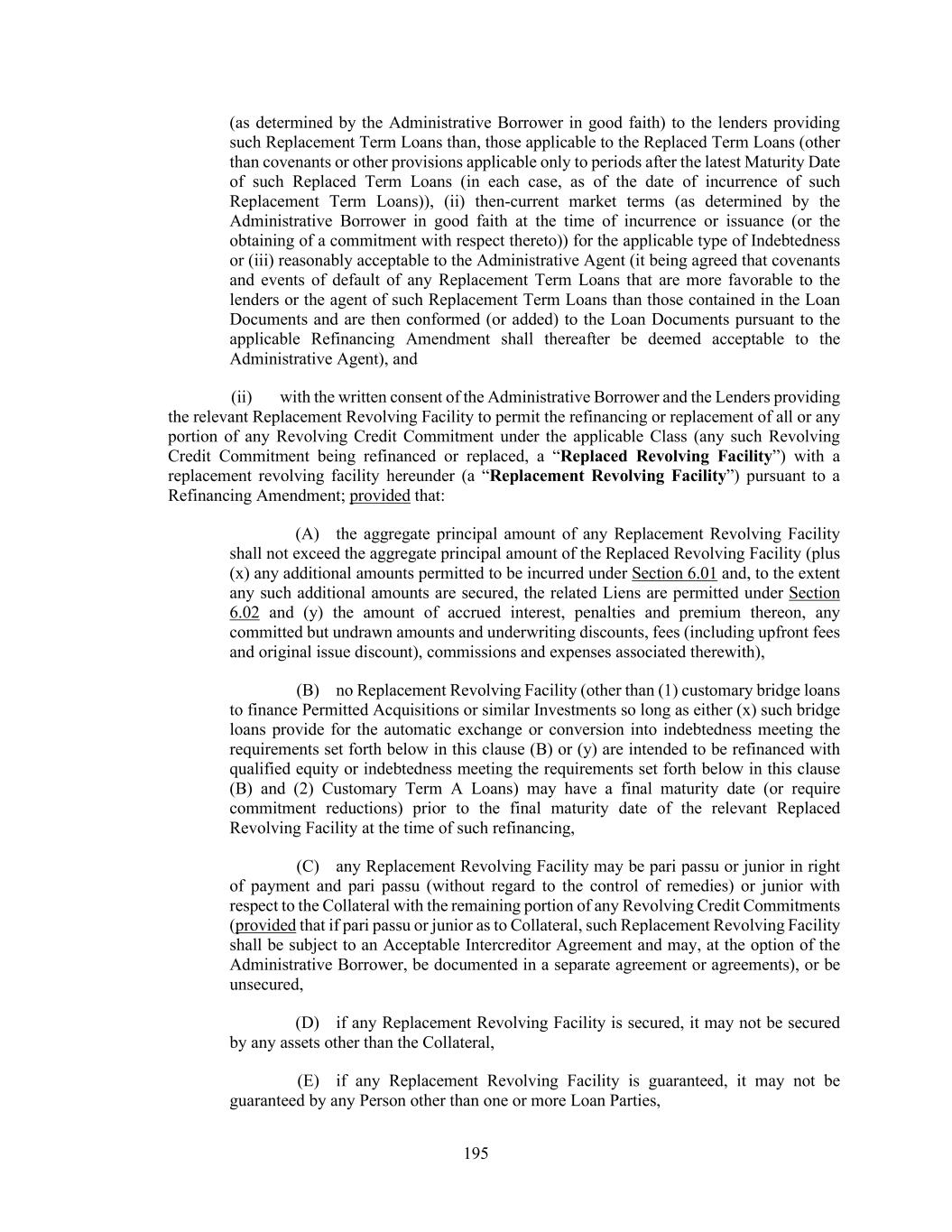 195 (as determined by the Administrative Borrower in good faith) to the lenders providing such Replacement Term Loans than, those applicable to the Replaced Term Loans (other than covenants or other provisions applicable only to periods after the latest Maturity Date of such Replaced Term Loans (in each case, as of the date of incurrence of such Replacement Term Loans)), (ii) then-current market terms (as determined by the Administrative Borrower in good faith at the time of incurrence or issuance (or the obtaining of a commitment with respect thereto)) for the applicable type of Indebtedness or (iii) reasonably acceptable to the Administrative Agent (it being agreed that covenants and events of default of any Replacement Term Loans that are more favorable to the lenders or the agent of such Replacement Term Loans than those contained in the Loan Documents and are then conformed (or added) to the Loan Documents pursuant to the applicable Refinancing Amendment shall thereafter be deemed acceptable to the Administrative Agent), and (ii) with the written consent of the Administrative Borrower and the Lenders providing the relevant Replacement Revolving Facility to permit the refinancing or replacement of all or any portion of any Revolving Credit Commitment under the applicable Class (any such Revolving Credit Commitment being refinanced or replaced, a “Replaced Revolving Facility”) with a replacement revolving facility hereunder (a “Replacement Revolving Facility”) pursuant to a Refinancing Amendment; provided that: (A) the aggregate principal amount of any Replacement Revolving Facility shall not exceed the aggregate principal amount of the Replaced Revolving Facility (plus (x) any additional amounts permitted to be incurred under Section 6.01 and, to the extent any such additional amounts are secured, the related Liens are permitted under Section 6.02 and (y) the amount of accrued interest, penalties and premium thereon, any committed but undrawn amounts and underwriting discounts, fees (including upfront fees and original issue discount), commissions and expenses associated therewith), (B) no Replacement Revolving Facility (other than (1) customary bridge loans to finance Permitted Acquisitions or similar Investments so long as either (x) such bridge loans provide for the automatic exchange or conversion into indebtedness meeting the requirements set forth below in this clause (B) or (y) are intended to be refinanced with qualified equity or indebtedness meeting the requirements set forth below in this clause (B) and (2) Customary Term A Loans) may have a final maturity date (or require commitment reductions) prior to the final maturity date of the relevant Replaced Revolving Facility at the time of such refinancing, (C) any Replacement Revolving Facility may be pari passu or junior in right of payment and pari passu (without regard to the control of remedies) or junior with respect to the Collateral with the remaining portion of any Revolving Credit Commitments (provided that if pari passu or junior as to Collateral, such Replacement Revolving Facility shall be subject to an Acceptable Intercreditor Agreement and may, at the option of the Administrative Borrower, be documented in a separate agreement or agreements), or be unsecured, (D) if any Replacement Revolving Facility is secured, it may not be secured by any assets other than the Collateral, (E) if any Replacement Revolving Facility is guaranteed, it may not be guaranteed by any Person other than one or more Loan Parties,