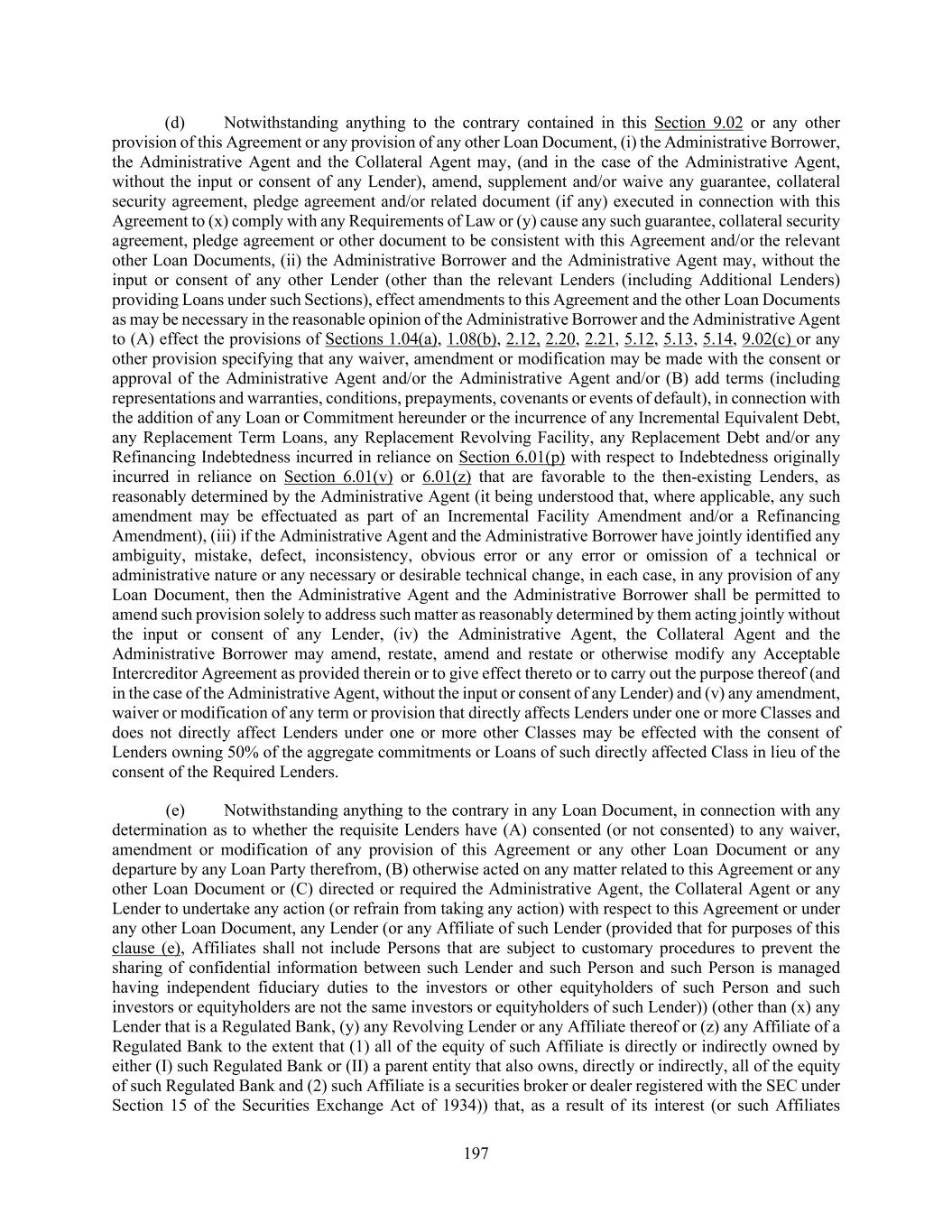 197 (d) Notwithstanding anything to the contrary contained in this Section 9.02 or any other provision of this Agreement or any provision of any other Loan Document, (i) the Administrative Borrower, the Administrative Agent and the Collateral Agent may, (and in the case of the Administrative Agent, without the input or consent of any Lender), amend, supplement and/or waive any guarantee, collateral security agreement, pledge agreement and/or related document (if any) executed in connection with this Agreement to (x) comply with any Requirements of Law or (y) cause any such guarantee, collateral security agreement, pledge agreement or other document to be consistent with this Agreement and/or the relevant other Loan Documents, (ii) the Administrative Borrower and the Administrative Agent may, without the input or consent of any other Lender (other than the relevant Lenders (including Additional Lenders) providing Loans under such Sections), effect amendments to this Agreement and the other Loan Documents as may be necessary in the reasonable opinion of the Administrative Borrower and the Administrative Agent to (A) effect the provisions of Sections 1.04(a), 1.08(b), 2.12, 2.20, 2.21, 5.12, 5.13, 5.14, 9.02(c) or any other provision specifying that any waiver, amendment or modification may be made with the consent or approval of the Administrative Agent and/or the Administrative Agent and/or (B) add terms (including representations and warranties, conditions, prepayments, covenants or events of default), in connection with the addition of any Loan or Commitment hereunder or the incurrence of any Incremental Equivalent Debt, any Replacement Term Loans, any Replacement Revolving Facility, any Replacement Debt and/or any Refinancing Indebtedness incurred in reliance on Section 6.01(p) with respect to Indebtedness originally incurred in reliance on Section 6.01(v) or 6.01(z) that are favorable to the then-existing Lenders, as reasonably determined by the Administrative Agent (it being understood that, where applicable, any such amendment may be effectuated as part of an Incremental Facility Amendment and/or a Refinancing Amendment), (iii) if the Administrative Agent and the Administrative Borrower have jointly identified any ambiguity, mistake, defect, inconsistency, obvious error or any error or omission of a technical or administrative nature or any necessary or desirable technical change, in each case, in any provision of any Loan Document, then the Administrative Agent and the Administrative Borrower shall be permitted to amend such provision solely to address such matter as reasonably determined by them acting jointly without the input or consent of any Lender, (iv) the Administrative Agent, the Collateral Agent and the Administrative Borrower may amend, restate, amend and restate or otherwise modify any Acceptable Intercreditor Agreement as provided therein or to give effect thereto or to carry out the purpose thereof (and in the case of the Administrative Agent, without the input or consent of any Lender) and (v) any amendment, waiver or modification of any term or provision that directly affects Lenders under one or more Classes and does not directly affect Lenders under one or more other Classes may be effected with the consent of Lenders owning 50% of the aggregate commitments or Loans of such directly affected Class in lieu of the consent of the Required Lenders. (e) Notwithstanding anything to the contrary in any Loan Document, in connection with any determination as to whether the requisite Lenders have (A) consented (or not consented) to any waiver, amendment or modification of any provision of this Agreement or any other Loan Document or any departure by any Loan Party therefrom, (B) otherwise acted on any matter related to this Agreement or any other Loan Document or (C) directed or required the Administrative Agent, the Collateral Agent or any Lender to undertake any action (or refrain from taking any action) with respect to this Agreement or under any other Loan Document, any Lender (or any Affiliate of such Lender (provided that for purposes of this clause (e), Affiliates shall not include Persons that are subject to customary procedures to prevent the sharing of confidential information between such Lender and such Person and such Person is managed having independent fiduciary duties to the investors or other equityholders of such Person and such investors or equityholders are not the same investors or equityholders of such Lender)) (other than (x) any Lender that is a Regulated Bank, (y) any Revolving Lender or any Affiliate thereof or (z) any Affiliate of a Regulated Bank to the extent that (1) all of the equity of such Affiliate is directly or indirectly owned by either (I) such Regulated Bank or (II) a parent entity that also owns, directly or indirectly, all of the equity of such Regulated Bank and (2) such Affiliate is a securities broker or dealer registered with the SEC under Section 15 of the Securities Exchange Act of 1934)) that, as a result of its interest (or such Affiliates