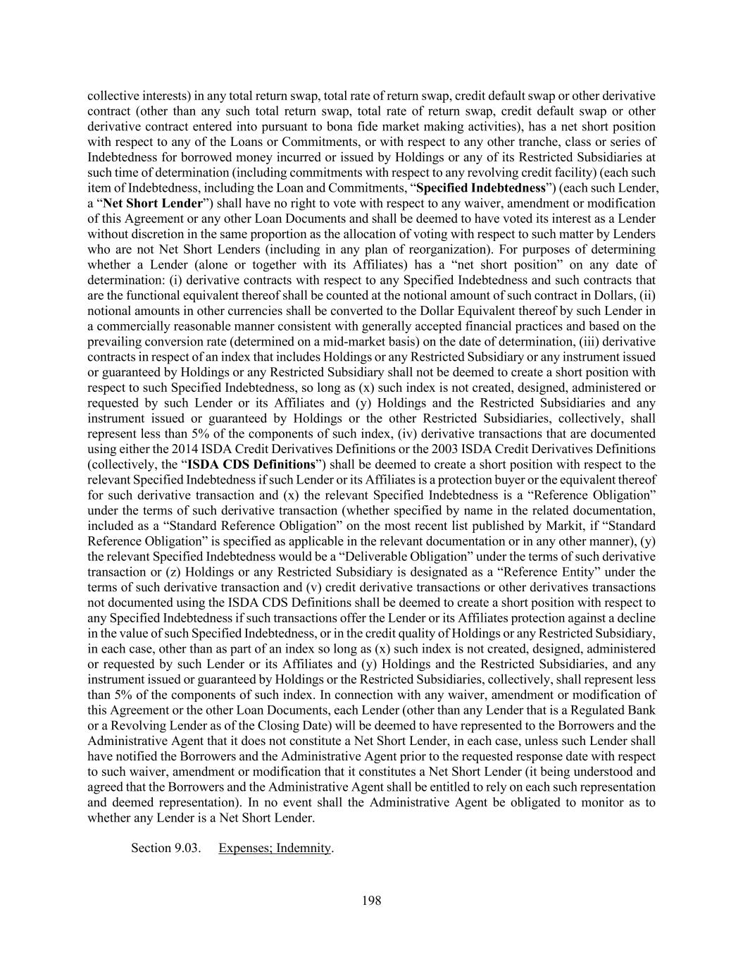 198 collective interests) in any total return swap, total rate of return swap, credit default swap or other derivative contract (other than any such total return swap, total rate of return swap, credit default swap or other derivative contract entered into pursuant to bona fide market making activities), has a net short position with respect to any of the Loans or Commitments, or with respect to any other tranche, class or series of Indebtedness for borrowed money incurred or issued by Holdings or any of its Restricted Subsidiaries at such time of determination (including commitments with respect to any revolving credit facility) (each such item of Indebtedness, including the Loan and Commitments, “Specified Indebtedness”) (each such Lender, a “Net Short Lender”) shall have no right to vote with respect to any waiver, amendment or modification of this Agreement or any other Loan Documents and shall be deemed to have voted its interest as a Lender without discretion in the same proportion as the allocation of voting with respect to such matter by Lenders who are not Net Short Lenders (including in any plan of reorganization). For purposes of determining whether a Lender (alone or together with its Affiliates) has a “net short position” on any date of determination: (i) derivative contracts with respect to any Specified Indebtedness and such contracts that are the functional equivalent thereof shall be counted at the notional amount of such contract in Dollars, (ii) notional amounts in other currencies shall be converted to the Dollar Equivalent thereof by such Lender in a commercially reasonable manner consistent with generally accepted financial practices and based on the prevailing conversion rate (determined on a mid-market basis) on the date of determination, (iii) derivative contracts in respect of an index that includes Holdings or any Restricted Subsidiary or any instrument issued or guaranteed by Holdings or any Restricted Subsidiary shall not be deemed to create a short position with respect to such Specified Indebtedness, so long as (x) such index is not created, designed, administered or requested by such Lender or its Affiliates and (y) Holdings and the Restricted Subsidiaries and any instrument issued or guaranteed by Holdings or the other Restricted Subsidiaries, collectively, shall represent less than 5% of the components of such index, (iv) derivative transactions that are documented using either the 2014 ISDA Credit Derivatives Definitions or the 2003 ISDA Credit Derivatives Definitions (collectively, the “ISDA CDS Definitions”) shall be deemed to create a short position with respect to the relevant Specified Indebtedness if such Lender or its Affiliates is a protection buyer or the equivalent thereof for such derivative transaction and (x) the relevant Specified Indebtedness is a “Reference Obligation” under the terms of such derivative transaction (whether specified by name in the related documentation, included as a “Standard Reference Obligation” on the most recent list published by Markit, if “Standard Reference Obligation” is specified as applicable in the relevant documentation or in any other manner), (y) the relevant Specified Indebtedness would be a “Deliverable Obligation” under the terms of such derivative transaction or (z) Holdings or any Restricted Subsidiary is designated as a “Reference Entity” under the terms of such derivative transaction and (v) credit derivative transactions or other derivatives transactions not documented using the ISDA CDS Definitions shall be deemed to create a short position with respect to any Specified Indebtedness if such transactions offer the Lender or its Affiliates protection against a decline in the value of such Specified Indebtedness, or in the credit quality of Holdings or any Restricted Subsidiary, in each case, other than as part of an index so long as (x) such index is not created, designed, administered or requested by such Lender or its Affiliates and (y) Holdings and the Restricted Subsidiaries, and any instrument issued or guaranteed by Holdings or the Restricted Subsidiaries, collectively, shall represent less than 5% of the components of such index. In connection with any waiver, amendment or modification of this Agreement or the other Loan Documents, each Lender (other than any Lender that is a Regulated Bank or a Revolving Lender as of the Closing Date) will be deemed to have represented to the Borrowers and the Administrative Agent that it does not constitute a Net Short Lender, in each case, unless such Lender shall have notified the Borrowers and the Administrative Agent prior to the requested response date with respect to such waiver, amendment or modification that it constitutes a Net Short Lender (it being understood and agreed that the Borrowers and the Administrative Agent shall be entitled to rely on each such representation and deemed representation). In no event shall the Administrative Agent be obligated to monitor as to whether any Lender is a Net Short Lender. Section 9.03. Expenses; Indemnity.