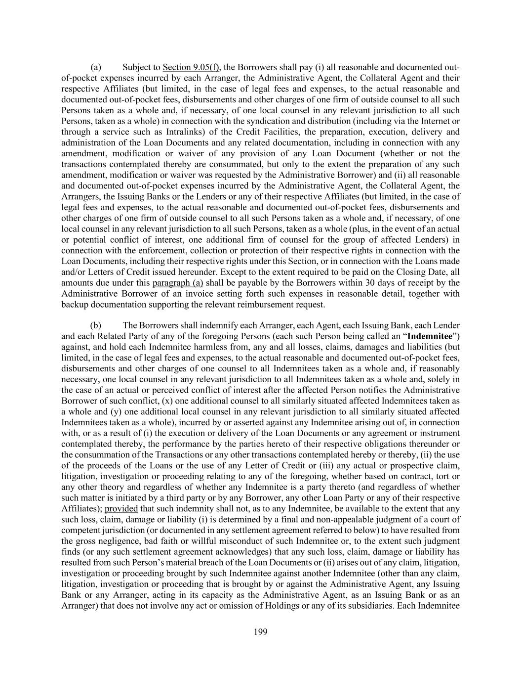 199 (a) Subject to Section 9.05(f), the Borrowers shall pay (i) all reasonable and documented out- of-pocket expenses incurred by each Arranger, the Administrative Agent, the Collateral Agent and their respective Affiliates (but limited, in the case of legal fees and expenses, to the actual reasonable and documented out-of-pocket fees, disbursements and other charges of one firm of outside counsel to all such Persons taken as a whole and, if necessary, of one local counsel in any relevant jurisdiction to all such Persons, taken as a whole) in connection with the syndication and distribution (including via the Internet or through a service such as Intralinks) of the Credit Facilities, the preparation, execution, delivery and administration of the Loan Documents and any related documentation, including in connection with any amendment, modification or waiver of any provision of any Loan Document (whether or not the transactions contemplated thereby are consummated, but only to the extent the preparation of any such amendment, modification or waiver was requested by the Administrative Borrower) and (ii) all reasonable and documented out-of-pocket expenses incurred by the Administrative Agent, the Collateral Agent, the Arrangers, the Issuing Banks or the Lenders or any of their respective Affiliates (but limited, in the case of legal fees and expenses, to the actual reasonable and documented out-of-pocket fees, disbursements and other charges of one firm of outside counsel to all such Persons taken as a whole and, if necessary, of one local counsel in any relevant jurisdiction to all such Persons, taken as a whole (plus, in the event of an actual or potential conflict of interest, one additional firm of counsel for the group of affected Lenders) in connection with the enforcement, collection or protection of their respective rights in connection with the Loan Documents, including their respective rights under this Section, or in connection with the Loans made and/or Letters of Credit issued hereunder. Except to the extent required to be paid on the Closing Date, all amounts due under this paragraph (a) shall be payable by the Borrowers within 30 days of receipt by the Administrative Borrower of an invoice setting forth such expenses in reasonable detail, together with backup documentation supporting the relevant reimbursement request. (b) The Borrowers shall indemnify each Arranger, each Agent, each Issuing Bank, each Lender and each Related Party of any of the foregoing Persons (each such Person being called an “Indemnitee”) against, and hold each Indemnitee harmless from, any and all losses, claims, damages and liabilities (but limited, in the case of legal fees and expenses, to the actual reasonable and documented out-of-pocket fees, disbursements and other charges of one counsel to all Indemnitees taken as a whole and, if reasonably necessary, one local counsel in any relevant jurisdiction to all Indemnitees taken as a whole and, solely in the case of an actual or perceived conflict of interest after the affected Person notifies the Administrative Borrower of such conflict, (x) one additional counsel to all similarly situated affected Indemnitees taken as a whole and (y) one additional local counsel in any relevant jurisdiction to all similarly situated affected Indemnitees taken as a whole), incurred by or asserted against any Indemnitee arising out of, in connection with, or as a result of (i) the execution or delivery of the Loan Documents or any agreement or instrument contemplated thereby, the performance by the parties hereto of their respective obligations thereunder or the consummation of the Transactions or any other transactions contemplated hereby or thereby, (ii) the use of the proceeds of the Loans or the use of any Letter of Credit or (iii) any actual or prospective claim, litigation, investigation or proceeding relating to any of the foregoing, whether based on contract, tort or any other theory and regardless of whether any Indemnitee is a party thereto (and regardless of whether such matter is initiated by a third party or by any Borrower, any other Loan Party or any of their respective Affiliates); provided that such indemnity shall not, as to any Indemnitee, be available to the extent that any such loss, claim, damage or liability (i) is determined by a final and non-appealable judgment of a court of competent jurisdiction (or documented in any settlement agreement referred to below) to have resulted from the gross negligence, bad faith or willful misconduct of such Indemnitee or, to the extent such judgment finds (or any such settlement agreement acknowledges) that any such loss, claim, damage or liability has resulted from such Person’s material breach of the Loan Documents or (ii) arises out of any claim, litigation, investigation or proceeding brought by such Indemnitee against another Indemnitee (other than any claim, litigation, investigation or proceeding that is brought by or against the Administrative Agent, any Issuing Bank or any Arranger, acting in its capacity as the Administrative Agent, as an Issuing Bank or as an Arranger) that does not involve any act or omission of Holdings or any of its subsidiaries. Each Indemnitee