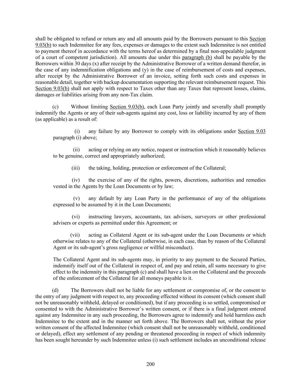 200 shall be obligated to refund or return any and all amounts paid by the Borrowers pursuant to this Section 9.03(b) to such Indemnitee for any fees, expenses or damages to the extent such Indemnitee is not entitled to payment thereof in accordance with the terms hereof as determined by a final non-appealable judgment of a court of competent jurisdiction). All amounts due under this paragraph (b) shall be payable by the Borrowers within 30 days (x) after receipt by the Administrative Borrower of a written demand therefor, in the case of any indemnification obligations and (y) in the case of reimbursement of costs and expenses, after receipt by the Administrative Borrower of an invoice, setting forth such costs and expenses in reasonable detail, together with backup documentation supporting the relevant reimbursement request. This Section 9.03(b) shall not apply with respect to Taxes other than any Taxes that represent losses, claims, damages or liabilities arising from any non-Tax claim. (c) Without limiting Section 9.03(b), each Loan Party jointly and severally shall promptly indemnify the Agents or any of their sub-agents against any cost, loss or liability incurred by any of them (as applicable) as a result of: (i) any failure by any Borrower to comply with its obligations under Section 9.03 paragraph (i) above; (ii) acting or relying on any notice, request or instruction which it reasonably believes to be genuine, correct and appropriately authorized; (iii) the taking, holding, protection or enforcement of the Collateral; (iv) the exercise of any of the rights, powers, discretions, authorities and remedies vested in the Agents by the Loan Documents or by law; (v) any default by any Loan Party in the performance of any of the obligations expressed to be assumed by it in the Loan Documents; (vi) instructing lawyers, accountants, tax advisers, surveyors or other professional advisers or experts as permitted under this Agreement; or (vii) acting as Collateral Agent or its sub-agent under the Loan Documents or which otherwise relates to any of the Collateral (otherwise, in each case, than by reason of the Collateral Agent or its sub-agent’s gross negligence or willful misconduct). The Collateral Agent and its sub-agents may, in priority to any payment to the Secured Parties, indemnify itself out of the Collateral in respect of, and pay and retain, all sums necessary to give effect to the indemnity in this paragraph (c) and shall have a lien on the Collateral and the proceeds of the enforcement of the Collateral for all moneys payable to it. (d) The Borrowers shall not be liable for any settlement or compromise of, or the consent to the entry of any judgment with respect to, any proceeding effected without its consent (which consent shall not be unreasonably withheld, delayed or conditioned), but if any proceeding is so settled, compromised or consented to with the Administrative Borrower’s written consent, or if there is a final judgment entered against any Indemnitee in any such proceeding, the Borrowers agree to indemnify and hold harmless each Indemnitee to the extent and in the manner set forth above. The Borrowers shall not, without the prior written consent of the affected Indemnitee (which consent shall not be unreasonably withheld, conditioned or delayed), effect any settlement of any pending or threatened proceeding in respect of which indemnity has been sought hereunder by such Indemnitee unless (i) such settlement includes an unconditional release