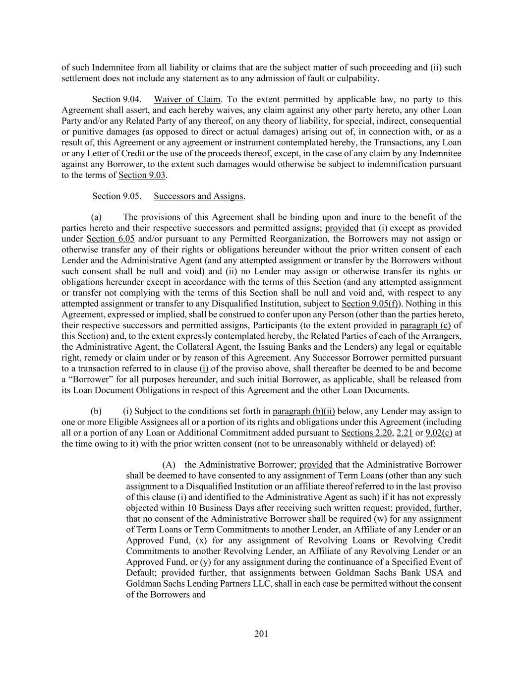 201 of such Indemnitee from all liability or claims that are the subject matter of such proceeding and (ii) such settlement does not include any statement as to any admission of fault or culpability. Section 9.04. Waiver of Claim. To the extent permitted by applicable law, no party to this Agreement shall assert, and each hereby waives, any claim against any other party hereto, any other Loan Party and/or any Related Party of any thereof, on any theory of liability, for special, indirect, consequential or punitive damages (as opposed to direct or actual damages) arising out of, in connection with, or as a result of, this Agreement or any agreement or instrument contemplated hereby, the Transactions, any Loan or any Letter of Credit or the use of the proceeds thereof, except, in the case of any claim by any Indemnitee against any Borrower, to the extent such damages would otherwise be subject to indemnification pursuant to the terms of Section 9.03. Section 9.05. Successors and Assigns. (a) The provisions of this Agreement shall be binding upon and inure to the benefit of the parties hereto and their respective successors and permitted assigns; provided that (i) except as provided under Section 6.05 and/or pursuant to any Permitted Reorganization, the Borrowers may not assign or otherwise transfer any of their rights or obligations hereunder without the prior written consent of each Lender and the Administrative Agent (and any attempted assignment or transfer by the Borrowers without such consent shall be null and void) and (ii) no Lender may assign or otherwise transfer its rights or obligations hereunder except in accordance with the terms of this Section (and any attempted assignment or transfer not complying with the terms of this Section shall be null and void and, with respect to any attempted assignment or transfer to any Disqualified Institution, subject to Section 9.05(f)). Nothing in this Agreement, expressed or implied, shall be construed to confer upon any Person (other than the parties hereto, their respective successors and permitted assigns, Participants (to the extent provided in paragraph (c) of this Section) and, to the extent expressly contemplated hereby, the Related Parties of each of the Arrangers, the Administrative Agent, the Collateral Agent, the Issuing Banks and the Lenders) any legal or equitable right, remedy or claim under or by reason of this Agreement. Any Successor Borrower permitted pursuant to a transaction referred to in clause (i) of the proviso above, shall thereafter be deemed to be and become a “Borrower” for all purposes hereunder, and such initial Borrower, as applicable, shall be released from its Loan Document Obligations in respect of this Agreement and the other Loan Documents. (b) (i) Subject to the conditions set forth in paragraph (b)(ii) below, any Lender may assign to one or more Eligible Assignees all or a portion of its rights and obligations under this Agreement (including all or a portion of any Loan or Additional Commitment added pursuant to Sections 2.20, 2.21 or 9.02(c) at the time owing to it) with the prior written consent (not to be unreasonably withheld or delayed) of: (A) the Administrative Borrower; provided that the Administrative Borrower shall be deemed to have consented to any assignment of Term Loans (other than any such assignment to a Disqualified Institution or an affiliate thereof referred to in the last proviso of this clause (i) and identified to the Administrative Agent as such) if it has not expressly objected within 10 Business Days after receiving such written request; provided, further, that no consent of the Administrative Borrower shall be required (w) for any assignment of Term Loans or Term Commitments to another Lender, an Affiliate of any Lender or an Approved Fund, (x) for any assignment of Revolving Loans or Revolving Credit Commitments to another Revolving Lender, an Affiliate of any Revolving Lender or an Approved Fund, or (y) for any assignment during the continuance of a Specified Event of Default; provided further, that assignments between Goldman Sachs Bank USA and Goldman Sachs Lending Partners LLC, shall in each case be permitted without the consent of the Borrowers and