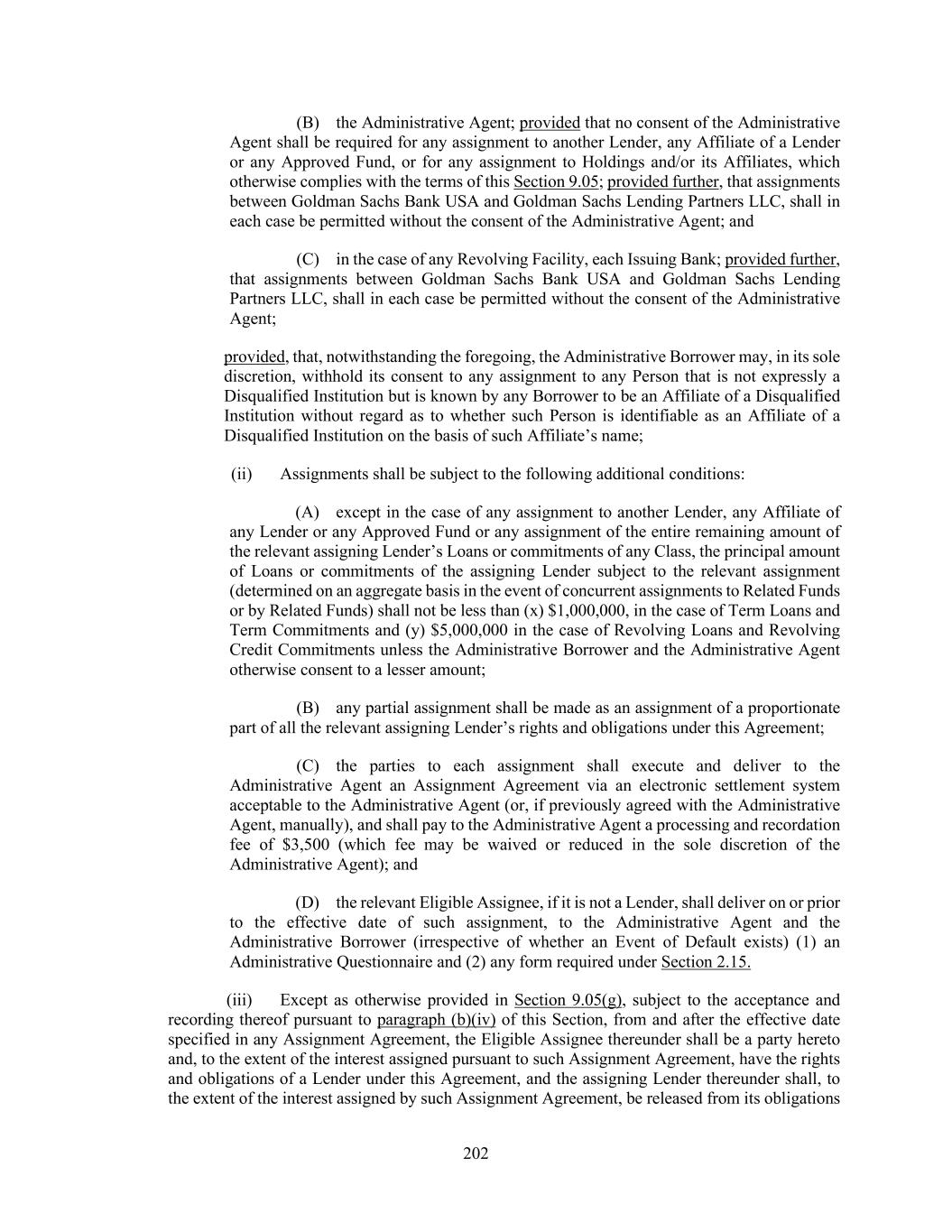 202 (B) the Administrative Agent; provided that no consent of the Administrative Agent shall be required for any assignment to another Lender, any Affiliate of a Lender or any Approved Fund, or for any assignment to Holdings and/or its Affiliates, which otherwise complies with the terms of this Section 9.05; provided further, that assignments between Goldman Sachs Bank USA and Goldman Sachs Lending Partners LLC, shall in each case be permitted without the consent of the Administrative Agent; and (C) in the case of any Revolving Facility, each Issuing Bank; provided further, that assignments between Goldman Sachs Bank USA and Goldman Sachs Lending Partners LLC, shall in each case be permitted without the consent of the Administrative Agent; provided, that, notwithstanding the foregoing, the Administrative Borrower may, in its sole discretion, withhold its consent to any assignment to any Person that is not expressly a Disqualified Institution but is known by any Borrower to be an Affiliate of a Disqualified Institution without regard as to whether such Person is identifiable as an Affiliate of a Disqualified Institution on the basis of such Affiliate’s name; (ii) Assignments shall be subject to the following additional conditions: (A) except in the case of any assignment to another Lender, any Affiliate of any Lender or any Approved Fund or any assignment of the entire remaining amount of the relevant assigning Lender’s Loans or commitments of any Class, the principal amount of Loans or commitments of the assigning Lender subject to the relevant assignment (determined on an aggregate basis in the event of concurrent assignments to Related Funds or by Related Funds) shall not be less than (x) $1,000,000, in the case of Term Loans and Term Commitments and (y) $5,000,000 in the case of Revolving Loans and Revolving Credit Commitments unless the Administrative Borrower and the Administrative Agent otherwise consent to a lesser amount; (B) any partial assignment shall be made as an assignment of a proportionate part of all the relevant assigning Lender’s rights and obligations under this Agreement; (C) the parties to each assignment shall execute and deliver to the Administrative Agent an Assignment Agreement via an electronic settlement system acceptable to the Administrative Agent (or, if previously agreed with the Administrative Agent, manually), and shall pay to the Administrative Agent a processing and recordation fee of $3,500 (which fee may be waived or reduced in the sole discretion of the Administrative Agent); and (D) the relevant Eligible Assignee, if it is not a Lender, shall deliver on or prior to the effective date of such assignment, to the Administrative Agent and the Administrative Borrower (irrespective of whether an Event of Default exists) (1) an Administrative Questionnaire and (2) any form required under Section 2.15. (iii) Except as otherwise provided in Section 9.05(g), subject to the acceptance and recording thereof pursuant to paragraph (b)(iv) of this Section, from and after the effective date specified in any Assignment Agreement, the Eligible Assignee thereunder shall be a party hereto and, to the extent of the interest assigned pursuant to such Assignment Agreement, have the rights and obligations of a Lender under this Agreement, and the assigning Lender thereunder shall, to the extent of the interest assigned by such Assignment Agreement, be released from its obligations