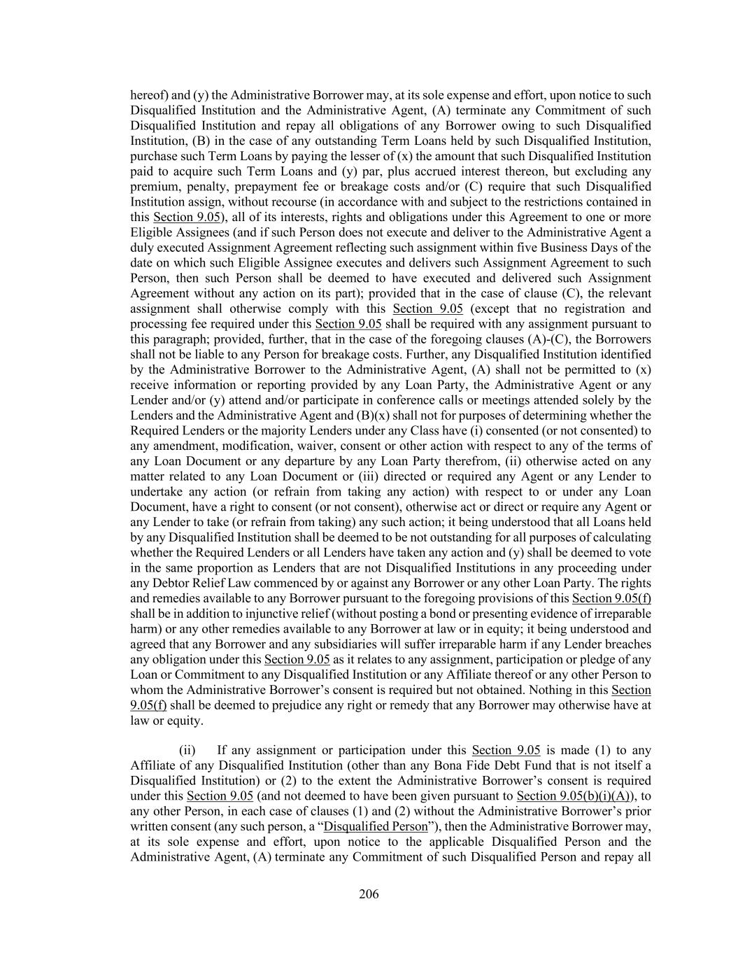 206 hereof) and (y) the Administrative Borrower may, at its sole expense and effort, upon notice to such Disqualified Institution and the Administrative Agent, (A) terminate any Commitment of such Disqualified Institution and repay all obligations of any Borrower owing to such Disqualified Institution, (B) in the case of any outstanding Term Loans held by such Disqualified Institution, purchase such Term Loans by paying the lesser of (x) the amount that such Disqualified Institution paid to acquire such Term Loans and (y) par, plus accrued interest thereon, but excluding any premium, penalty, prepayment fee or breakage costs and/or (C) require that such Disqualified Institution assign, without recourse (in accordance with and subject to the restrictions contained in this Section 9.05), all of its interests, rights and obligations under this Agreement to one or more Eligible Assignees (and if such Person does not execute and deliver to the Administrative Agent a duly executed Assignment Agreement reflecting such assignment within five Business Days of the date on which such Eligible Assignee executes and delivers such Assignment Agreement to such Person, then such Person shall be deemed to have executed and delivered such Assignment Agreement without any action on its part); provided that in the case of clause (C), the relevant assignment shall otherwise comply with this Section 9.05 (except that no registration and processing fee required under this Section 9.05 shall be required with any assignment pursuant to this paragraph; provided, further, that in the case of the foregoing clauses (A)-(C), the Borrowers shall not be liable to any Person for breakage costs. Further, any Disqualified Institution identified by the Administrative Borrower to the Administrative Agent, (A) shall not be permitted to (x) receive information or reporting provided by any Loan Party, the Administrative Agent or any Lender and/or (y) attend and/or participate in conference calls or meetings attended solely by the Lenders and the Administrative Agent and (B)(x) shall not for purposes of determining whether the Required Lenders or the majority Lenders under any Class have (i) consented (or not consented) to any amendment, modification, waiver, consent or other action with respect to any of the terms of any Loan Document or any departure by any Loan Party therefrom, (ii) otherwise acted on any matter related to any Loan Document or (iii) directed or required any Agent or any Lender to undertake any action (or refrain from taking any action) with respect to or under any Loan Document, have a right to consent (or not consent), otherwise act or direct or require any Agent or any Lender to take (or refrain from taking) any such action; it being understood that all Loans held by any Disqualified Institution shall be deemed to be not outstanding for all purposes of calculating whether the Required Lenders or all Lenders have taken any action and (y) shall be deemed to vote in the same proportion as Lenders that are not Disqualified Institutions in any proceeding under any Debtor Relief Law commenced by or against any Borrower or any other Loan Party. The rights and remedies available to any Borrower pursuant to the foregoing provisions of this Section 9.05(f) shall be in addition to injunctive relief (without posting a bond or presenting evidence of irreparable harm) or any other remedies available to any Borrower at law or in equity; it being understood and agreed that any Borrower and any subsidiaries will suffer irreparable harm if any Lender breaches any obligation under this Section 9.05 as it relates to any assignment, participation or pledge of any Loan or Commitment to any Disqualified Institution or any Affiliate thereof or any other Person to whom the Administrative Borrower’s consent is required but not obtained. Nothing in this Section 9.05(f) shall be deemed to prejudice any right or remedy that any Borrower may otherwise have at law or equity. (ii) If any assignment or participation under this Section 9.05 is made (1) to any Affiliate of any Disqualified Institution (other than any Bona Fide Debt Fund that is not itself a Disqualified Institution) or (2) to the extent the Administrative Borrower’s consent is required under this Section 9.05 (and not deemed to have been given pursuant to Section 9.05(b)(i)(A)), to any other Person, in each case of clauses (1) and (2) without the Administrative Borrower’s prior written consent (any such person, a “Disqualified Person”), then the Administrative Borrower may, at its sole expense and effort, upon notice to the applicable Disqualified Person and the Administrative Agent, (A) terminate any Commitment of such Disqualified Person and repay all