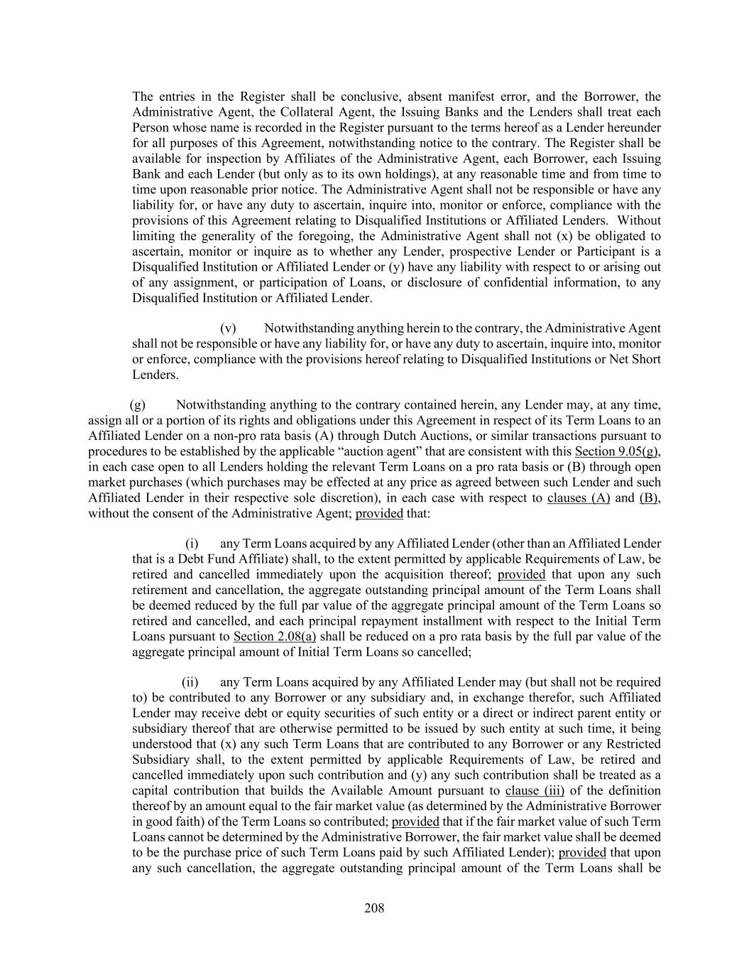 208 The entries in the Register shall be conclusive, absent manifest error, and the Borrower, the Administrative Agent, the Collateral Agent, the Issuing Banks and the Lenders shall treat each Person whose name is recorded in the Register pursuant to the terms hereof as a Lender hereunder for all purposes of this Agreement, notwithstanding notice to the contrary. The Register shall be available for inspection by Affiliates of the Administrative Agent, each Borrower, each Issuing Bank and each Lender (but only as to its own holdings), at any reasonable time and from time to time upon reasonable prior notice. The Administrative Agent shall not be responsible or have any liability for, or have any duty to ascertain, inquire into, monitor or enforce, compliance with the provisions of this Agreement relating to Disqualified Institutions or Affiliated Lenders. Without limiting the generality of the foregoing, the Administrative Agent shall not (x) be obligated to ascertain, monitor or inquire as to whether any Lender, prospective Lender or Participant is a Disqualified Institution or Affiliated Lender or (y) have any liability with respect to or arising out of any assignment, or participation of Loans, or disclosure of confidential information, to any Disqualified Institution or Affiliated Lender. (v) Notwithstanding anything herein to the contrary, the Administrative Agent shall not be responsible or have any liability for, or have any duty to ascertain, inquire into, monitor or enforce, compliance with the provisions hereof relating to Disqualified Institutions or Net Short Lenders. (g) Notwithstanding anything to the contrary contained herein, any Lender may, at any time, assign all or a portion of its rights and obligations under this Agreement in respect of its Term Loans to an Affiliated Lender on a non-pro rata basis (A) through Dutch Auctions, or similar transactions pursuant to procedures to be established by the applicable “auction agent” that are consistent with this Section 9.05(g), in each case open to all Lenders holding the relevant Term Loans on a pro rata basis or (B) through open market purchases (which purchases may be effected at any price as agreed between such Lender and such Affiliated Lender in their respective sole discretion), in each case with respect to clauses (A) and (B), without the consent of the Administrative Agent; provided that: (i) any Term Loans acquired by any Affiliated Lender (other than an Affiliated Lender that is a Debt Fund Affiliate) shall, to the extent permitted by applicable Requirements of Law, be retired and cancelled immediately upon the acquisition thereof; provided that upon any such retirement and cancellation, the aggregate outstanding principal amount of the Term Loans shall be deemed reduced by the full par value of the aggregate principal amount of the Term Loans so retired and cancelled, and each principal repayment installment with respect to the Initial Term Loans pursuant to Section 2.08(a) shall be reduced on a pro rata basis by the full par value of the aggregate principal amount of Initial Term Loans so cancelled; (ii) any Term Loans acquired by any Affiliated Lender may (but shall not be required to) be contributed to any Borrower or any subsidiary and, in exchange therefor, such Affiliated Lender may receive debt or equity securities of such entity or a direct or indirect parent entity or subsidiary thereof that are otherwise permitted to be issued by such entity at such time, it being understood that (x) any such Term Loans that are contributed to any Borrower or any Restricted Subsidiary shall, to the extent permitted by applicable Requirements of Law, be retired and cancelled immediately upon such contribution and (y) any such contribution shall be treated as a capital contribution that builds the Available Amount pursuant to clause (iii) of the definition thereof by an amount equal to the fair market value (as determined by the Administrative Borrower in good faith) of the Term Loans so contributed; provided that if the fair market value of such Term Loans cannot be determined by the Administrative Borrower, the fair market value shall be deemed to be the purchase price of such Term Loans paid by such Affiliated Lender); provided that upon any such cancellation, the aggregate outstanding principal amount of the Term Loans shall be