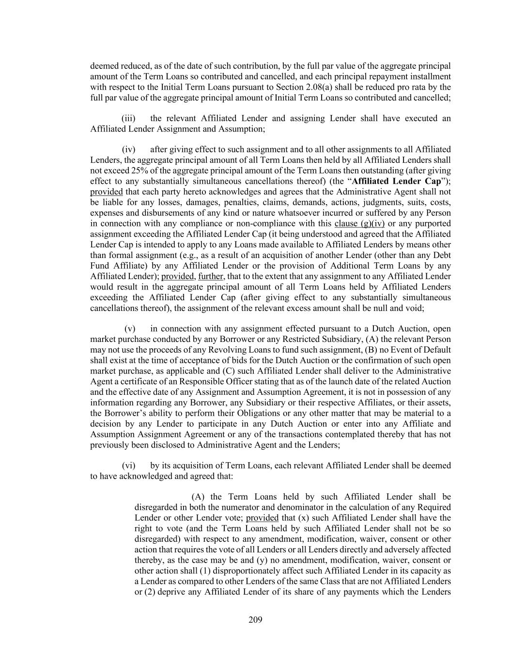 209 deemed reduced, as of the date of such contribution, by the full par value of the aggregate principal amount of the Term Loans so contributed and cancelled, and each principal repayment installment with respect to the Initial Term Loans pursuant to Section 2.08(a) shall be reduced pro rata by the full par value of the aggregate principal amount of Initial Term Loans so contributed and cancelled; (iii) the relevant Affiliated Lender and assigning Lender shall have executed an Affiliated Lender Assignment and Assumption; (iv) after giving effect to such assignment and to all other assignments to all Affiliated Lenders, the aggregate principal amount of all Term Loans then held by all Affiliated Lenders shall not exceed 25% of the aggregate principal amount of the Term Loans then outstanding (after giving effect to any substantially simultaneous cancellations thereof) (the “Affiliated Lender Cap”); provided that each party hereto acknowledges and agrees that the Administrative Agent shall not be liable for any losses, damages, penalties, claims, demands, actions, judgments, suits, costs, expenses and disbursements of any kind or nature whatsoever incurred or suffered by any Person in connection with any compliance or non-compliance with this clause (g)(iv) or any purported assignment exceeding the Affiliated Lender Cap (it being understood and agreed that the Affiliated Lender Cap is intended to apply to any Loans made available to Affiliated Lenders by means other than formal assignment (e.g., as a result of an acquisition of another Lender (other than any Debt Fund Affiliate) by any Affiliated Lender or the provision of Additional Term Loans by any Affiliated Lender); provided, further, that to the extent that any assignment to any Affiliated Lender would result in the aggregate principal amount of all Term Loans held by Affiliated Lenders exceeding the Affiliated Lender Cap (after giving effect to any substantially simultaneous cancellations thereof), the assignment of the relevant excess amount shall be null and void; (v) in connection with any assignment effected pursuant to a Dutch Auction, open market purchase conducted by any Borrower or any Restricted Subsidiary, (A) the relevant Person may not use the proceeds of any Revolving Loans to fund such assignment, (B) no Event of Default shall exist at the time of acceptance of bids for the Dutch Auction or the confirmation of such open market purchase, as applicable and (C) such Affiliated Lender shall deliver to the Administrative Agent a certificate of an Responsible Officer stating that as of the launch date of the related Auction and the effective date of any Assignment and Assumption Agreement, it is not in possession of any information regarding any Borrower, any Subsidiary or their respective Affiliates, or their assets, the Borrower’s ability to perform their Obligations or any other matter that may be material to a decision by any Lender to participate in any Dutch Auction or enter into any Affiliate and Assumption Assignment Agreement or any of the transactions contemplated thereby that has not previously been disclosed to Administrative Agent and the Lenders; (vi) by its acquisition of Term Loans, each relevant Affiliated Lender shall be deemed to have acknowledged and agreed that: (A) the Term Loans held by such Affiliated Lender shall be disregarded in both the numerator and denominator in the calculation of any Required Lender or other Lender vote; provided that (x) such Affiliated Lender shall have the right to vote (and the Term Loans held by such Affiliated Lender shall not be so disregarded) with respect to any amendment, modification, waiver, consent or other action that requires the vote of all Lenders or all Lenders directly and adversely affected thereby, as the case may be and (y) no amendment, modification, waiver, consent or other action shall (1) disproportionately affect such Affiliated Lender in its capacity as a Lender as compared to other Lenders of the same Class that are not Affiliated Lenders or (2) deprive any Affiliated Lender of its share of any payments which the Lenders
