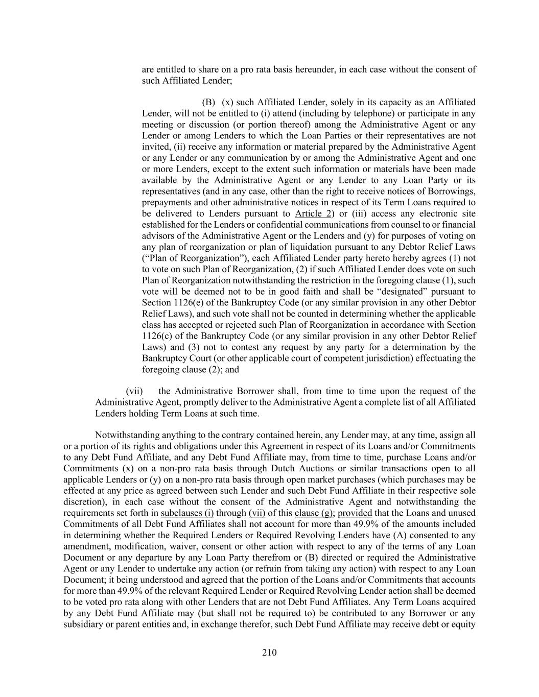 210 are entitled to share on a pro rata basis hereunder, in each case without the consent of such Affiliated Lender; (B) (x) such Affiliated Lender, solely in its capacity as an Affiliated Lender, will not be entitled to (i) attend (including by telephone) or participate in any meeting or discussion (or portion thereof) among the Administrative Agent or any Lender or among Lenders to which the Loan Parties or their representatives are not invited, (ii) receive any information or material prepared by the Administrative Agent or any Lender or any communication by or among the Administrative Agent and one or more Lenders, except to the extent such information or materials have been made available by the Administrative Agent or any Lender to any Loan Party or its representatives (and in any case, other than the right to receive notices of Borrowings, prepayments and other administrative notices in respect of its Term Loans required to be delivered to Lenders pursuant to Article 2) or (iii) access any electronic site established for the Lenders or confidential communications from counsel to or financial advisors of the Administrative Agent or the Lenders and (y) for purposes of voting on any plan of reorganization or plan of liquidation pursuant to any Debtor Relief Laws (“Plan of Reorganization”), each Affiliated Lender party hereto hereby agrees (1) not to vote on such Plan of Reorganization, (2) if such Affiliated Lender does vote on such Plan of Reorganization notwithstanding the restriction in the foregoing clause (1), such vote will be deemed not to be in good faith and shall be “designated” pursuant to Section 1126(e) of the Bankruptcy Code (or any similar provision in any other Debtor Relief Laws), and such vote shall not be counted in determining whether the applicable class has accepted or rejected such Plan of Reorganization in accordance with Section 1126(c) of the Bankruptcy Code (or any similar provision in any other Debtor Relief Laws) and (3) not to contest any request by any party for a determination by the Bankruptcy Court (or other applicable court of competent jurisdiction) effectuating the foregoing clause (2); and (vii) the Administrative Borrower shall, from time to time upon the request of the Administrative Agent, promptly deliver to the Administrative Agent a complete list of all Affiliated Lenders holding Term Loans at such time. Notwithstanding anything to the contrary contained herein, any Lender may, at any time, assign all or a portion of its rights and obligations under this Agreement in respect of its Loans and/or Commitments to any Debt Fund Affiliate, and any Debt Fund Affiliate may, from time to time, purchase Loans and/or Commitments (x) on a non-pro rata basis through Dutch Auctions or similar transactions open to all applicable Lenders or (y) on a non-pro rata basis through open market purchases (which purchases may be effected at any price as agreed between such Lender and such Debt Fund Affiliate in their respective sole discretion), in each case without the consent of the Administrative Agent and notwithstanding the requirements set forth in subclauses (i) through (vii) of this clause (g); provided that the Loans and unused Commitments of all Debt Fund Affiliates shall not account for more than 49.9% of the amounts included in determining whether the Required Lenders or Required Revolving Lenders have (A) consented to any amendment, modification, waiver, consent or other action with respect to any of the terms of any Loan Document or any departure by any Loan Party therefrom or (B) directed or required the Administrative Agent or any Lender to undertake any action (or refrain from taking any action) with respect to any Loan Document; it being understood and agreed that the portion of the Loans and/or Commitments that accounts for more than 49.9% of the relevant Required Lender or Required Revolving Lender action shall be deemed to be voted pro rata along with other Lenders that are not Debt Fund Affiliates. Any Term Loans acquired by any Debt Fund Affiliate may (but shall not be required to) be contributed to any Borrower or any subsidiary or parent entities and, in exchange therefor, such Debt Fund Affiliate may receive debt or equity