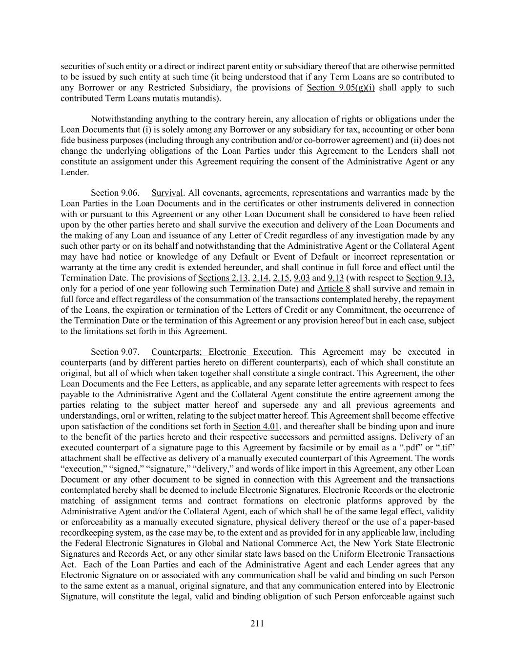 211 securities of such entity or a direct or indirect parent entity or subsidiary thereof that are otherwise permitted to be issued by such entity at such time (it being understood that if any Term Loans are so contributed to any Borrower or any Restricted Subsidiary, the provisions of Section 9.05(g)(i) shall apply to such contributed Term Loans mutatis mutandis). Notwithstanding anything to the contrary herein, any allocation of rights or obligations under the Loan Documents that (i) is solely among any Borrower or any subsidiary for tax, accounting or other bona fide business purposes (including through any contribution and/or co-borrower agreement) and (ii) does not change the underlying obligations of the Loan Parties under this Agreement to the Lenders shall not constitute an assignment under this Agreement requiring the consent of the Administrative Agent or any Lender. Section 9.06. Survival. All covenants, agreements, representations and warranties made by the Loan Parties in the Loan Documents and in the certificates or other instruments delivered in connection with or pursuant to this Agreement or any other Loan Document shall be considered to have been relied upon by the other parties hereto and shall survive the execution and delivery of the Loan Documents and the making of any Loan and issuance of any Letter of Credit regardless of any investigation made by any such other party or on its behalf and notwithstanding that the Administrative Agent or the Collateral Agent may have had notice or knowledge of any Default or Event of Default or incorrect representation or warranty at the time any credit is extended hereunder, and shall continue in full force and effect until the Termination Date. The provisions of Sections 2.13, 2.14, 2.15, 9.03 and 9.13 (with respect to Section 9.13, only for a period of one year following such Termination Date) and Article 8 shall survive and remain in full force and effect regardless of the consummation of the transactions contemplated hereby, the repayment of the Loans, the expiration or termination of the Letters of Credit or any Commitment, the occurrence of the Termination Date or the termination of this Agreement or any provision hereof but in each case, subject to the limitations set forth in this Agreement. Section 9.07. Counterparts; Electronic Execution. This Agreement may be executed in counterparts (and by different parties hereto on different counterparts), each of which shall constitute an original, but all of which when taken together shall constitute a single contract. This Agreement, the other Loan Documents and the Fee Letters, as applicable, and any separate letter agreements with respect to fees payable to the Administrative Agent and the Collateral Agent constitute the entire agreement among the parties relating to the subject matter hereof and supersede any and all previous agreements and understandings, oral or written, relating to the subject matter hereof. This Agreement shall become effective upon satisfaction of the conditions set forth in Section 4.01, and thereafter shall be binding upon and inure to the benefit of the parties hereto and their respective successors and permitted assigns. Delivery of an executed counterpart of a signature page to this Agreement by facsimile or by email as a “.pdf” or “.tif” attachment shall be effective as delivery of a manually executed counterpart of this Agreement. The words “execution,” “signed,” “signature,” “delivery,” and words of like import in this Agreement, any other Loan Document or any other document to be signed in connection with this Agreement and the transactions contemplated hereby shall be deemed to include Electronic Signatures, Electronic Records or the electronic matching of assignment terms and contract formations on electronic platforms approved by the Administrative Agent and/or the Collateral Agent, each of which shall be of the same legal effect, validity or enforceability as a manually executed signature, physical delivery thereof or the use of a paper-based recordkeeping system, as the case may be, to the extent and as provided for in any applicable law, including the Federal Electronic Signatures in Global and National Commerce Act, the New York State Electronic Signatures and Records Act, or any other similar state laws based on the Uniform Electronic Transactions Act. Each of the Loan Parties and each of the Administrative Agent and each Lender agrees that any Electronic Signature on or associated with any communication shall be valid and binding on such Person to the same extent as a manual, original signature, and that any communication entered into by Electronic Signature, will constitute the legal, valid and binding obligation of such Person enforceable against such