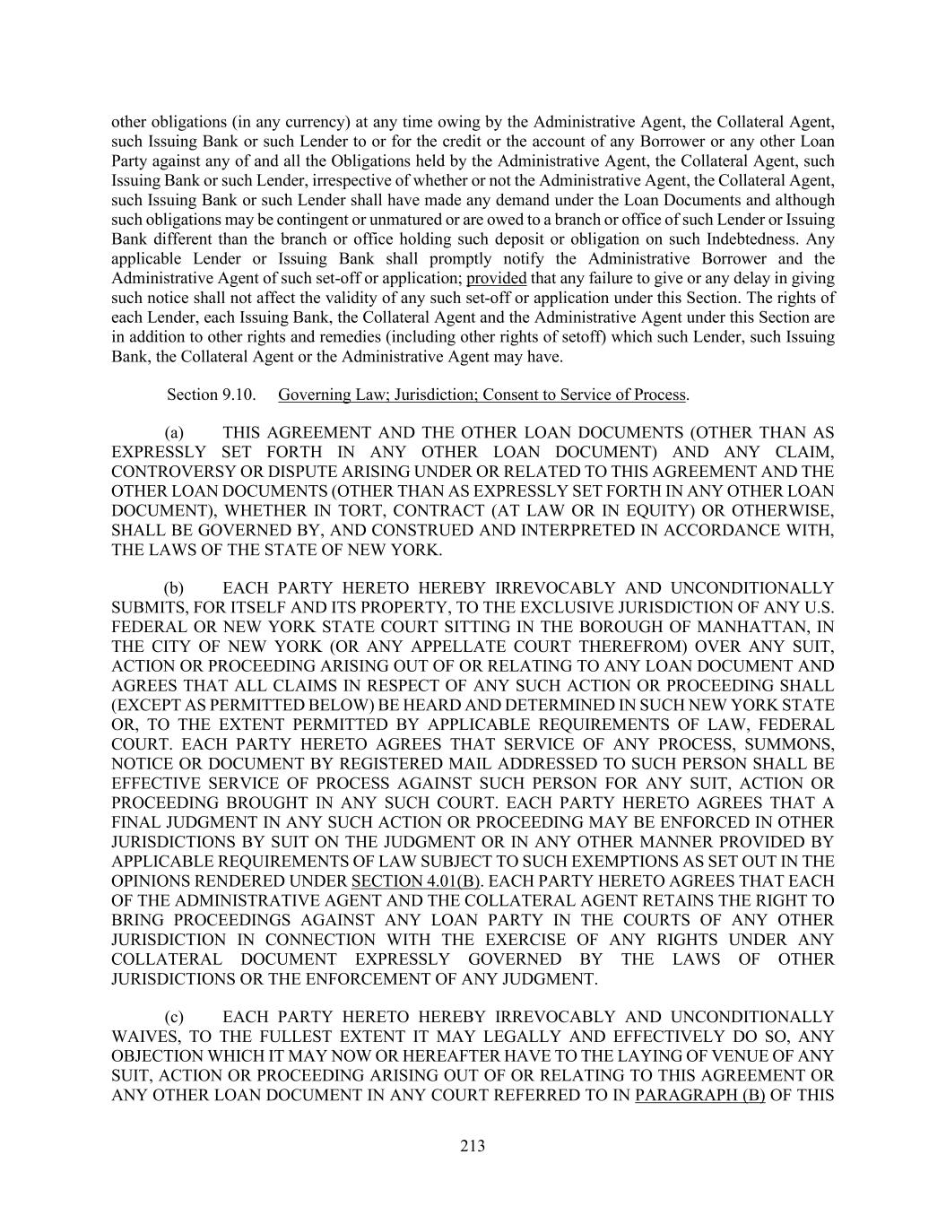 213 other obligations (in any currency) at any time owing by the Administrative Agent, the Collateral Agent, such Issuing Bank or such Lender to or for the credit or the account of any Borrower or any other Loan Party against any of and all the Obligations held by the Administrative Agent, the Collateral Agent, such Issuing Bank or such Lender, irrespective of whether or not the Administrative Agent, the Collateral Agent, such Issuing Bank or such Lender shall have made any demand under the Loan Documents and although such obligations may be contingent or unmatured or are owed to a branch or office of such Lender or Issuing Bank different than the branch or office holding such deposit or obligation on such Indebtedness. Any applicable Lender or Issuing Bank shall promptly notify the Administrative Borrower and the Administrative Agent of such set-off or application; provided that any failure to give or any delay in giving such notice shall not affect the validity of any such set-off or application under this Section. The rights of each Lender, each Issuing Bank, the Collateral Agent and the Administrative Agent under this Section are in addition to other rights and remedies (including other rights of setoff) which such Lender, such Issuing Bank, the Collateral Agent or the Administrative Agent may have. Section 9.10. Governing Law; Jurisdiction; Consent to Service of Process. (a) THIS AGREEMENT AND THE OTHER LOAN DOCUMENTS (OTHER THAN AS EXPRESSLY SET FORTH IN ANY OTHER LOAN DOCUMENT) AND ANY CLAIM, CONTROVERSY OR DISPUTE ARISING UNDER OR RELATED TO THIS AGREEMENT AND THE OTHER LOAN DOCUMENTS (OTHER THAN AS EXPRESSLY SET FORTH IN ANY OTHER LOAN DOCUMENT), WHETHER IN TORT, CONTRACT (AT LAW OR IN EQUITY) OR OTHERWISE, SHALL BE GOVERNED BY, AND CONSTRUED AND INTERPRETED IN ACCORDANCE WITH, THE LAWS OF THE STATE OF NEW YORK. (b) EACH PARTY HERETO HEREBY IRREVOCABLY AND UNCONDITIONALLY SUBMITS, FOR ITSELF AND ITS PROPERTY, TO THE EXCLUSIVE JURISDICTION OF ANY U.S. FEDERAL OR NEW YORK STATE COURT SITTING IN THE BOROUGH OF MANHATTAN, IN THE CITY OF NEW YORK (OR ANY APPELLATE COURT THEREFROM) OVER ANY SUIT, ACTION OR PROCEEDING ARISING OUT OF OR RELATING TO ANY LOAN DOCUMENT AND AGREES THAT ALL CLAIMS IN RESPECT OF ANY SUCH ACTION OR PROCEEDING SHALL (EXCEPT AS PERMITTED BELOW) BE HEARD AND DETERMINED IN SUCH NEW YORK STATE OR, TO THE EXTENT PERMITTED BY APPLICABLE REQUIREMENTS OF LAW, FEDERAL COURT. EACH PARTY HERETO AGREES THAT SERVICE OF ANY PROCESS, SUMMONS, NOTICE OR DOCUMENT BY REGISTERED MAIL ADDRESSED TO SUCH PERSON SHALL BE EFFECTIVE SERVICE OF PROCESS AGAINST SUCH PERSON FOR ANY SUIT, ACTION OR PROCEEDING BROUGHT IN ANY SUCH COURT. EACH PARTY HERETO AGREES THAT A FINAL JUDGMENT IN ANY SUCH ACTION OR PROCEEDING MAY BE ENFORCED IN OTHER JURISDICTIONS BY SUIT ON THE JUDGMENT OR IN ANY OTHER MANNER PROVIDED BY APPLICABLE REQUIREMENTS OF LAW SUBJECT TO SUCH EXEMPTIONS AS SET OUT IN THE OPINIONS RENDERED UNDER SECTION 4.01(B). EACH PARTY HERETO AGREES THAT EACH OF THE ADMINISTRATIVE AGENT AND THE COLLATERAL AGENT RETAINS THE RIGHT TO BRING PROCEEDINGS AGAINST ANY LOAN PARTY IN THE COURTS OF ANY OTHER JURISDICTION IN CONNECTION WITH THE EXERCISE OF ANY RIGHTS UNDER ANY COLLATERAL DOCUMENT EXPRESSLY GOVERNED BY THE LAWS OF OTHER JURISDICTIONS OR THE ENFORCEMENT OF ANY JUDGMENT. (c) EACH PARTY HERETO HEREBY IRREVOCABLY AND UNCONDITIONALLY WAIVES, TO THE FULLEST EXTENT IT MAY LEGALLY AND EFFECTIVELY DO SO, ANY OBJECTION WHICH IT MAY NOW OR HEREAFTER HAVE TO THE LAYING OF VENUE OF ANY SUIT, ACTION OR PROCEEDING ARISING OUT OF OR RELATING TO THIS AGREEMENT OR ANY OTHER LOAN DOCUMENT IN ANY COURT REFERRED TO IN PARAGRAPH (B) OF THIS