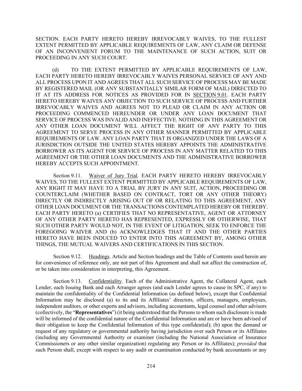 214 SECTION. EACH PARTY HERETO HEREBY IRREVOCABLY WAIVES, TO THE FULLEST EXTENT PERMITTED BY APPLICABLE REQUIREMENTS OF LAW, ANY CLAIM OR DEFENSE OF AN INCONVENIENT FORUM TO THE MAINTENANCE OF SUCH ACTION, SUIT OR PROCEEDING IN ANY SUCH COURT. (d) TO THE EXTENT PERMITTED BY APPLICABLE REQUIREMENTS OF LAW, EACH PARTY HERETO HEREBY IRREVOCABLY WAIVES PERSONAL SERVICE OF ANY AND ALL PROCESS UPON IT AND AGREES THAT ALL SUCH SERVICE OF PROCESS MAY BE MADE BY REGISTERED MAIL (OR ANY SUBSTANTIALLY SIMILAR FORM OF MAIL) DIRECTED TO IT AT ITS ADDRESS FOR NOTICES AS PROVIDED FOR IN SECTION 9.01. EACH PARTY HERETO HEREBY WAIVES ANY OBJECTION TO SUCH SERVICE OF PROCESS AND FURTHER IRREVOCABLY WAIVES AND AGREES NOT TO PLEAD OR CLAIM IN ANY ACTION OR PROCEEDING COMMENCED HEREUNDER OR UNDER ANY LOAN DOCUMENT THAT SERVICE OF PROCESS WAS INVALID AND INEFFECTIVE. NOTHING IN THIS AGREEMENT OR ANY OTHER LOAN DOCUMENT WILL AFFECT THE RIGHT OF ANY PARTY TO THIS AGREEMENT TO SERVE PROCESS IN ANY OTHER MANNER PERMITTED BY APPLICABLE REQUIREMENTS OF LAW. ANY LOAN PARTY THAT IS ORGANIZED UNDER THE LAWS OF A JURISDICTION OUTSIDE THE UNITED STATES HEREBY APPOINTS THE ADMINISTRATIVE BORROWER AS ITS AGENT FOR SERVICE OF PROCESS IN ANY MATTER RELATED TO THIS AGREEMENT OR THE OTHER LOAN DOCUMENTS AND THE ADMINISTRATIVE BORROWER HEREBY ACCEPTS SUCH APPOINTMENT. Section 9.11. Waiver of Jury Trial. EACH PARTY HERETO HEREBY IRREVOCABLY WAIVES, TO THE FULLEST EXTENT PERMITTED BY APPLICABLE REQUIREMENTS OF LAW, ANY RIGHT IT MAY HAVE TO A TRIAL BY JURY IN ANY SUIT, ACTION, PROCEEDING OR COUNTERCLAIM (WHETHER BASED ON CONTRACT, TORT OR ANY OTHER THEORY) DIRECTLY OR INDIRECTLY ARISING OUT OF OR RELATING TO THIS AGREEMENT, ANY OTHER LOAN DOCUMENT OR THE TRANSACTIONS CONTEMPLATED HEREBY OR THEREBY. EACH PARTY HERETO (a) CERTIFIES THAT NO REPRESENTATIVE, AGENT OR ATTORNEY OF ANY OTHER PARTY HERETO HAS REPRESENTED, EXPRESSLY OR OTHERWISE, THAT SUCH OTHER PARTY WOULD NOT, IN THE EVENT OF LITIGATION, SEEK TO ENFORCE THE FOREGOING WAIVER AND (b) ACKNOWLEDGES THAT IT AND THE OTHER PARTIES HERETO HAVE BEEN INDUCED TO ENTER INTO THIS AGREEMENT BY, AMONG OTHER THINGS, THE MUTUAL WAIVERS AND CERTIFICATIONS IN THIS SECTION. Section 9.12. Headings. Article and Section headings and the Table of Contents used herein are for convenience of reference only, are not part of this Agreement and shall not affect the construction of, or be taken into consideration in interpreting, this Agreement. Section 9.13. Confidentiality. Each of the Administrative Agent, the Collateral Agent, each Lender, each Issuing Bank and each Arranger agrees (and each Lender agrees to cause its SPC, if any) to maintain the confidentiality of the Confidential Information (as defined below), except that Confidential Information may be disclosed (a) to its and its Affiliates’ directors, officers, managers, employees, independent auditors, or other experts and advisors, including accountants, legal counsel and other advisors (collectively, the “Representatives”) (it being understood that the Persons to whom such disclosure is made will be informed of the confidential nature of the Confidential Information and are or have been advised of their obligation to keep the Confidential Information of this type confidential); (b) upon the demand or request of any regulatory or governmental authority having jurisdiction over such Person or its Affiliates (including any Governmental Authority or examiner (including the National Association of Insurance Commissioners or any other similar organization) regulating any Person or its Affiliates); provided that such Person shall, except with respect to any audit or examination conducted by bank accountants or any