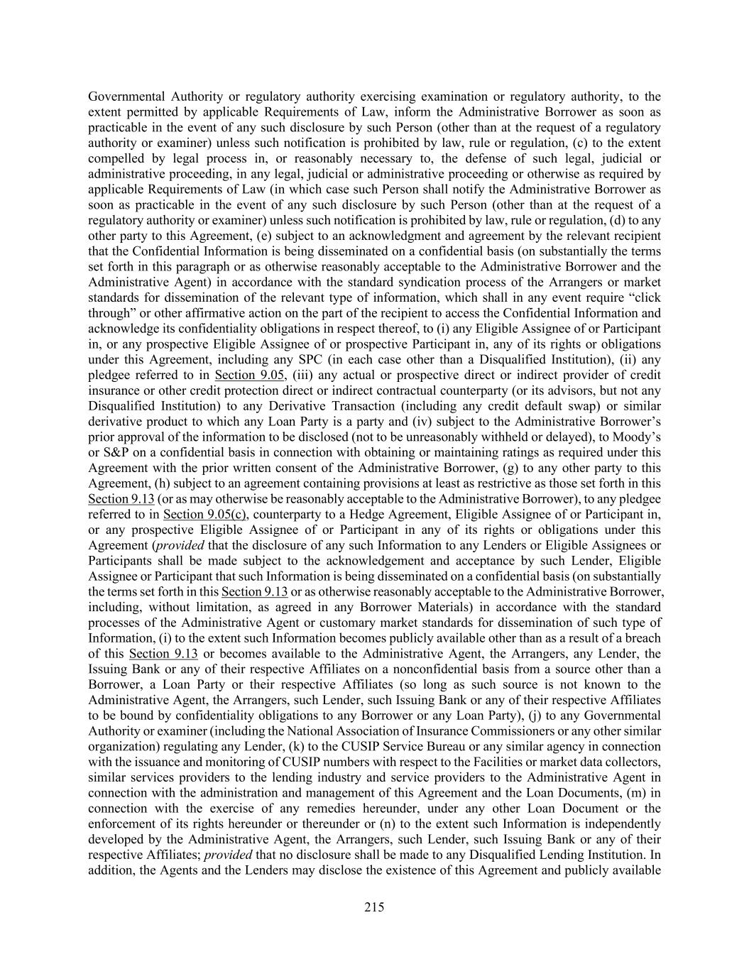215 Governmental Authority or regulatory authority exercising examination or regulatory authority, to the extent permitted by applicable Requirements of Law, inform the Administrative Borrower as soon as practicable in the event of any such disclosure by such Person (other than at the request of a regulatory authority or examiner) unless such notification is prohibited by law, rule or regulation, (c) to the extent compelled by legal process in, or reasonably necessary to, the defense of such legal, judicial or administrative proceeding, in any legal, judicial or administrative proceeding or otherwise as required by applicable Requirements of Law (in which case such Person shall notify the Administrative Borrower as soon as practicable in the event of any such disclosure by such Person (other than at the request of a regulatory authority or examiner) unless such notification is prohibited by law, rule or regulation, (d) to any other party to this Agreement, (e) subject to an acknowledgment and agreement by the relevant recipient that the Confidential Information is being disseminated on a confidential basis (on substantially the terms set forth in this paragraph or as otherwise reasonably acceptable to the Administrative Borrower and the Administrative Agent) in accordance with the standard syndication process of the Arrangers or market standards for dissemination of the relevant type of information, which shall in any event require “click through” or other affirmative action on the part of the recipient to access the Confidential Information and acknowledge its confidentiality obligations in respect thereof, to (i) any Eligible Assignee of or Participant in, or any prospective Eligible Assignee of or prospective Participant in, any of its rights or obligations under this Agreement, including any SPC (in each case other than a Disqualified Institution), (ii) any pledgee referred to in Section 9.05, (iii) any actual or prospective direct or indirect provider of credit insurance or other credit protection direct or indirect contractual counterparty (or its advisors, but not any Disqualified Institution) to any Derivative Transaction (including any credit default swap) or similar derivative product to which any Loan Party is a party and (iv) subject to the Administrative Borrower’s prior approval of the information to be disclosed (not to be unreasonably withheld or delayed), to Moody’s or S&P on a confidential basis in connection with obtaining or maintaining ratings as required under this Agreement with the prior written consent of the Administrative Borrower, (g) to any other party to this Agreement, (h) subject to an agreement containing provisions at least as restrictive as those set forth in this Section 9.13 (or as may otherwise be reasonably acceptable to the Administrative Borrower), to any pledgee referred to in Section 9.05(c), counterparty to a Hedge Agreement, Eligible Assignee of or Participant in, or any prospective Eligible Assignee of or Participant in any of its rights or obligations under this Agreement (provided that the disclosure of any such Information to any Lenders or Eligible Assignees or Participants shall be made subject to the acknowledgement and acceptance by such Lender, Eligible Assignee or Participant that such Information is being disseminated on a confidential basis (on substantially the terms set forth in this Section 9.13 or as otherwise reasonably acceptable to the Administrative Borrower, including, without limitation, as agreed in any Borrower Materials) in accordance with the standard processes of the Administrative Agent or customary market standards for dissemination of such type of Information, (i) to the extent such Information becomes publicly available other than as a result of a breach of this Section 9.13 or becomes available to the Administrative Agent, the Arrangers, any Lender, the Issuing Bank or any of their respective Affiliates on a nonconfidential basis from a source other than a Borrower, a Loan Party or their respective Affiliates (so long as such source is not known to the Administrative Agent, the Arrangers, such Lender, such Issuing Bank or any of their respective Affiliates to be bound by confidentiality obligations to any Borrower or any Loan Party), (j) to any Governmental Authority or examiner (including the National Association of Insurance Commissioners or any other similar organization) regulating any Lender, (k) to the CUSIP Service Bureau or any similar agency in connection with the issuance and monitoring of CUSIP numbers with respect to the Facilities or market data collectors, similar services providers to the lending industry and service providers to the Administrative Agent in connection with the administration and management of this Agreement and the Loan Documents, (m) in connection with the exercise of any remedies hereunder, under any other Loan Document or the enforcement of its rights hereunder or thereunder or (n) to the extent such Information is independently developed by the Administrative Agent, the Arrangers, such Lender, such Issuing Bank or any of their respective Affiliates; provided that no disclosure shall be made to any Disqualified Lending Institution. In addition, the Agents and the Lenders may disclose the existence of this Agreement and publicly available