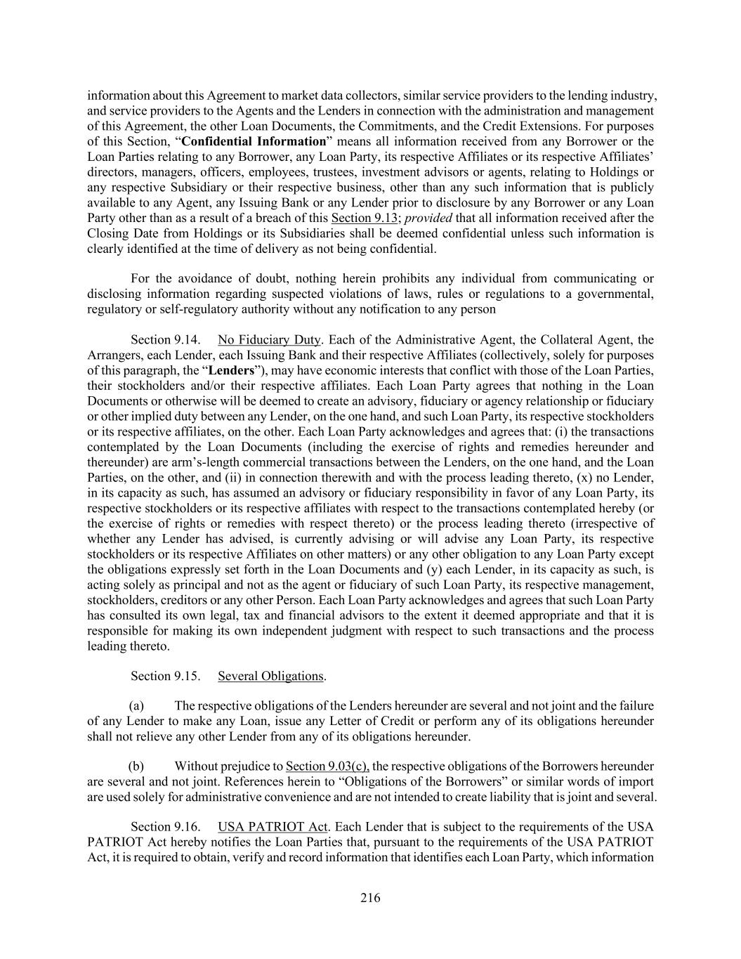 216 information about this Agreement to market data collectors, similar service providers to the lending industry, and service providers to the Agents and the Lenders in connection with the administration and management of this Agreement, the other Loan Documents, the Commitments, and the Credit Extensions. For purposes of this Section, “Confidential Information” means all information received from any Borrower or the Loan Parties relating to any Borrower, any Loan Party, its respective Affiliates or its respective Affiliates’ directors, managers, officers, employees, trustees, investment advisors or agents, relating to Holdings or any respective Subsidiary or their respective business, other than any such information that is publicly available to any Agent, any Issuing Bank or any Lender prior to disclosure by any Borrower or any Loan Party other than as a result of a breach of this Section 9.13; provided that all information received after the Closing Date from Holdings or its Subsidiaries shall be deemed confidential unless such information is clearly identified at the time of delivery as not being confidential. For the avoidance of doubt, nothing herein prohibits any individual from communicating or disclosing information regarding suspected violations of laws, rules or regulations to a governmental, regulatory or self-regulatory authority without any notification to any person Section 9.14. No Fiduciary Duty. Each of the Administrative Agent, the Collateral Agent, the Arrangers, each Lender, each Issuing Bank and their respective Affiliates (collectively, solely for purposes of this paragraph, the “Lenders”), may have economic interests that conflict with those of the Loan Parties, their stockholders and/or their respective affiliates. Each Loan Party agrees that nothing in the Loan Documents or otherwise will be deemed to create an advisory, fiduciary or agency relationship or fiduciary or other implied duty between any Lender, on the one hand, and such Loan Party, its respective stockholders or its respective affiliates, on the other. Each Loan Party acknowledges and agrees that: (i) the transactions contemplated by the Loan Documents (including the exercise of rights and remedies hereunder and thereunder) are arm’s-length commercial transactions between the Lenders, on the one hand, and the Loan Parties, on the other, and (ii) in connection therewith and with the process leading thereto, (x) no Lender, in its capacity as such, has assumed an advisory or fiduciary responsibility in favor of any Loan Party, its respective stockholders or its respective affiliates with respect to the transactions contemplated hereby (or the exercise of rights or remedies with respect thereto) or the process leading thereto (irrespective of whether any Lender has advised, is currently advising or will advise any Loan Party, its respective stockholders or its respective Affiliates on other matters) or any other obligation to any Loan Party except the obligations expressly set forth in the Loan Documents and (y) each Lender, in its capacity as such, is acting solely as principal and not as the agent or fiduciary of such Loan Party, its respective management, stockholders, creditors or any other Person. Each Loan Party acknowledges and agrees that such Loan Party has consulted its own legal, tax and financial advisors to the extent it deemed appropriate and that it is responsible for making its own independent judgment with respect to such transactions and the process leading thereto. Section 9.15. Several Obligations. (a) The respective obligations of the Lenders hereunder are several and not joint and the failure of any Lender to make any Loan, issue any Letter of Credit or perform any of its obligations hereunder shall not relieve any other Lender from any of its obligations hereunder. (b) Without prejudice to Section 9.03(c), the respective obligations of the Borrowers hereunder are several and not joint. References herein to “Obligations of the Borrowers” or similar words of import are used solely for administrative convenience and are not intended to create liability that is joint and several. Section 9.16. USA PATRIOT Act. Each Lender that is subject to the requirements of the USA PATRIOT Act hereby notifies the Loan Parties that, pursuant to the requirements of the USA PATRIOT Act, it is required to obtain, verify and record information that identifies each Loan Party, which information