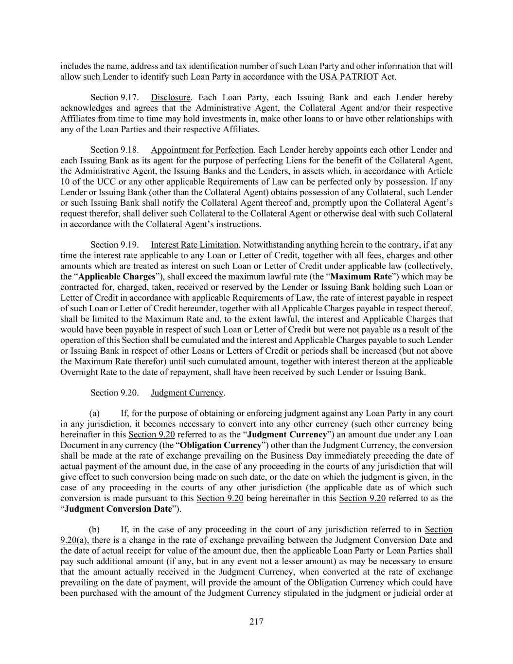 217 includes the name, address and tax identification number of such Loan Party and other information that will allow such Lender to identify such Loan Party in accordance with the USA PATRIOT Act. Section 9.17. Disclosure. Each Loan Party, each Issuing Bank and each Lender hereby acknowledges and agrees that the Administrative Agent, the Collateral Agent and/or their respective Affiliates from time to time may hold investments in, make other loans to or have other relationships with any of the Loan Parties and their respective Affiliates. Section 9.18. Appointment for Perfection. Each Lender hereby appoints each other Lender and each Issuing Bank as its agent for the purpose of perfecting Liens for the benefit of the Collateral Agent, the Administrative Agent, the Issuing Banks and the Lenders, in assets which, in accordance with Article 10 of the UCC or any other applicable Requirements of Law can be perfected only by possession. If any Lender or Issuing Bank (other than the Collateral Agent) obtains possession of any Collateral, such Lender or such Issuing Bank shall notify the Collateral Agent thereof and, promptly upon the Collateral Agent’s request therefor, shall deliver such Collateral to the Collateral Agent or otherwise deal with such Collateral in accordance with the Collateral Agent’s instructions. Section 9.19. Interest Rate Limitation. Notwithstanding anything herein to the contrary, if at any time the interest rate applicable to any Loan or Letter of Credit, together with all fees, charges and other amounts which are treated as interest on such Loan or Letter of Credit under applicable law (collectively, the “Applicable Charges”), shall exceed the maximum lawful rate (the “Maximum Rate”) which may be contracted for, charged, taken, received or reserved by the Lender or Issuing Bank holding such Loan or Letter of Credit in accordance with applicable Requirements of Law, the rate of interest payable in respect of such Loan or Letter of Credit hereunder, together with all Applicable Charges payable in respect thereof, shall be limited to the Maximum Rate and, to the extent lawful, the interest and Applicable Charges that would have been payable in respect of such Loan or Letter of Credit but were not payable as a result of the operation of this Section shall be cumulated and the interest and Applicable Charges payable to such Lender or Issuing Bank in respect of other Loans or Letters of Credit or periods shall be increased (but not above the Maximum Rate therefor) until such cumulated amount, together with interest thereon at the applicable Overnight Rate to the date of repayment, shall have been received by such Lender or Issuing Bank. Section 9.20. Judgment Currency. (a) If, for the purpose of obtaining or enforcing judgment against any Loan Party in any court in any jurisdiction, it becomes necessary to convert into any other currency (such other currency being hereinafter in this Section 9.20 referred to as the “Judgment Currency”) an amount due under any Loan Document in any currency (the “Obligation Currency”) other than the Judgment Currency, the conversion shall be made at the rate of exchange prevailing on the Business Day immediately preceding the date of actual payment of the amount due, in the case of any proceeding in the courts of any jurisdiction that will give effect to such conversion being made on such date, or the date on which the judgment is given, in the case of any proceeding in the courts of any other jurisdiction (the applicable date as of which such conversion is made pursuant to this Section 9.20 being hereinafter in this Section 9.20 referred to as the “Judgment Conversion Date”). (b) If, in the case of any proceeding in the court of any jurisdiction referred to in Section 9.20(a), there is a change in the rate of exchange prevailing between the Judgment Conversion Date and the date of actual receipt for value of the amount due, then the applicable Loan Party or Loan Parties shall pay such additional amount (if any, but in any event not a lesser amount) as may be necessary to ensure that the amount actually received in the Judgment Currency, when converted at the rate of exchange prevailing on the date of payment, will provide the amount of the Obligation Currency which could have been purchased with the amount of the Judgment Currency stipulated in the judgment or judicial order at