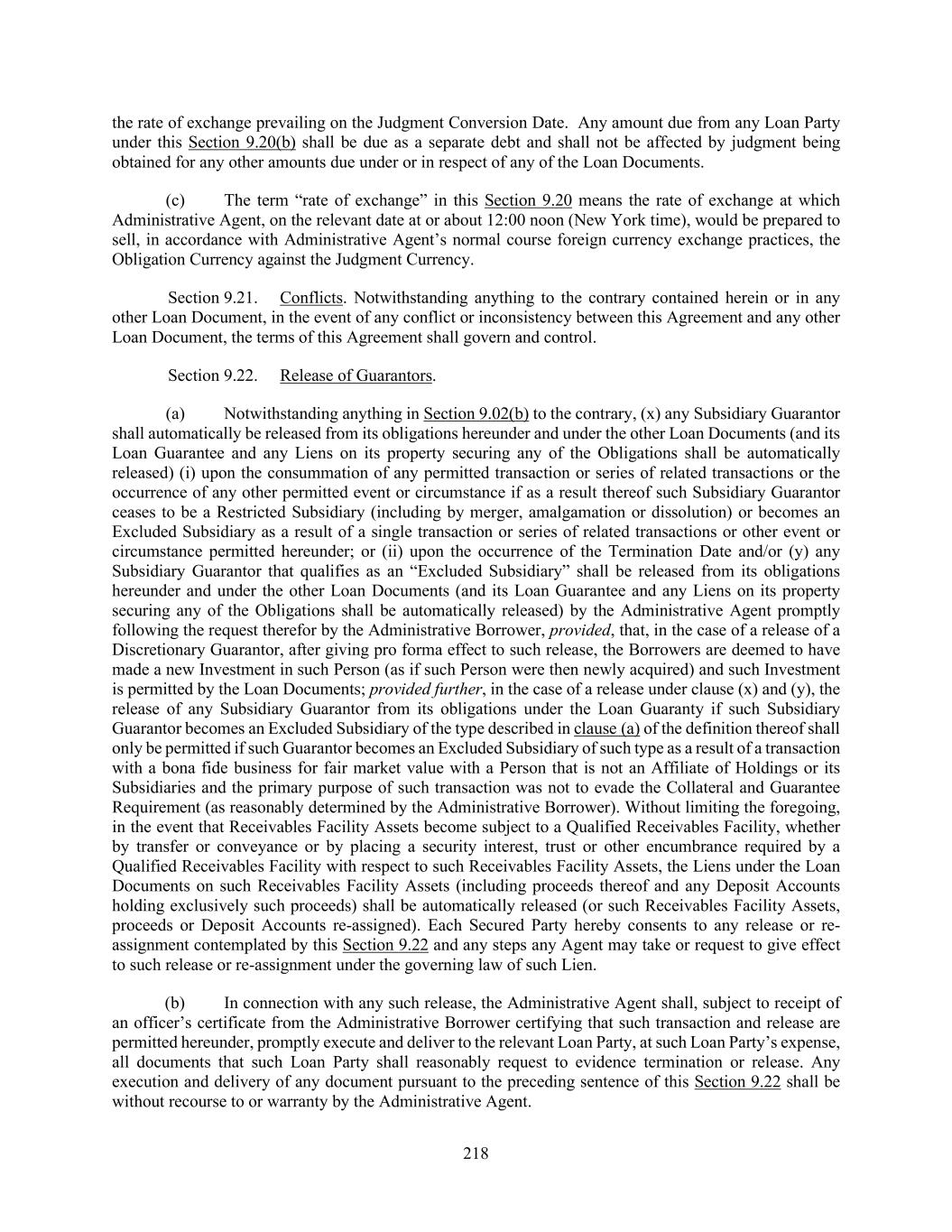 218 the rate of exchange prevailing on the Judgment Conversion Date. Any amount due from any Loan Party under this Section 9.20(b) shall be due as a separate debt and shall not be affected by judgment being obtained for any other amounts due under or in respect of any of the Loan Documents. (c) The term “rate of exchange” in this Section 9.20 means the rate of exchange at which Administrative Agent, on the relevant date at or about 12:00 noon (New York time), would be prepared to sell, in accordance with Administrative Agent’s normal course foreign currency exchange practices, the Obligation Currency against the Judgment Currency. Section 9.21. Conflicts. Notwithstanding anything to the contrary contained herein or in any other Loan Document, in the event of any conflict or inconsistency between this Agreement and any other Loan Document, the terms of this Agreement shall govern and control. Section 9.22. Release of Guarantors. (a) Notwithstanding anything in Section 9.02(b) to the contrary, (x) any Subsidiary Guarantor shall automatically be released from its obligations hereunder and under the other Loan Documents (and its Loan Guarantee and any Liens on its property securing any of the Obligations shall be automatically released) (i) upon the consummation of any permitted transaction or series of related transactions or the occurrence of any other permitted event or circumstance if as a result thereof such Subsidiary Guarantor ceases to be a Restricted Subsidiary (including by merger, amalgamation or dissolution) or becomes an Excluded Subsidiary as a result of a single transaction or series of related transactions or other event or circumstance permitted hereunder; or (ii) upon the occurrence of the Termination Date and/or (y) any Subsidiary Guarantor that qualifies as an “Excluded Subsidiary” shall be released from its obligations hereunder and under the other Loan Documents (and its Loan Guarantee and any Liens on its property securing any of the Obligations shall be automatically released) by the Administrative Agent promptly following the request therefor by the Administrative Borrower, provided, that, in the case of a release of a Discretionary Guarantor, after giving pro forma effect to such release, the Borrowers are deemed to have made a new Investment in such Person (as if such Person were then newly acquired) and such Investment is permitted by the Loan Documents; provided further, in the case of a release under clause (x) and (y), the release of any Subsidiary Guarantor from its obligations under the Loan Guaranty if such Subsidiary Guarantor becomes an Excluded Subsidiary of the type described in clause (a) of the definition thereof shall only be permitted if such Guarantor becomes an Excluded Subsidiary of such type as a result of a transaction with a bona fide business for fair market value with a Person that is not an Affiliate of Holdings or its Subsidiaries and the primary purpose of such transaction was not to evade the Collateral and Guarantee Requirement (as reasonably determined by the Administrative Borrower). Without limiting the foregoing, in the event that Receivables Facility Assets become subject to a Qualified Receivables Facility, whether by transfer or conveyance or by placing a security interest, trust or other encumbrance required by a Qualified Receivables Facility with respect to such Receivables Facility Assets, the Liens under the Loan Documents on such Receivables Facility Assets (including proceeds thereof and any Deposit Accounts holding exclusively such proceeds) shall be automatically released (or such Receivables Facility Assets, proceeds or Deposit Accounts re-assigned). Each Secured Party hereby consents to any release or re- assignment contemplated by this Section 9.22 and any steps any Agent may take or request to give effect to such release or re-assignment under the governing law of such Lien. (b) In connection with any such release, the Administrative Agent shall, subject to receipt of an officer’s certificate from the Administrative Borrower certifying that such transaction and release are permitted hereunder, promptly execute and deliver to the relevant Loan Party, at such Loan Party’s expense, all documents that such Loan Party shall reasonably request to evidence termination or release. Any execution and delivery of any document pursuant to the preceding sentence of this Section 9.22 shall be without recourse to or warranty by the Administrative Agent.