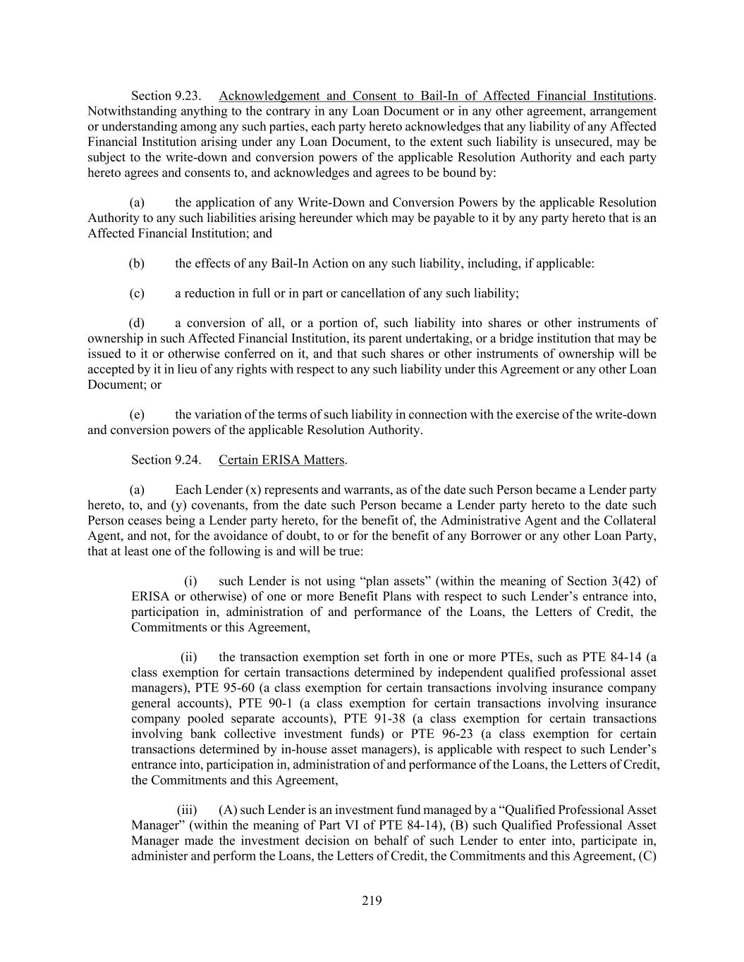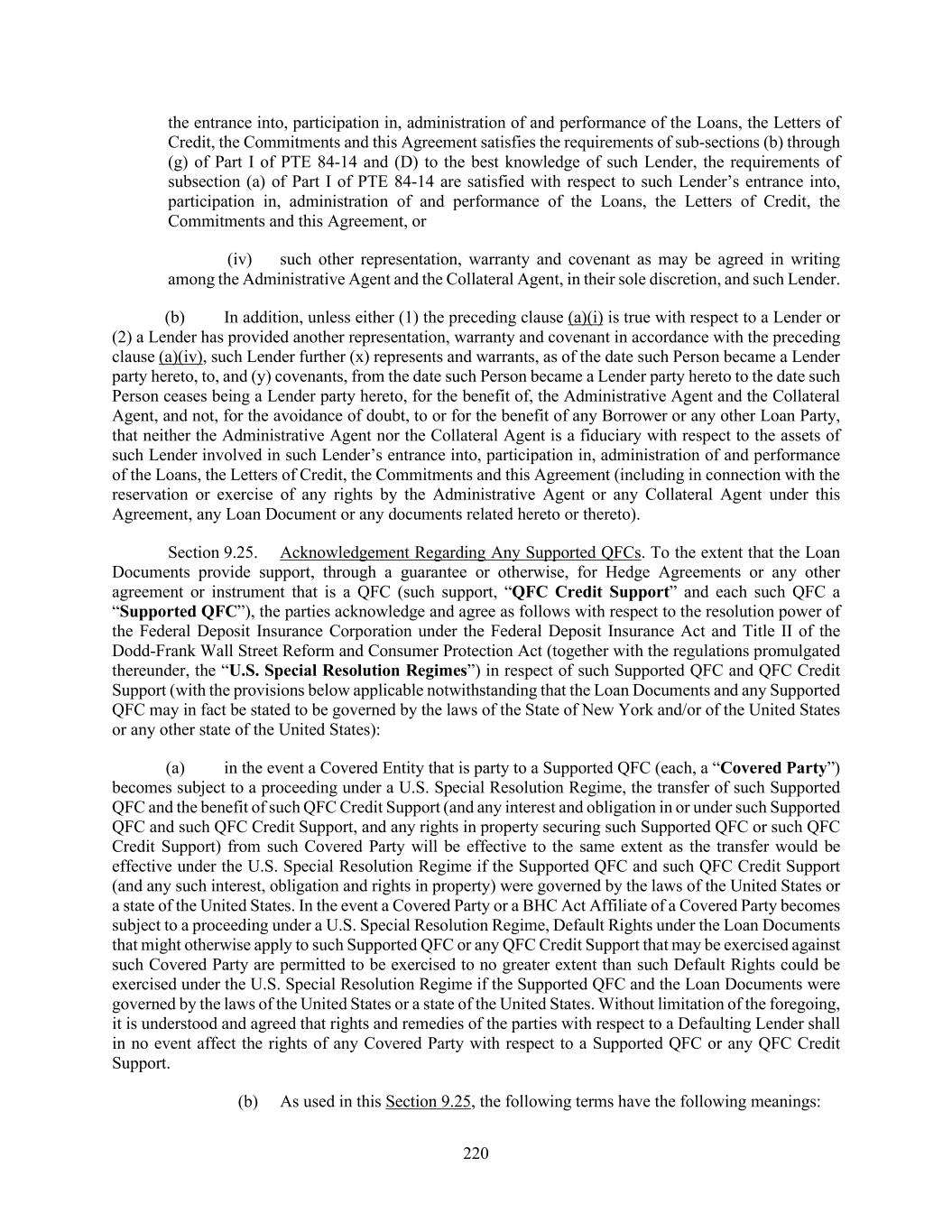 220 the entrance into, participation in, administration of and performance of the Loans, the Letters of Credit, the Commitments and this Agreement satisfies the requirements of sub-sections (b) through (g) of Part I of PTE 84-14 and (D) to the best knowledge of such Lender, the requirements of subsection (a) of Part I of PTE 84-14 are satisfied with respect to such Lender’s entrance into, participation in, administration of and performance of the Loans, the Letters of Credit, the Commitments and this Agreement, or (iv) such other representation, warranty and covenant as may be agreed in writing among the Administrative Agent and the Collateral Agent, in their sole discretion, and such Lender. (b) In addition, unless either (1) the preceding clause (a)(i) is true with respect to a Lender or (2) a Lender has provided another representation, warranty and covenant in accordance with the preceding clause (a)(iv), such Lender further (x) represents and warrants, as of the date such Person became a Lender party hereto, to, and (y) covenants, from the date such Person became a Lender party hereto to the date such Person ceases being a Lender party hereto, for the benefit of, the Administrative Agent and the Collateral Agent, and not, for the avoidance of doubt, to or for the benefit of any Borrower or any other Loan Party, that neither the Administrative Agent nor the Collateral Agent is a fiduciary with respect to the assets of such Lender involved in such Lender’s entrance into, participation in, administration of and performance of the Loans, the Letters of Credit, the Commitments and this Agreement (including in connection with the reservation or exercise of any rights by the Administrative Agent or any Collateral Agent under this Agreement, any Loan Document or any documents related hereto or thereto). Section 9.25. Acknowledgement Regarding Any Supported QFCs. To the extent that the Loan Documents provide support, through a guarantee or otherwise, for Hedge Agreements or any other agreement or instrument that is a QFC (such support, “QFC Credit Support” and each such QFC a “Supported QFC”), the parties acknowledge and agree as follows with respect to the resolution power of the Federal Deposit Insurance Corporation under the Federal Deposit Insurance Act and Title II of the Dodd-Frank Wall Street Reform and Consumer Protection Act (together with the regulations promulgated thereunder, the “U.S. Special Resolution Regimes”) in respect of such Supported QFC and QFC Credit Support (with the provisions below applicable notwithstanding that the Loan Documents and any Supported QFC may in fact be stated to be governed by the laws of the State of New York and/or of the United States or any other state of the United States): (a) in the event a Covered Entity that is party to a Supported QFC (each, a “Covered Party”) becomes subject to a proceeding under a U.S. Special Resolution Regime, the transfer of such Supported QFC and the benefit of such QFC Credit Support (and any interest and obligation in or under such Supported QFC and such QFC Credit Support, and any rights in property securing such Supported QFC or such QFC Credit Support) from such Covered Party will be effective to the same extent as the transfer would be effective under the U.S. Special Resolution Regime if the Supported QFC and such QFC Credit Support (and any such interest, obligation and rights in property) were governed by the laws of the United States or a state of the United States. In the event a Covered Party or a BHC Act Affiliate of a Covered Party becomes subject to a proceeding under a U.S. Special Resolution Regime, Default Rights under the Loan Documents that might otherwise apply to such Supported QFC or any QFC Credit Support that may be exercised against such Covered Party are permitted to be exercised to no greater extent than such Default Rights could be exercised under the U.S. Special Resolution Regime if the Supported QFC and the Loan Documents were governed by the laws of the United States or a state of the United States. Without limitation of the foregoing, it is understood and agreed that rights and remedies of the parties with respect to a Defaulting Lender shall in no event affect the rights of any Covered Party with respect to a Supported QFC or any QFC Credit Support. (b) As used in this Section 9.25, the following terms have the following meanings: